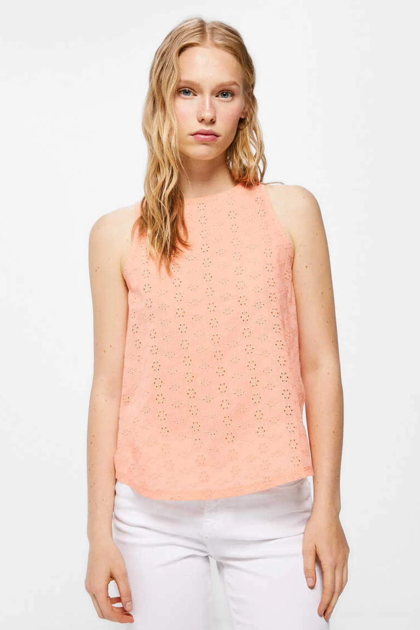 Blusa Sem Mangas, Com Gola Redonda, Abertura Em Forma De Lagrima Com Fecho De Botao Nas Costas, Detalhe De Bordado Suico Na Frente.