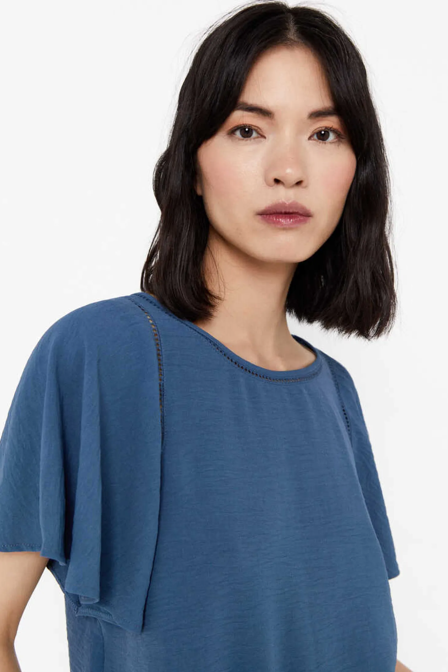– Blusa Tecido Textura Conforto – Detalhe Rendilhado – Manga Curta Com Roda – Decote Caixa