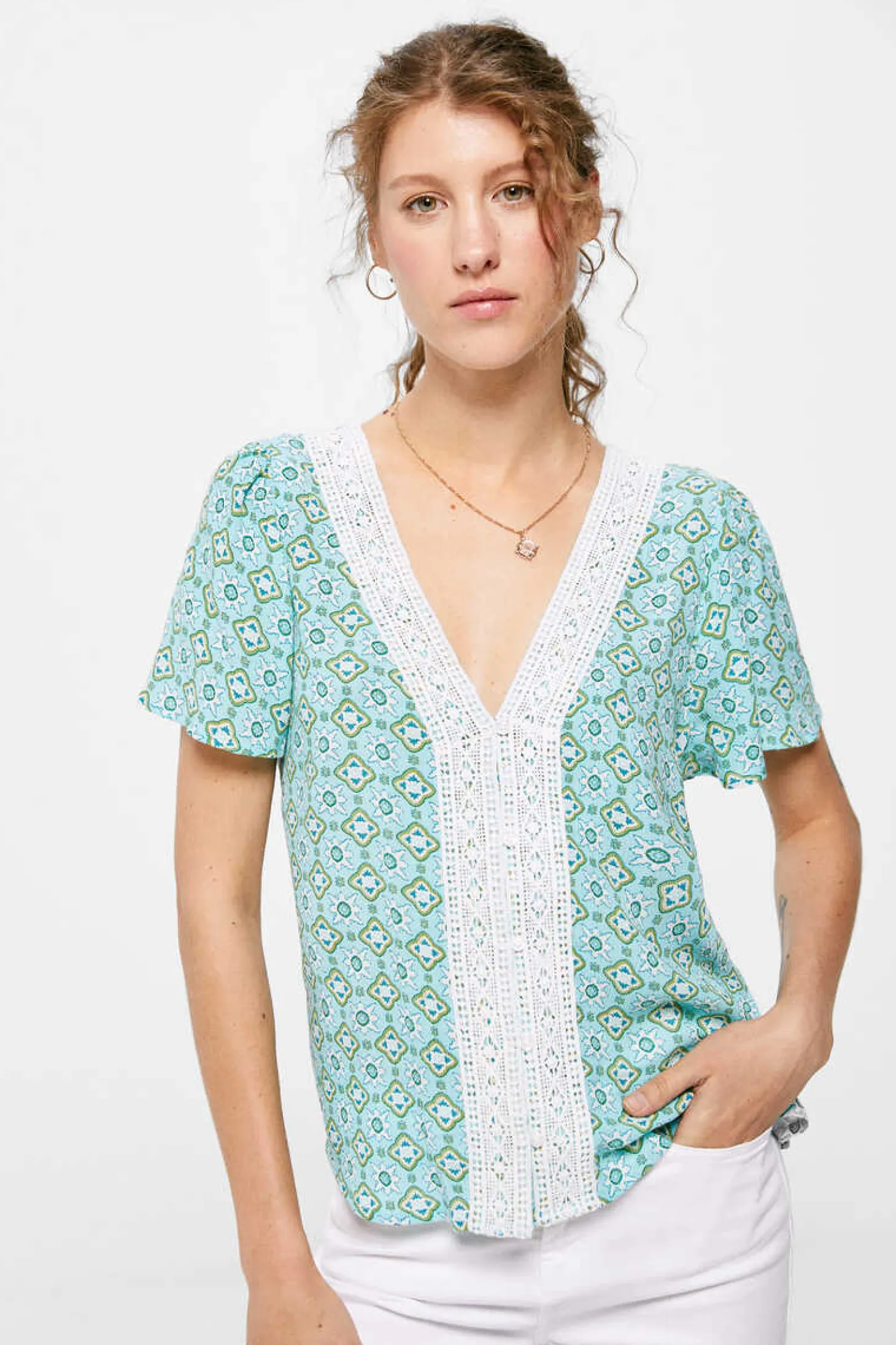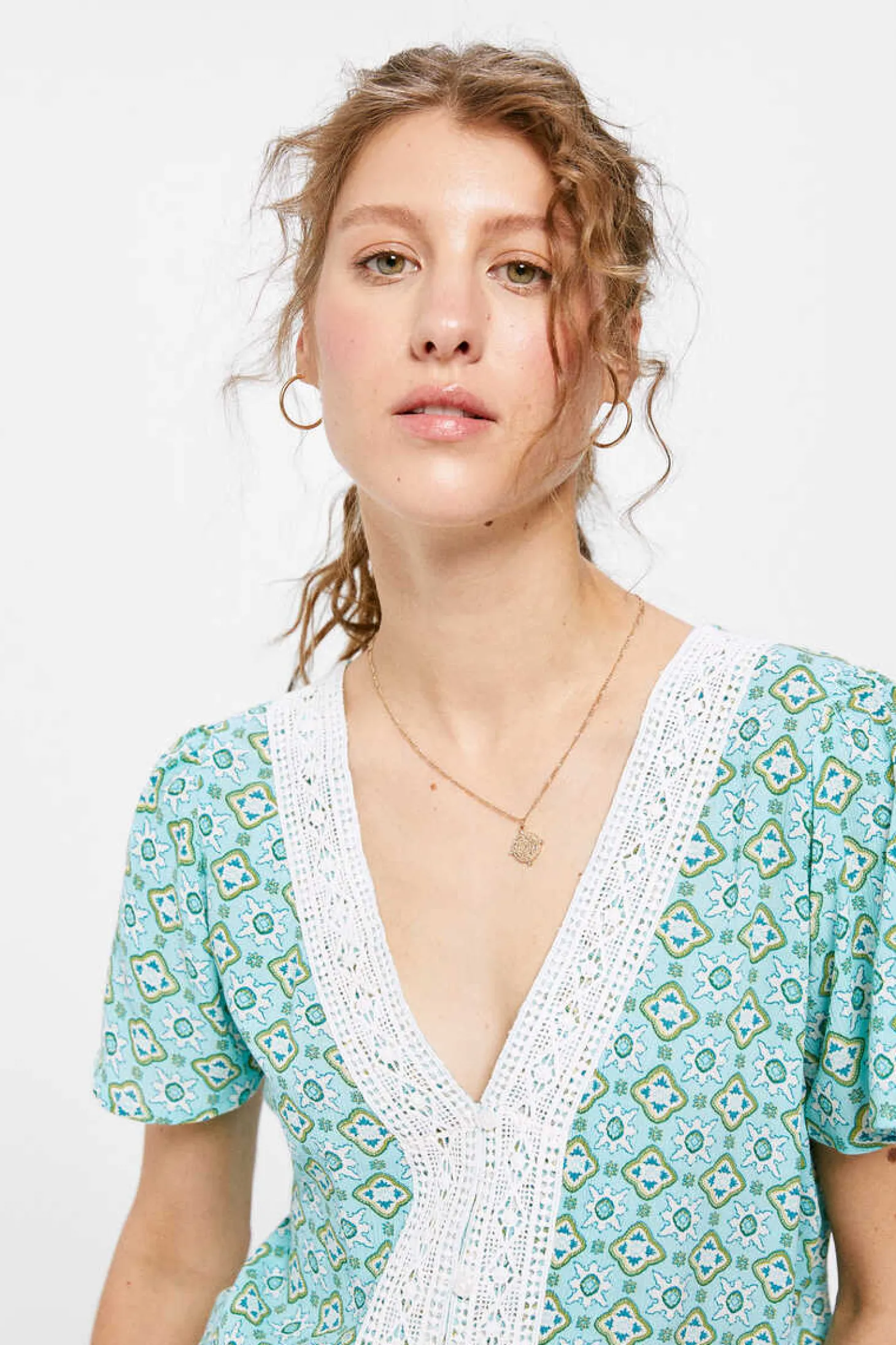 Blusa Fluida De Manga Curta Com Roda, Com Decote Em V, Com Detalhe De Peca De Crochet No Decote E Na Frente E Com Estampado.