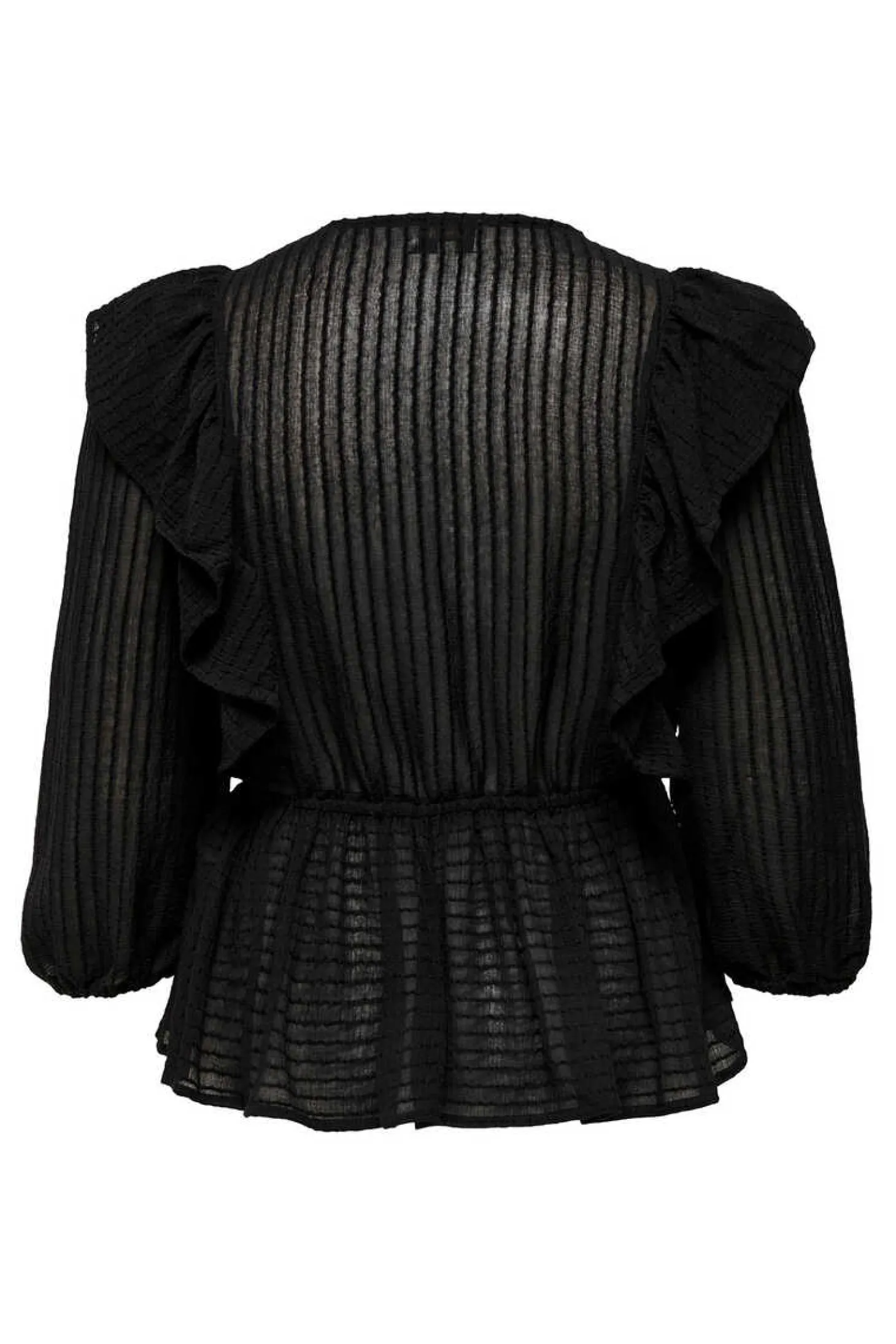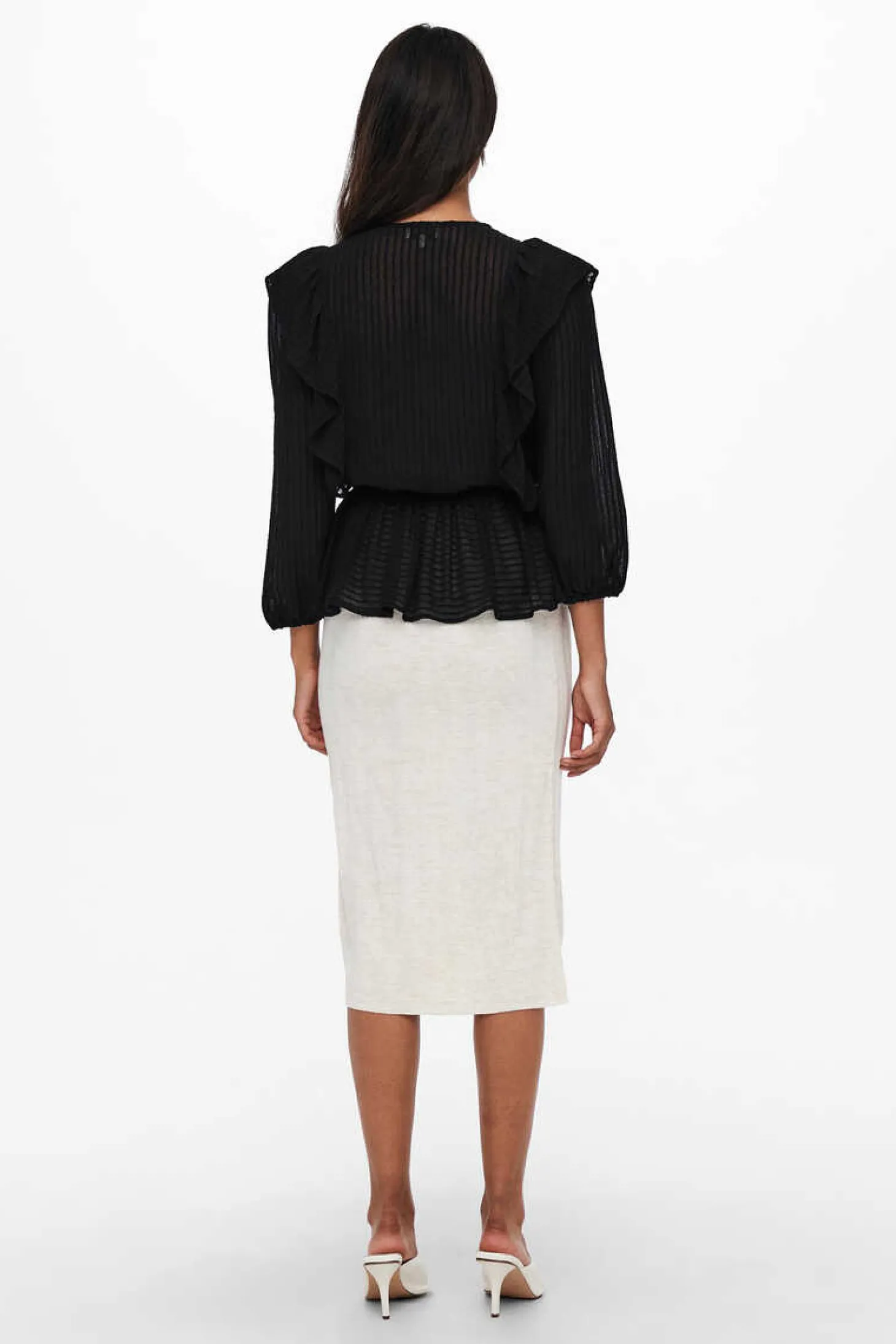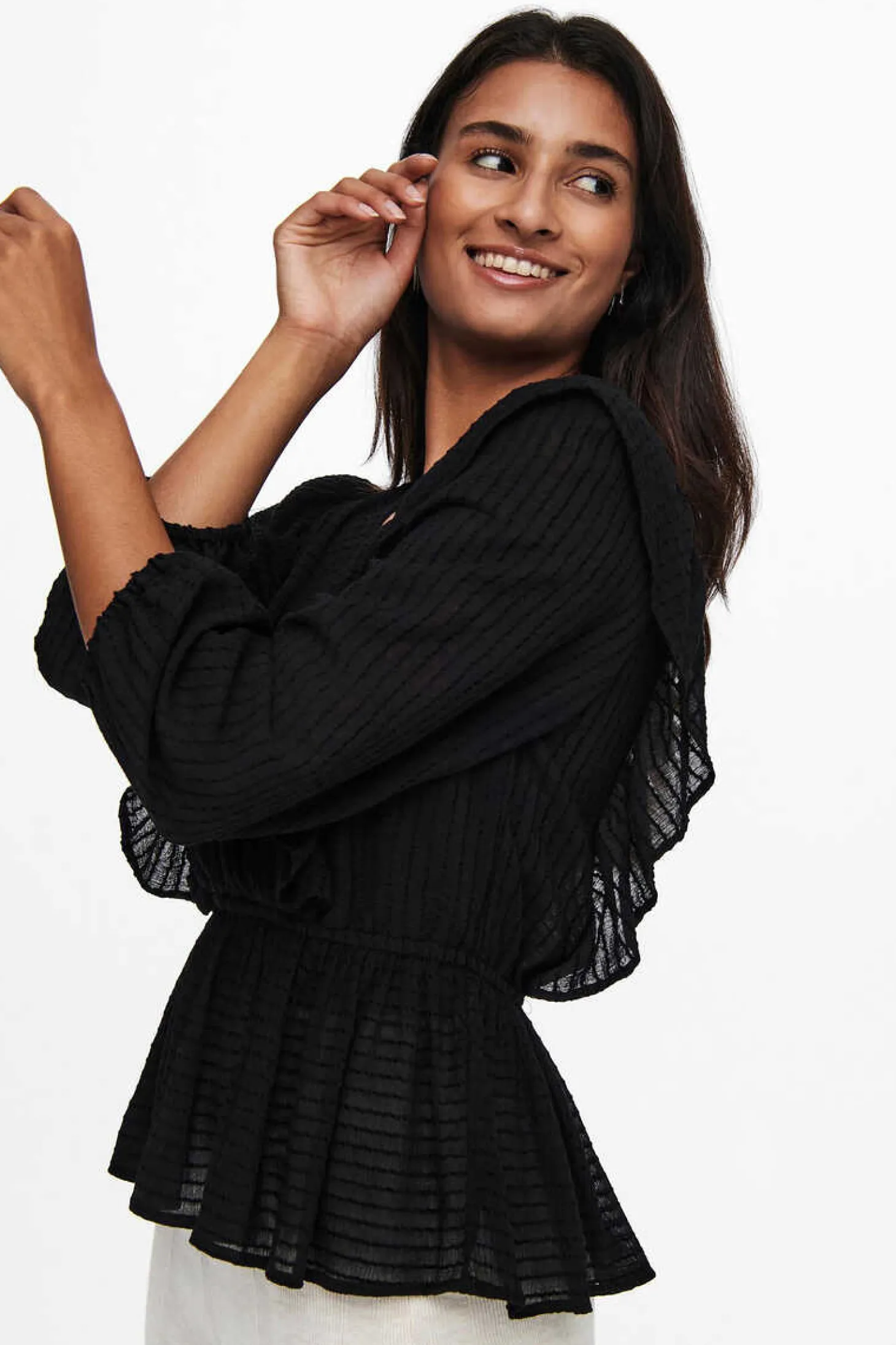 Blusa De Manga 3/4 Com Decote Em Bico Com Detalhe De Folhos Nos Ombros.