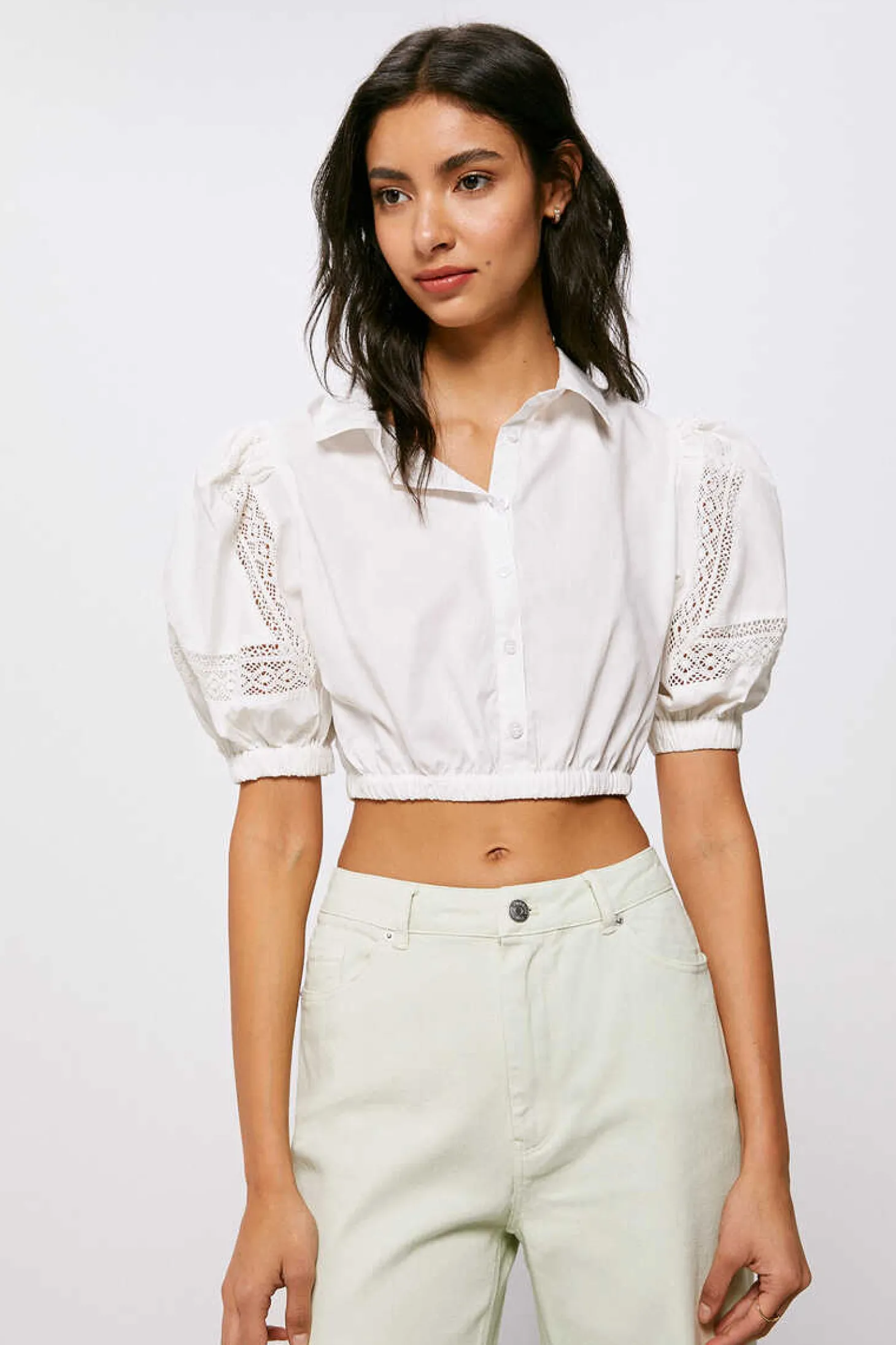 Blusa Curta De Manga Curta Com Volume, Com Detalhes De Lace Nas Mangas, Botoes Na Frente, Com Borracha Nas Mangas E Na Bainha.