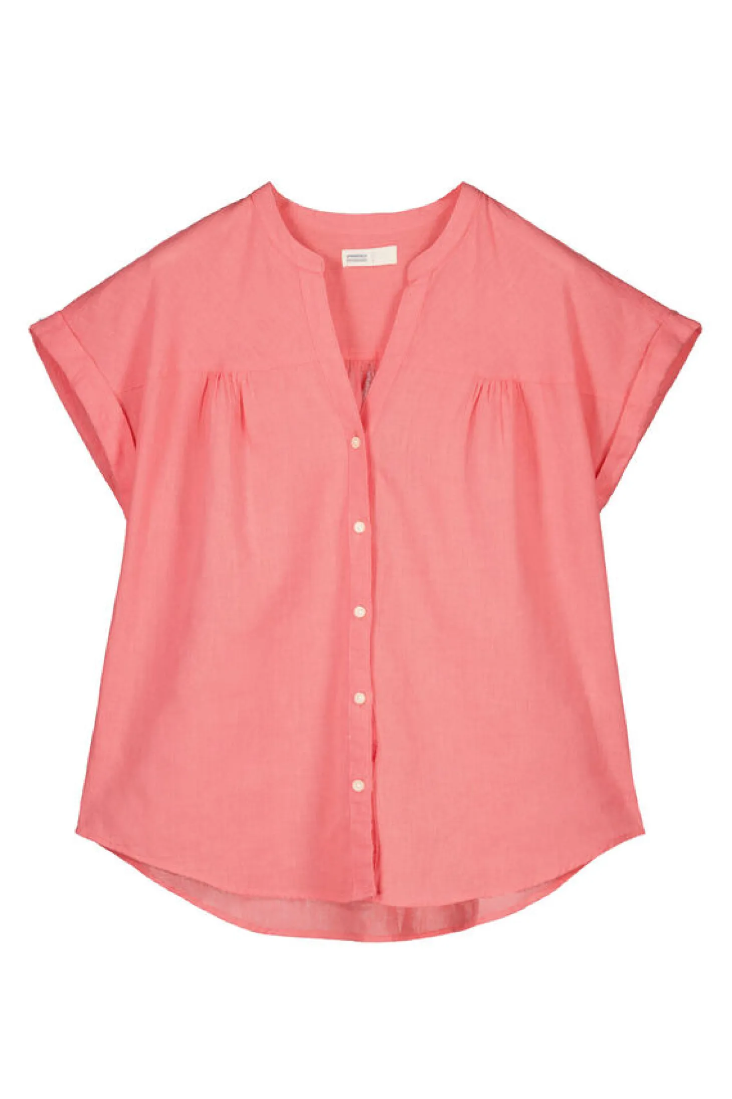 Blusa Reta De Manga Curta Com Roda, Com Gola Mao Com Abertura No Decote Em Forma De V, Costura No Cintado E Botoes Na Frente. Com Mistura De Linho E Algodao.