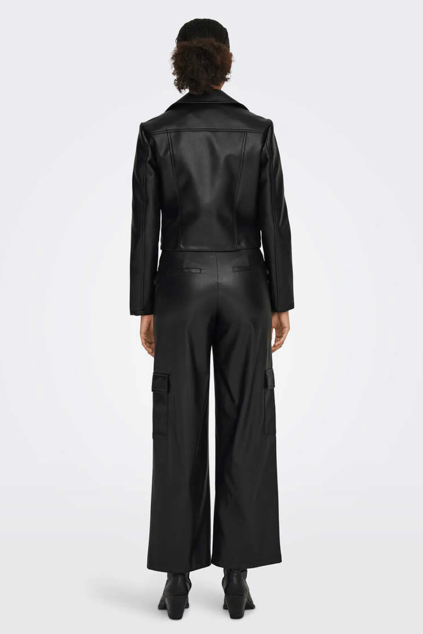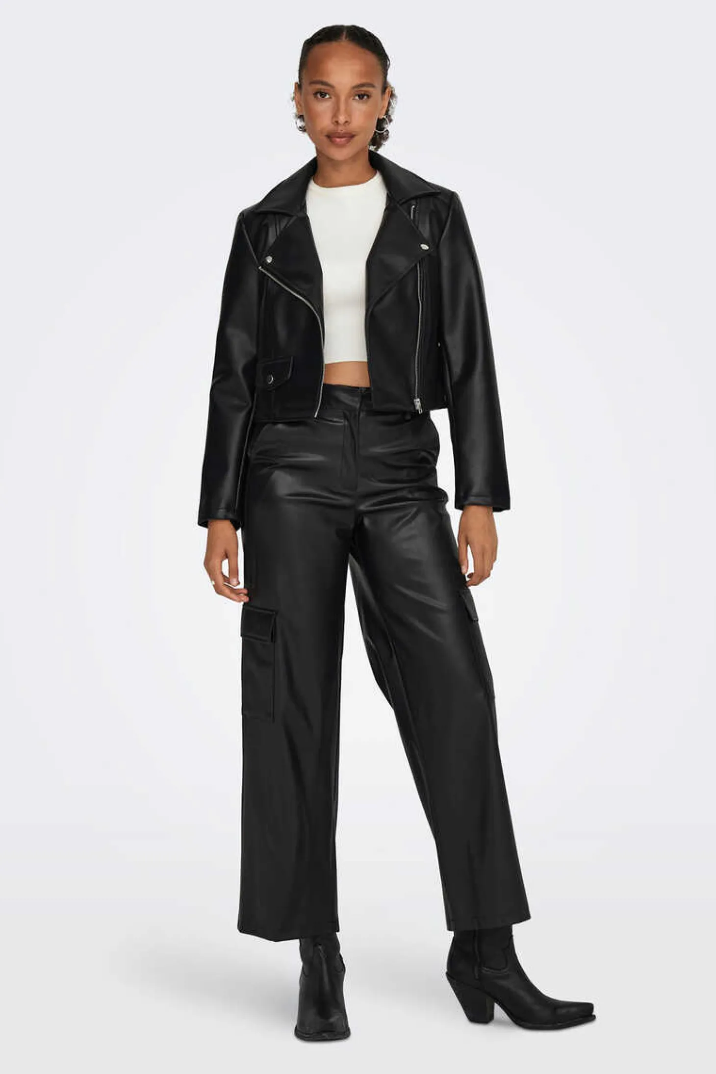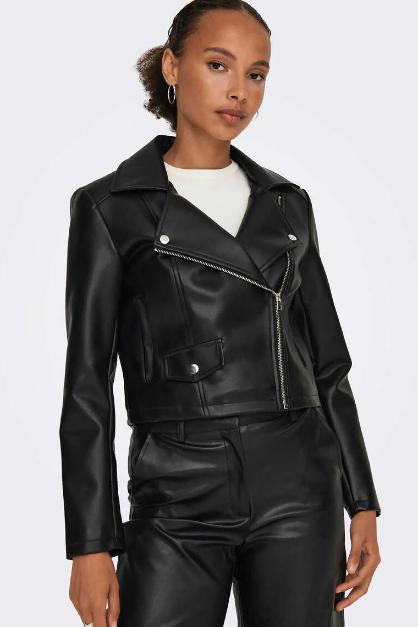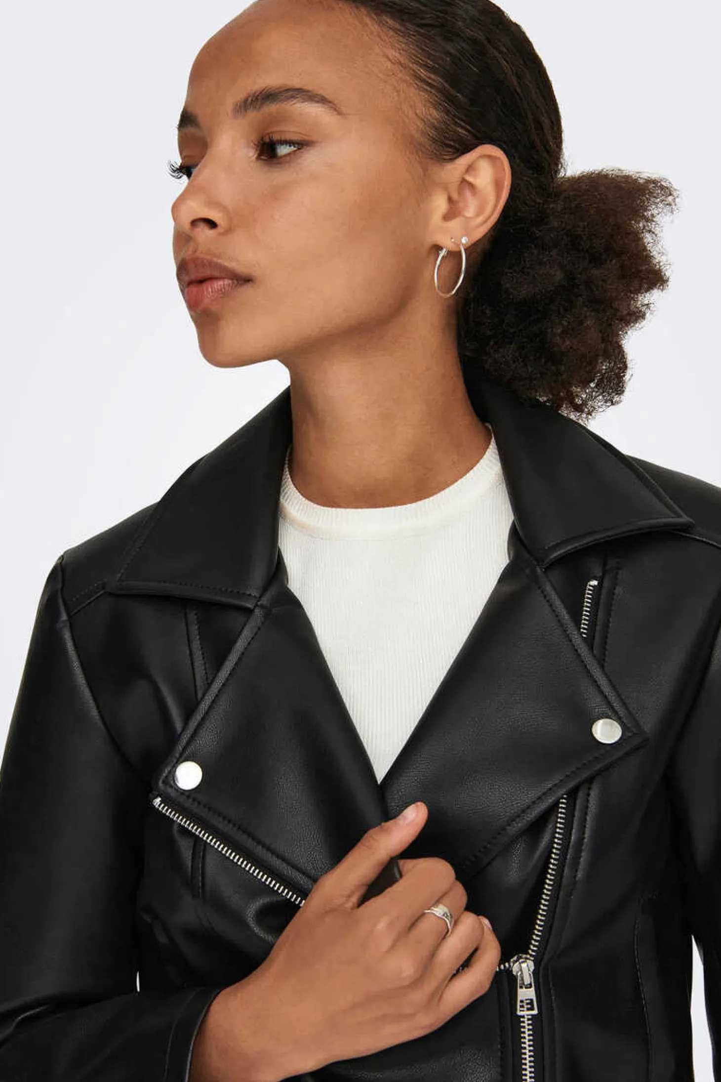 Blusao Biker Efeito Pele. Fecho-Eclair Assimetrico. Mangas Compridas E Gola Em V. Forro Interior. Falso Bolso Com Botao.