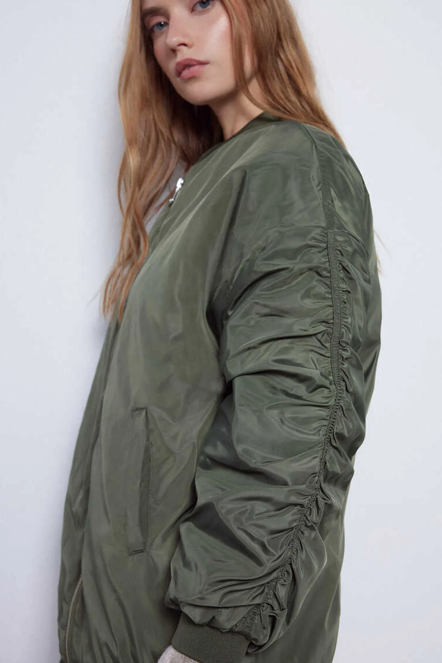 Blusao Bomber Com Silhueta Oversized. Forro Interior Em Contraste E Acolchoado. Bolsos Laterais De Carcela Com Botoes De Pressao. Fecho Central Com Fecho-Eclair … .Ver Mais
