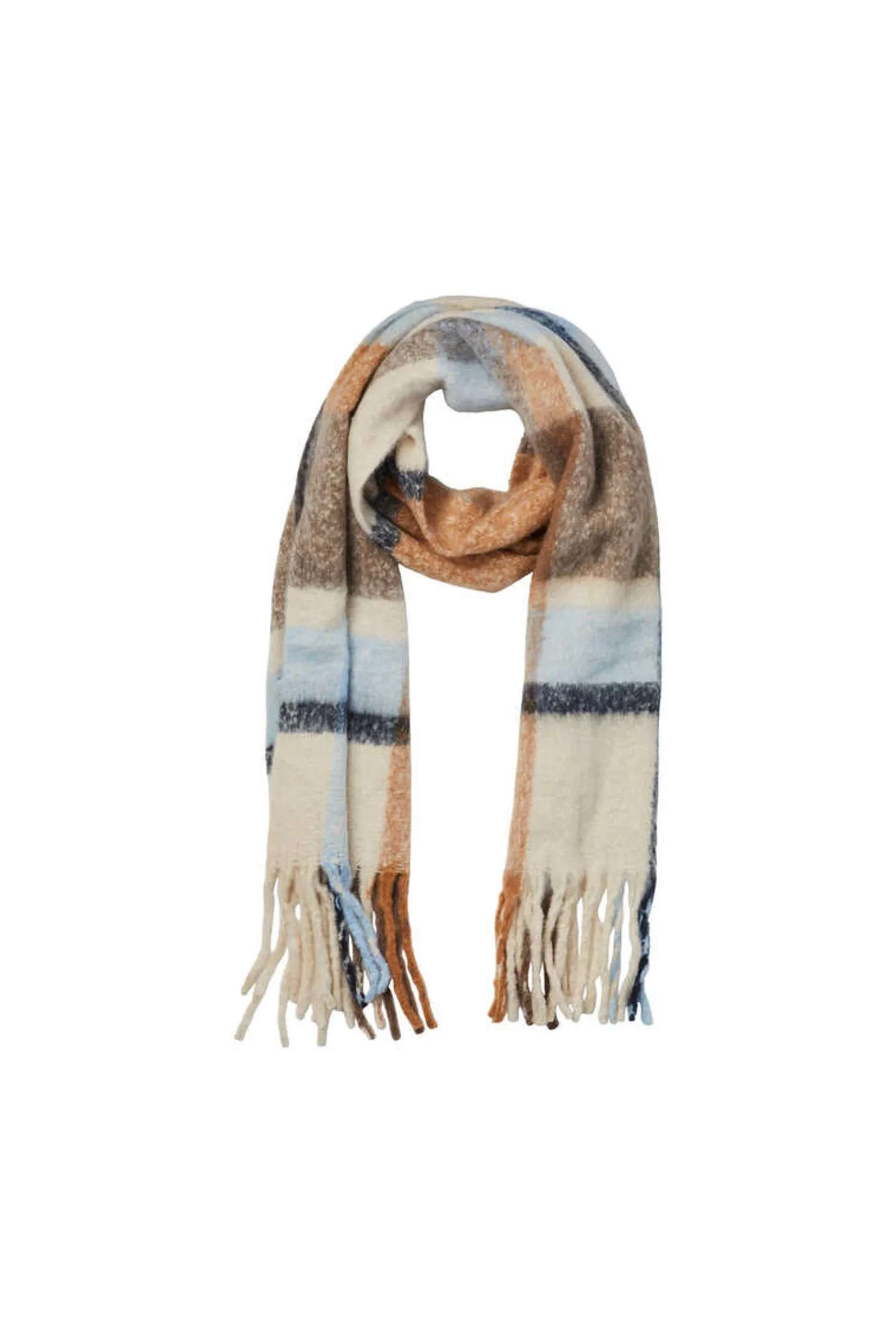 Cachecol Comprido De Quadrados E De Tato Suave, Com Franjas Nas Bordas. Confecionado Com Materiais Reciclados.
