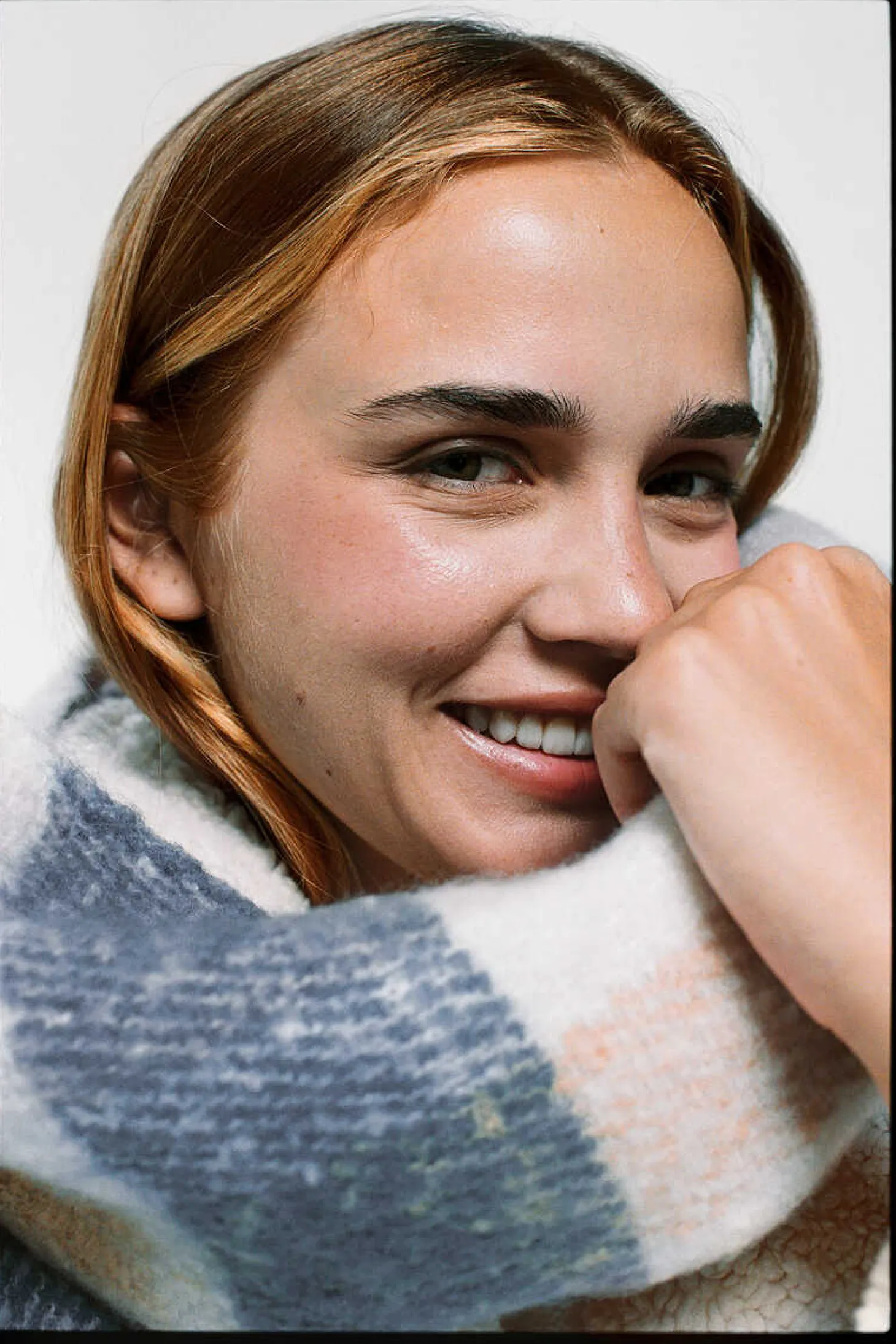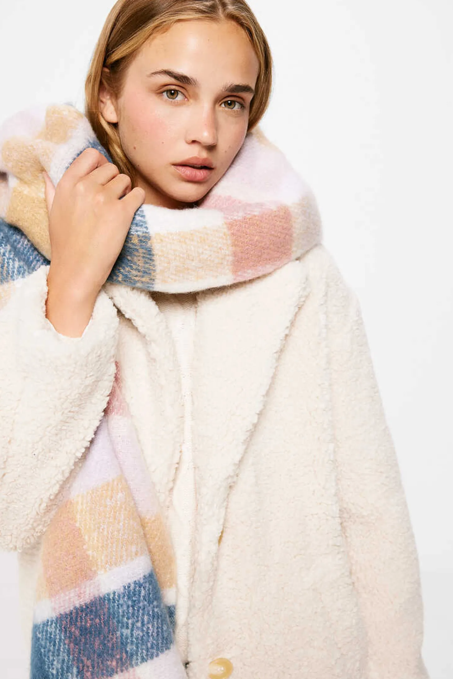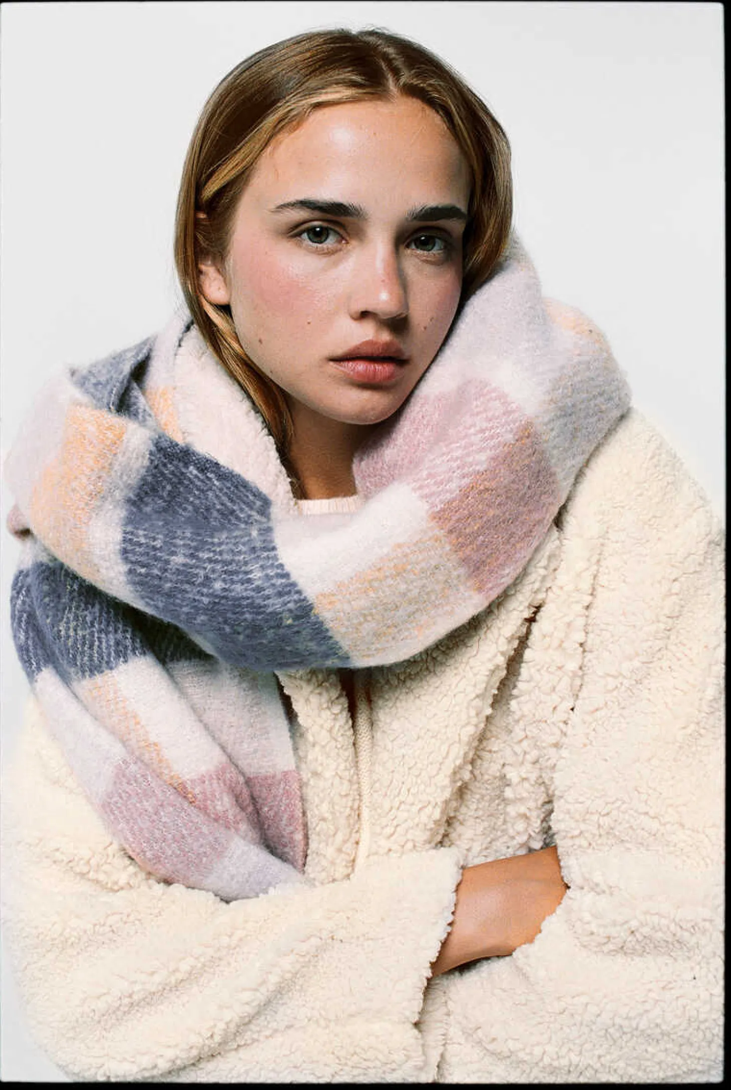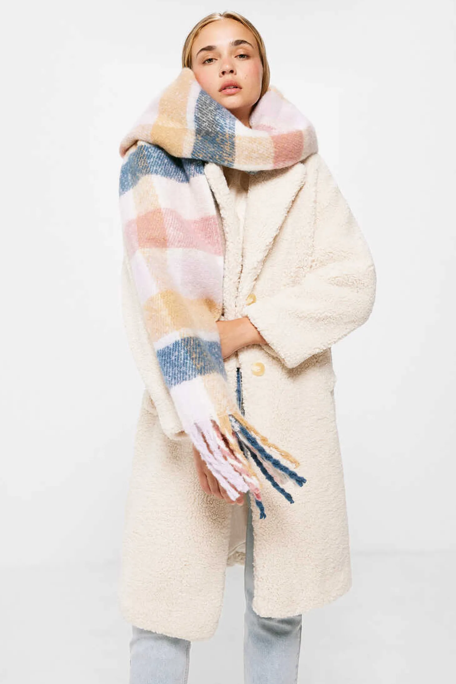 Cachecol Grosso De Quadrados De Cores Pastel, Com Detalhe De Franjas Laterais.