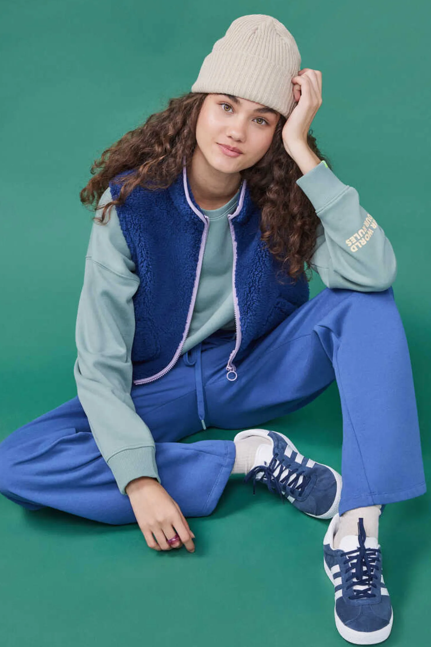 Calcas Tipo Flare Compridas De Felpa, Confecionadas Com Algodao, Com Bolsos Tipo Patch. De Cor Azul, Com Logo Posicionado No Bolso.