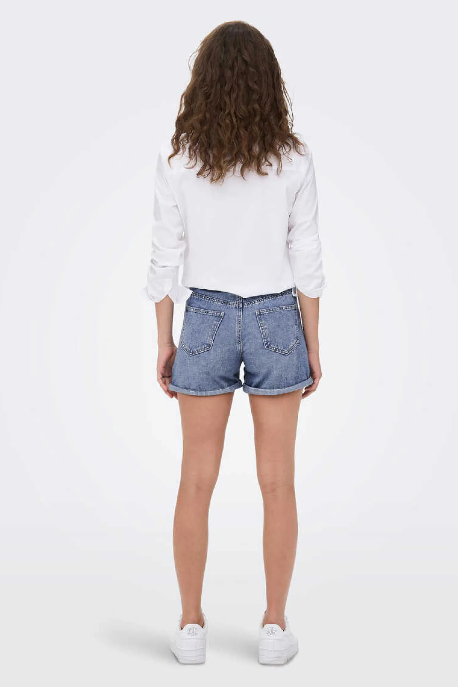 Calcas De Ganga Curtas De Cinco Bolsos Em Ganga Lavada Com Cintura Alta, Fecho Eclair Com Botao E Bainha Com Virola.