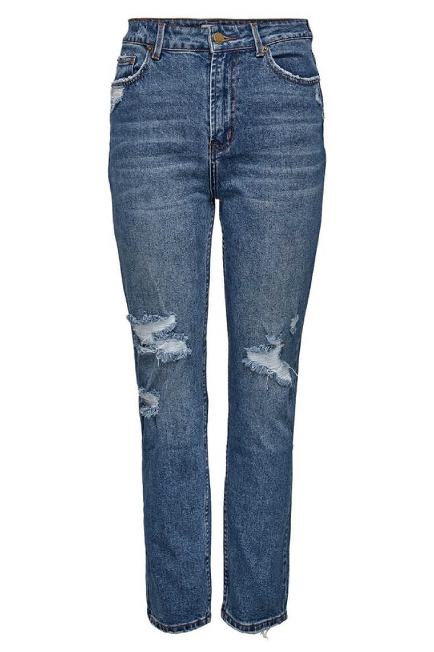 Jeans Com Corte Reto E Estilo Basico De Cintura Alta. Desenho De Quebrados A Frente E Nos Bolsos Posteriores.