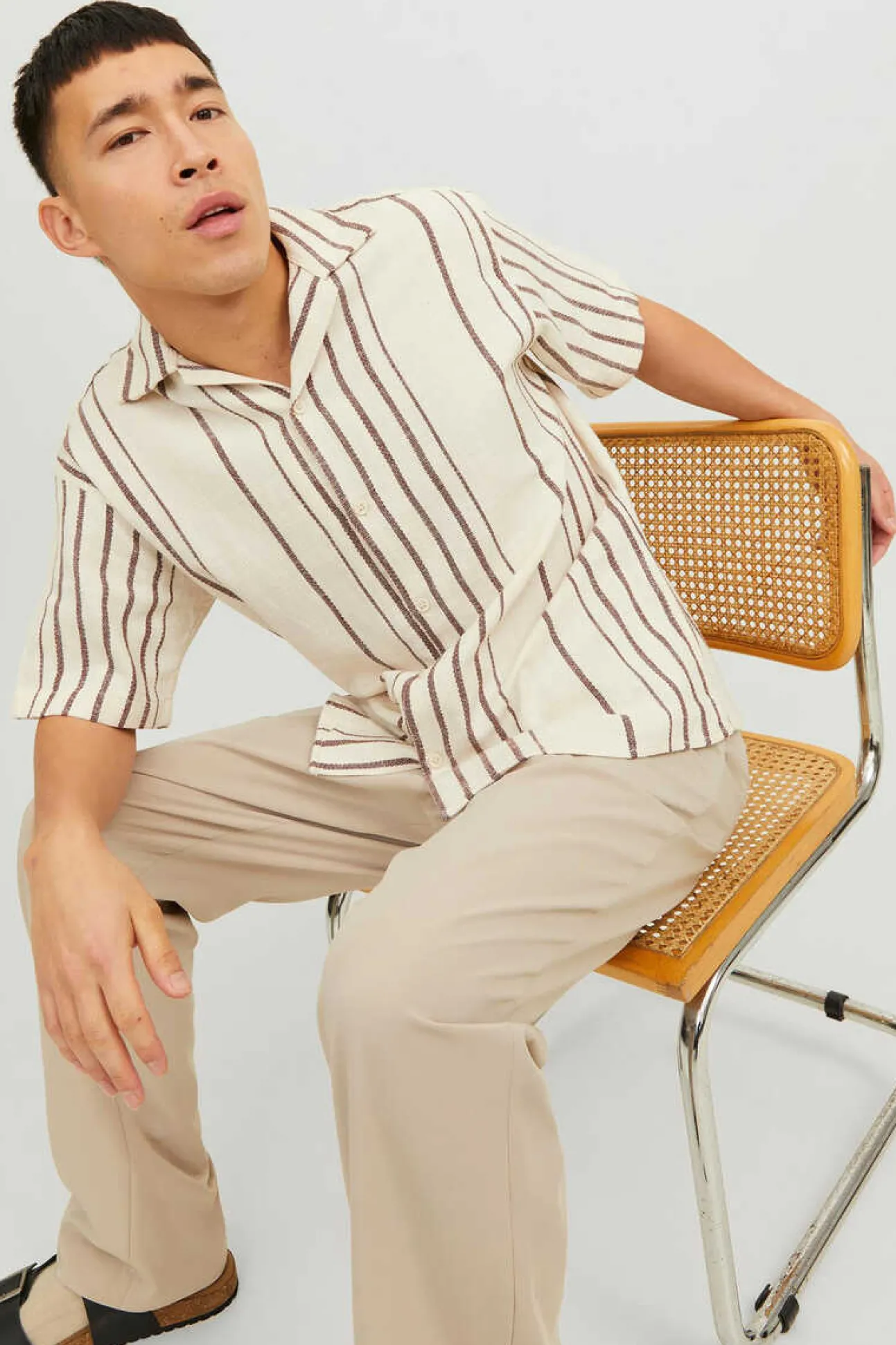Camisa De Riscas Confecionada Em Tecido De Algodao. Gola Bowling E Manga Curta. Fecho A Frente Com Abotoadura. Regular Fit.