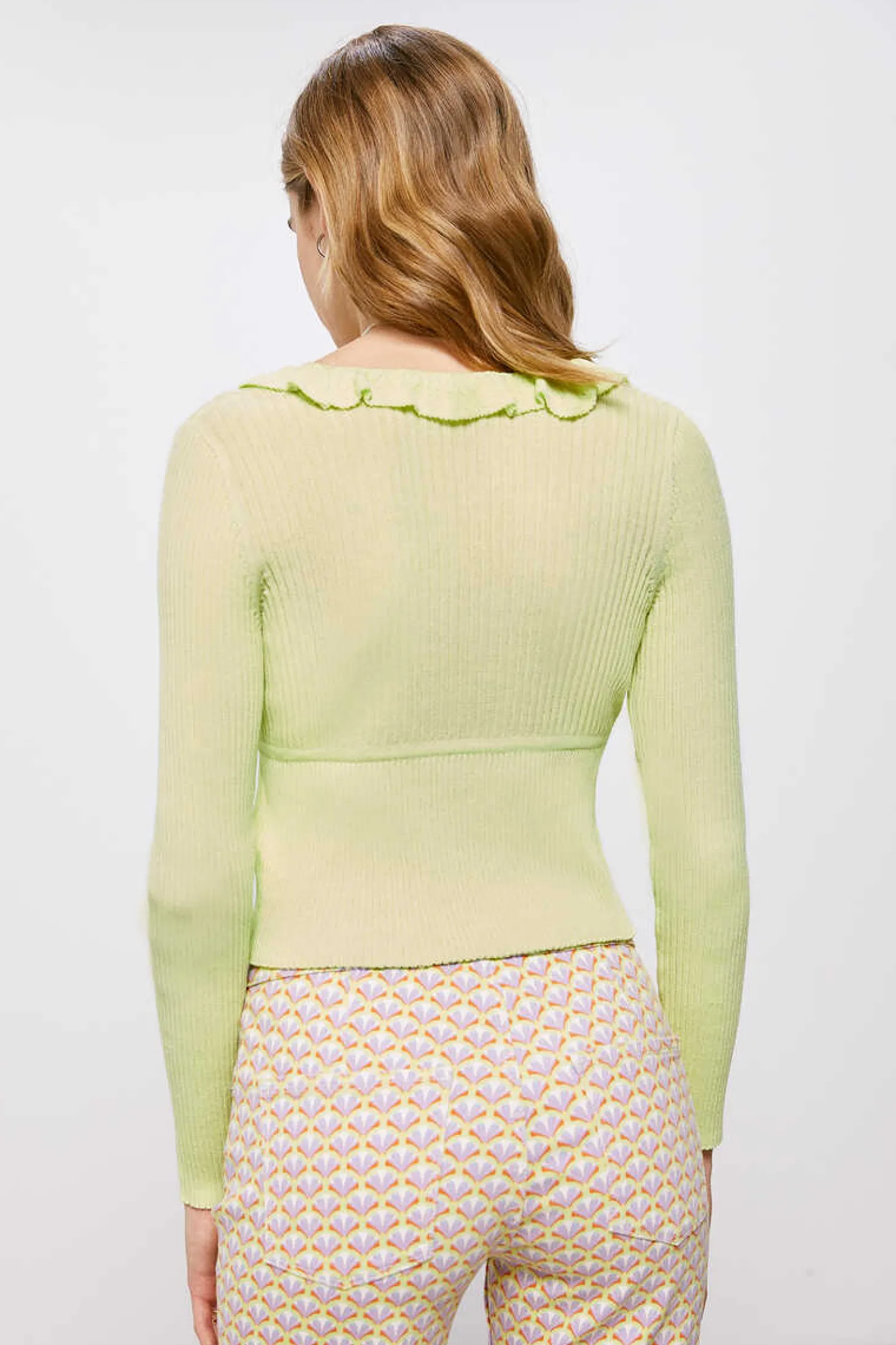 Casaco De Malha Curto, Aberto Com Decote Em V, Com Fecho De Laco, Com Folhos No Decote E Na Frente.