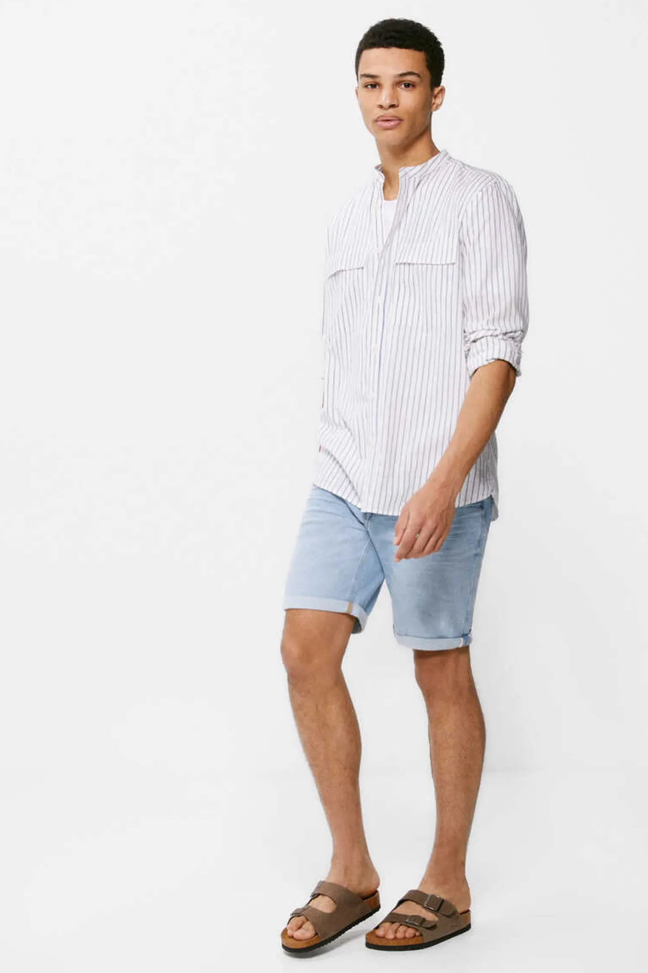 Camisa De Manga Comprida, Corte A Medida, Em Tecido De Algodao Com Efeito “Slub” As Riscas. Gola Mao. Dois Bolsos Com Carcela No Peito.