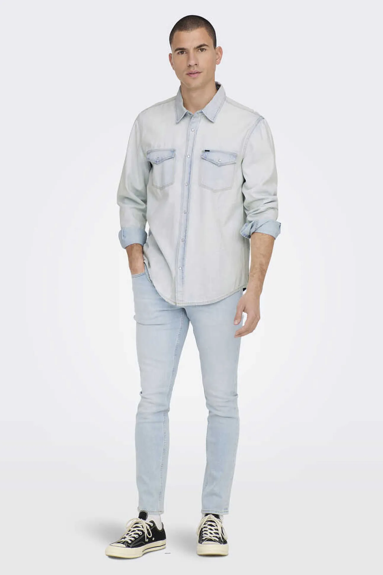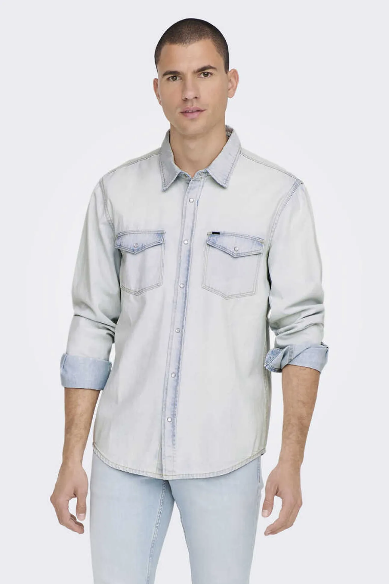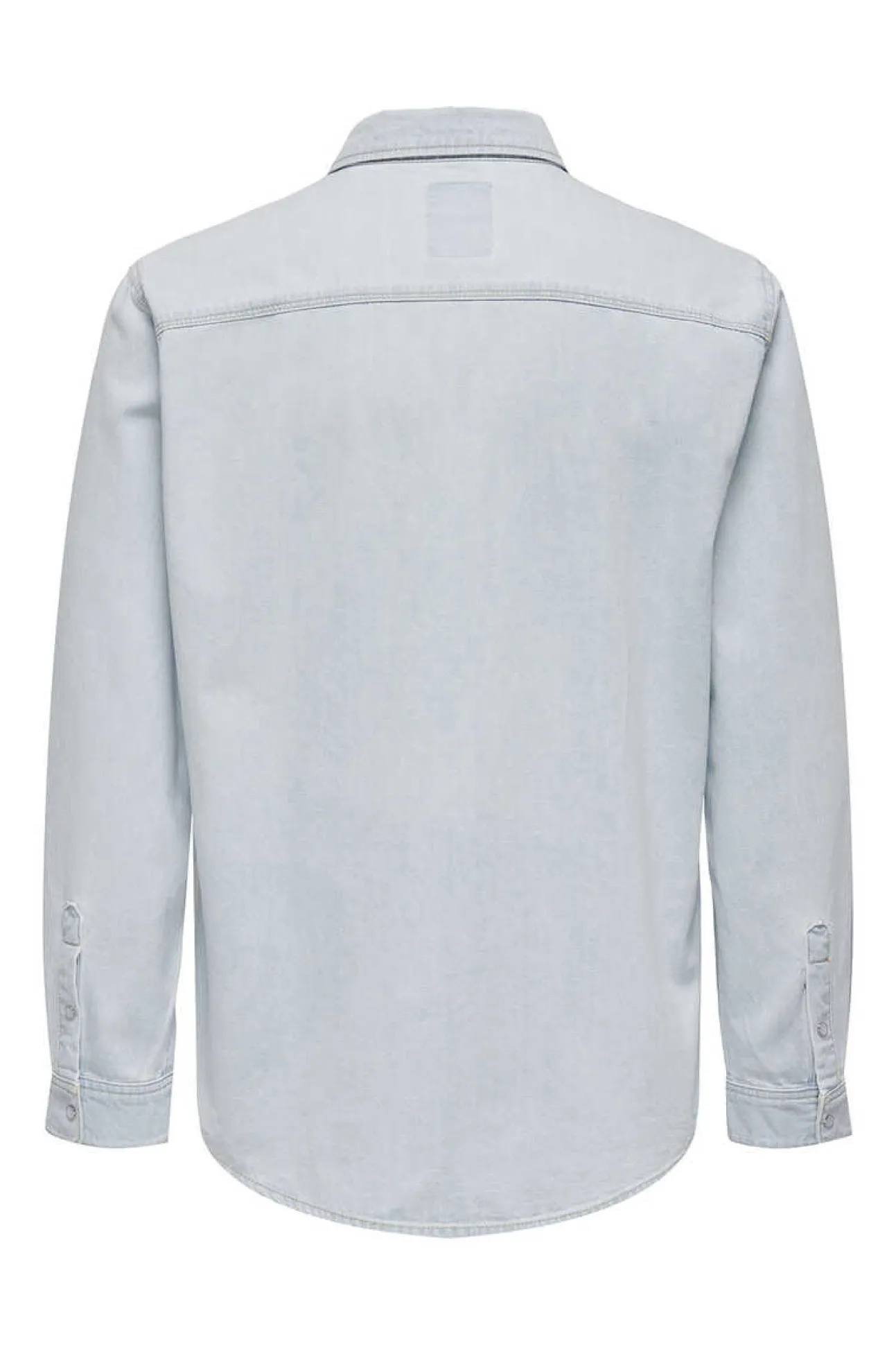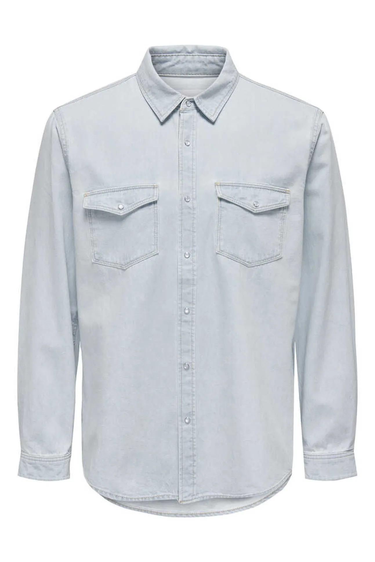Camisa De Manga Comprida Com Fecho De Botoes, Dois Bolsos Na Frente Em Denim.