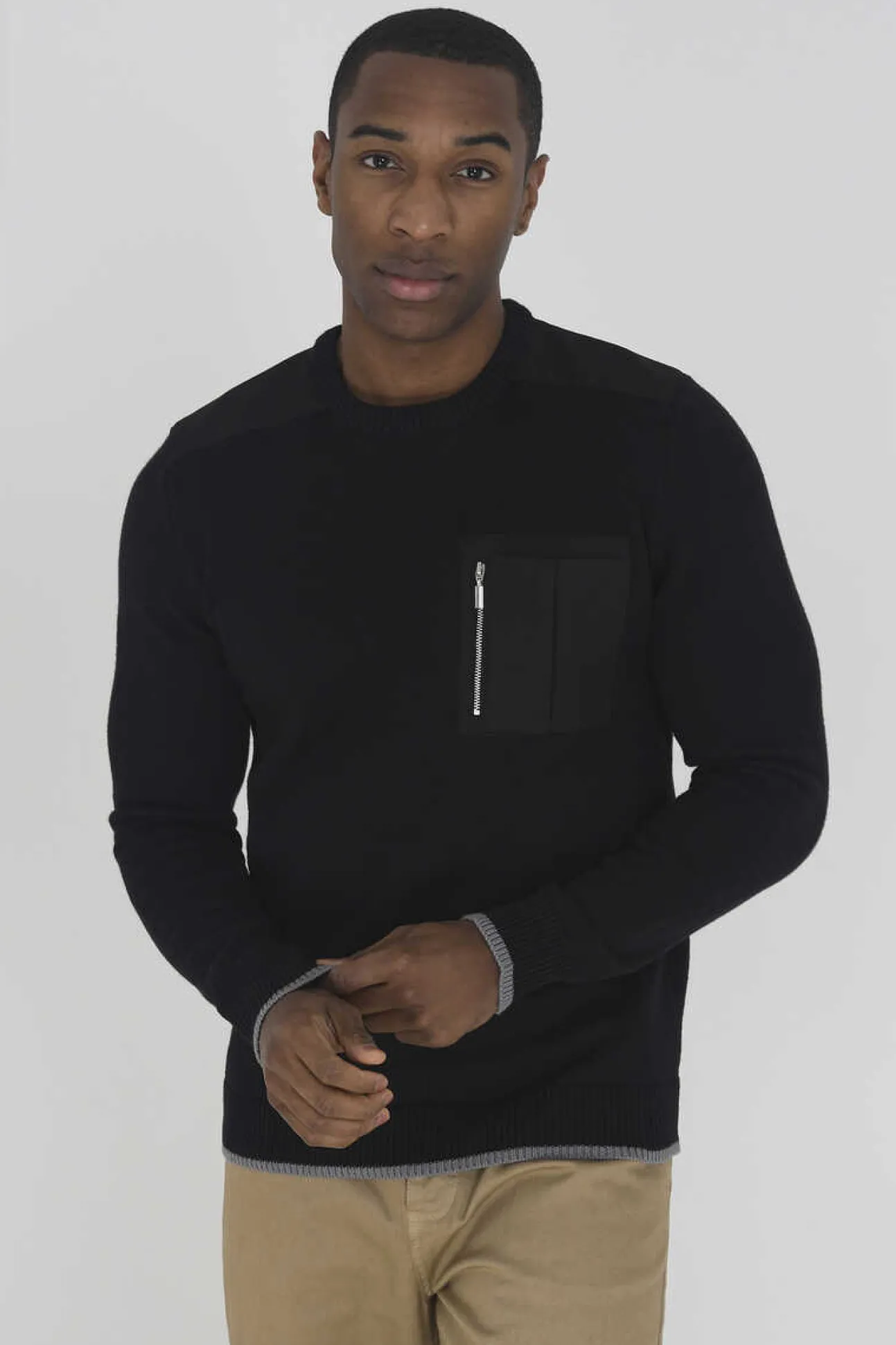 Camisola De Homem Com Remendo Nos Ombros E Bolso Com Fecho-Eclair No Peito. Gola Redonda. Tem Detalhe Canelado Na Gola, Bainha E Punhos.