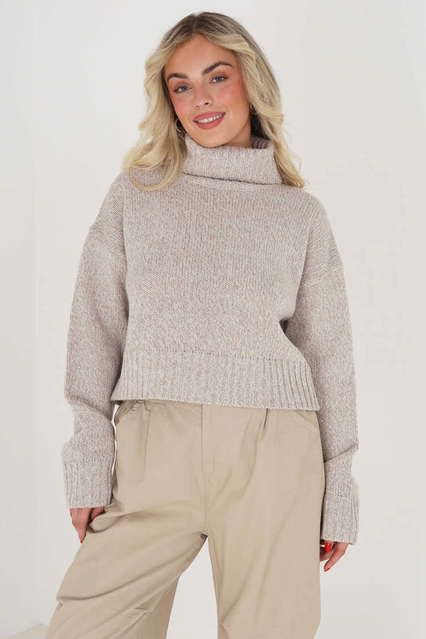 Camisola Cropped De Mulher Jaspeada De Gola Alta. Detalhe Canelado Na Gola, Parte De Baixo E Punhos