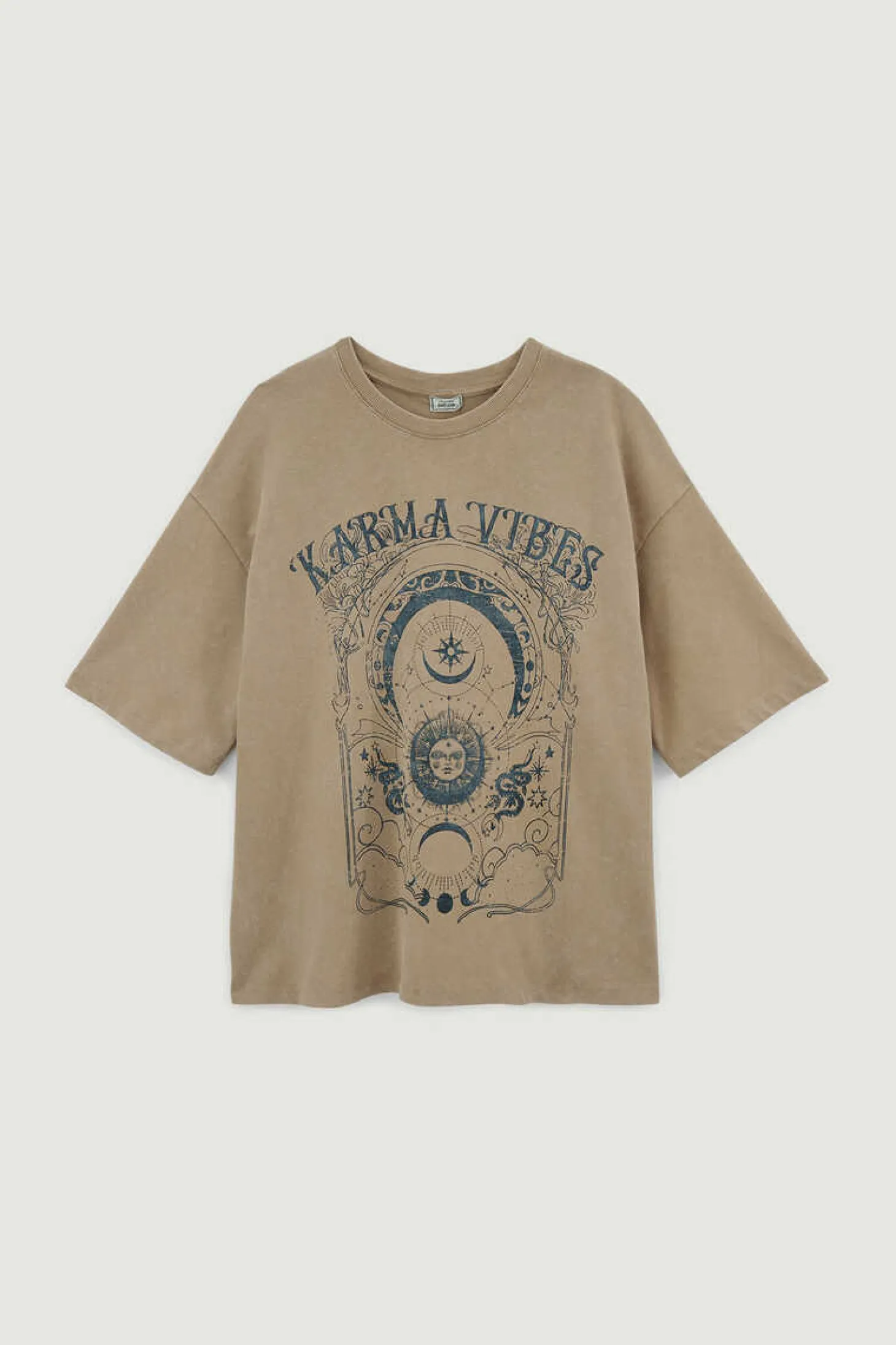 – Camisola Oversize Bege Com Inscricoes Carma Vibes.