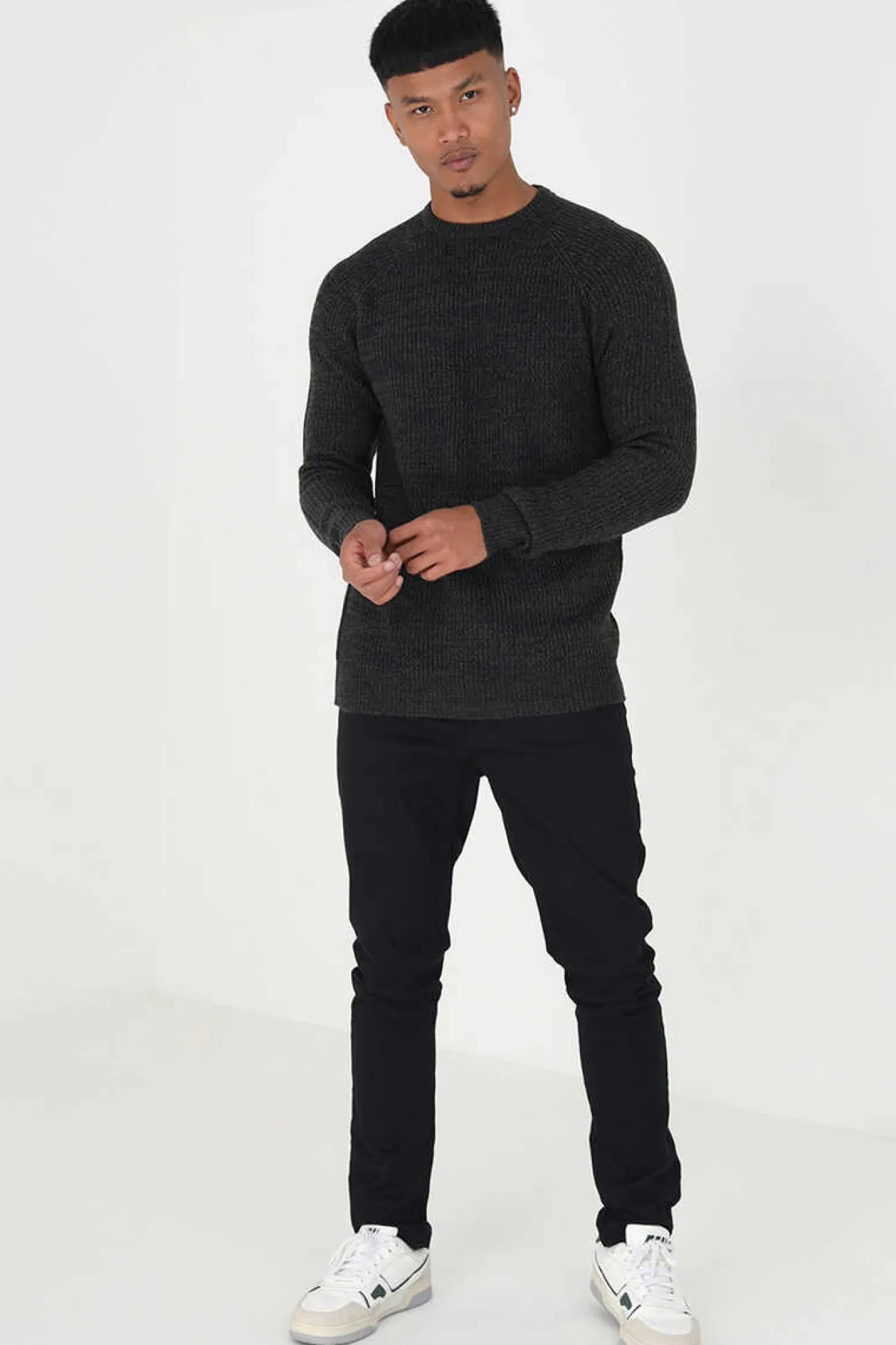 Camisola De Homem De Malha Jaspeada. Com Gola Redonda E Detalhe Canelado Na Gola, Bainha E Punhos