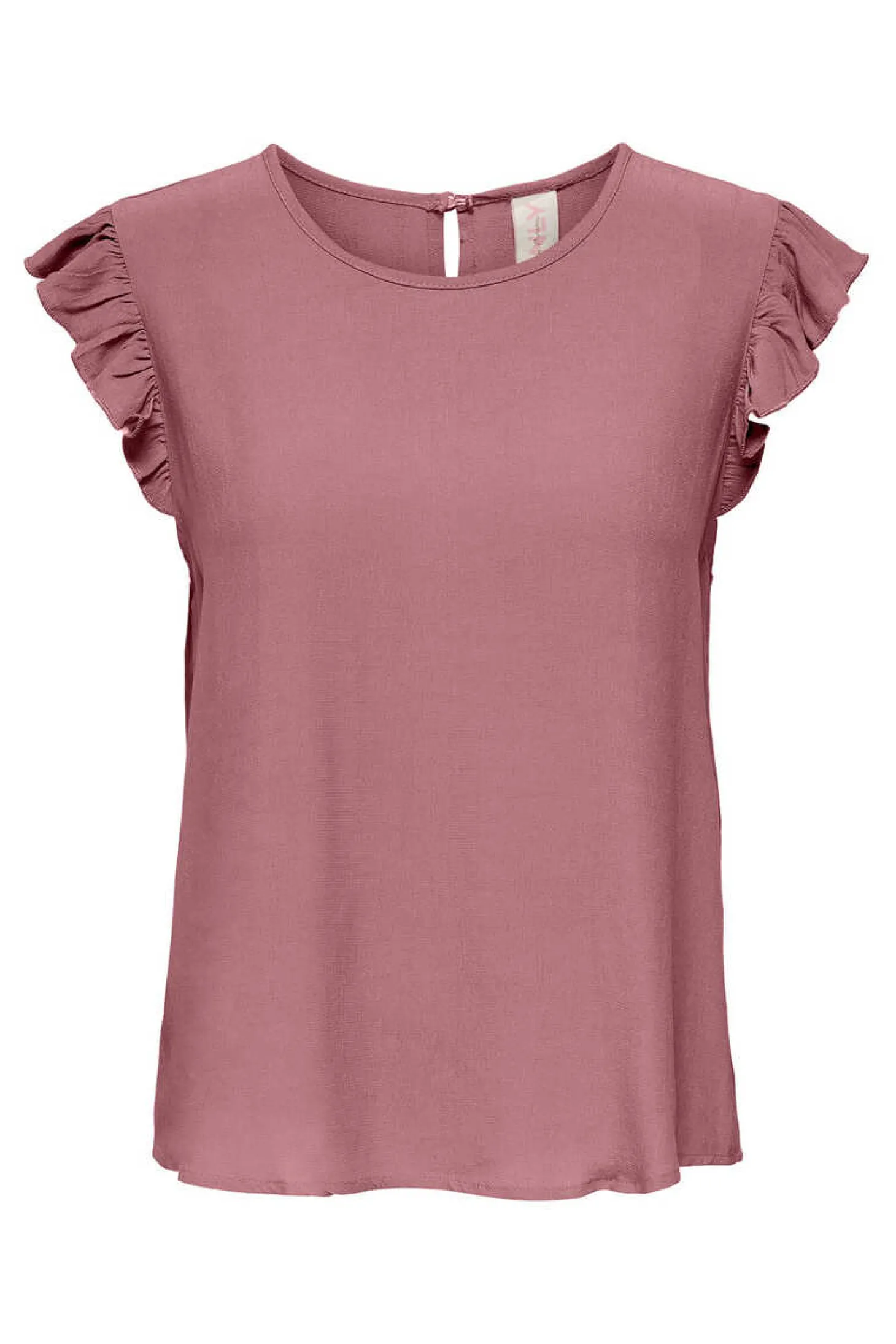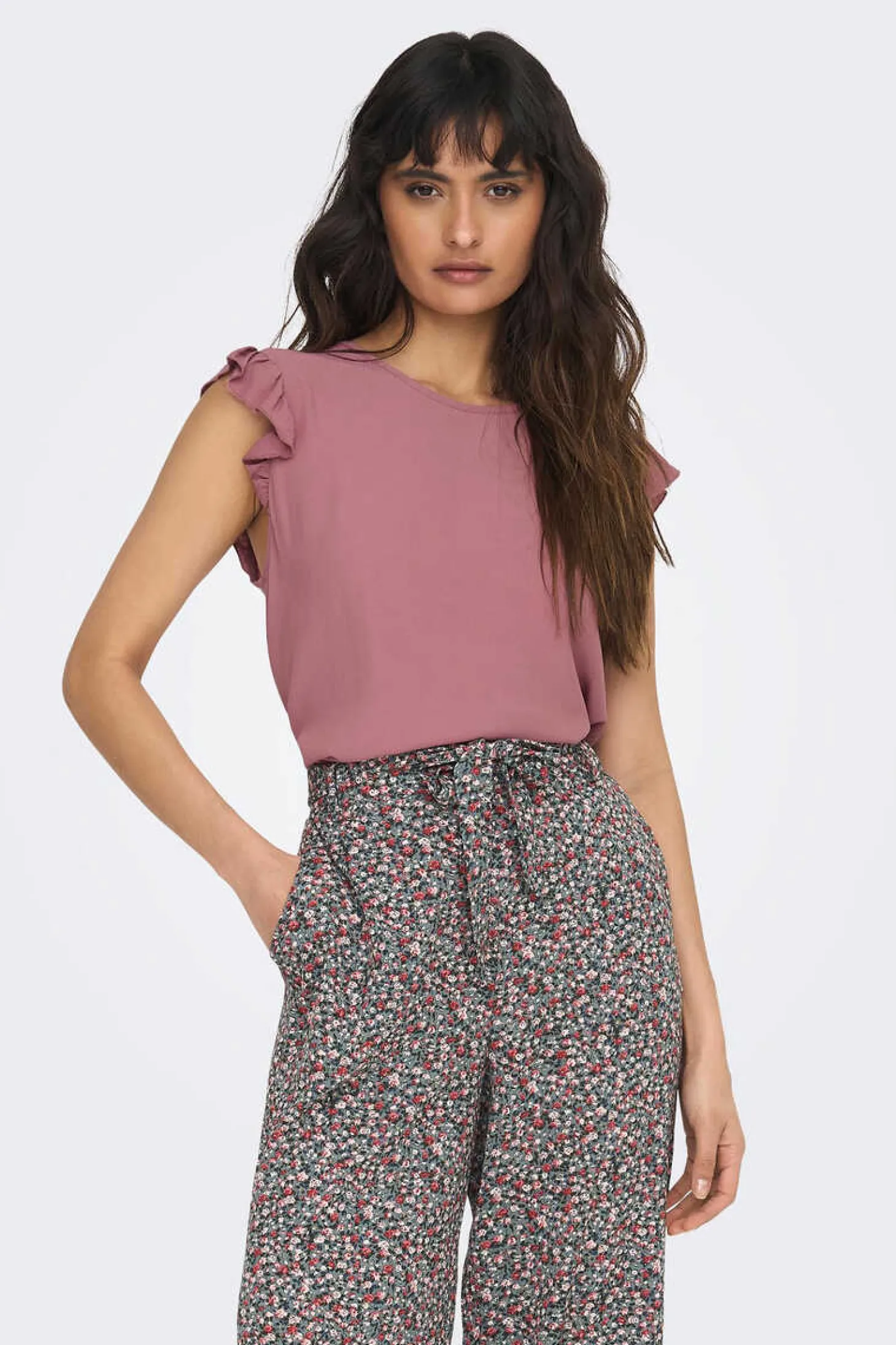 Camisola De Manga Curta Com Detalhe De Folhos E Gola Redonda.