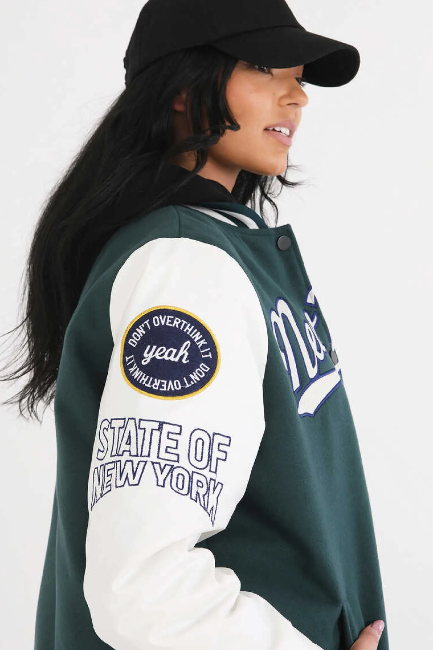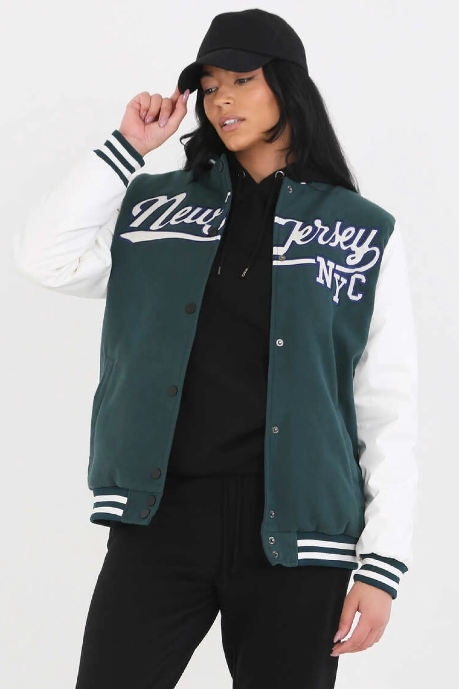 Casaco Bomber Beisebol De Mulher Combinado. Fecho Mediante Botoes De Pressao.Com Bordados De Letras No Peito E Manga Com Remendo. Detalhe As Riscas Na Bainha … E Nos PunhosVer Mais