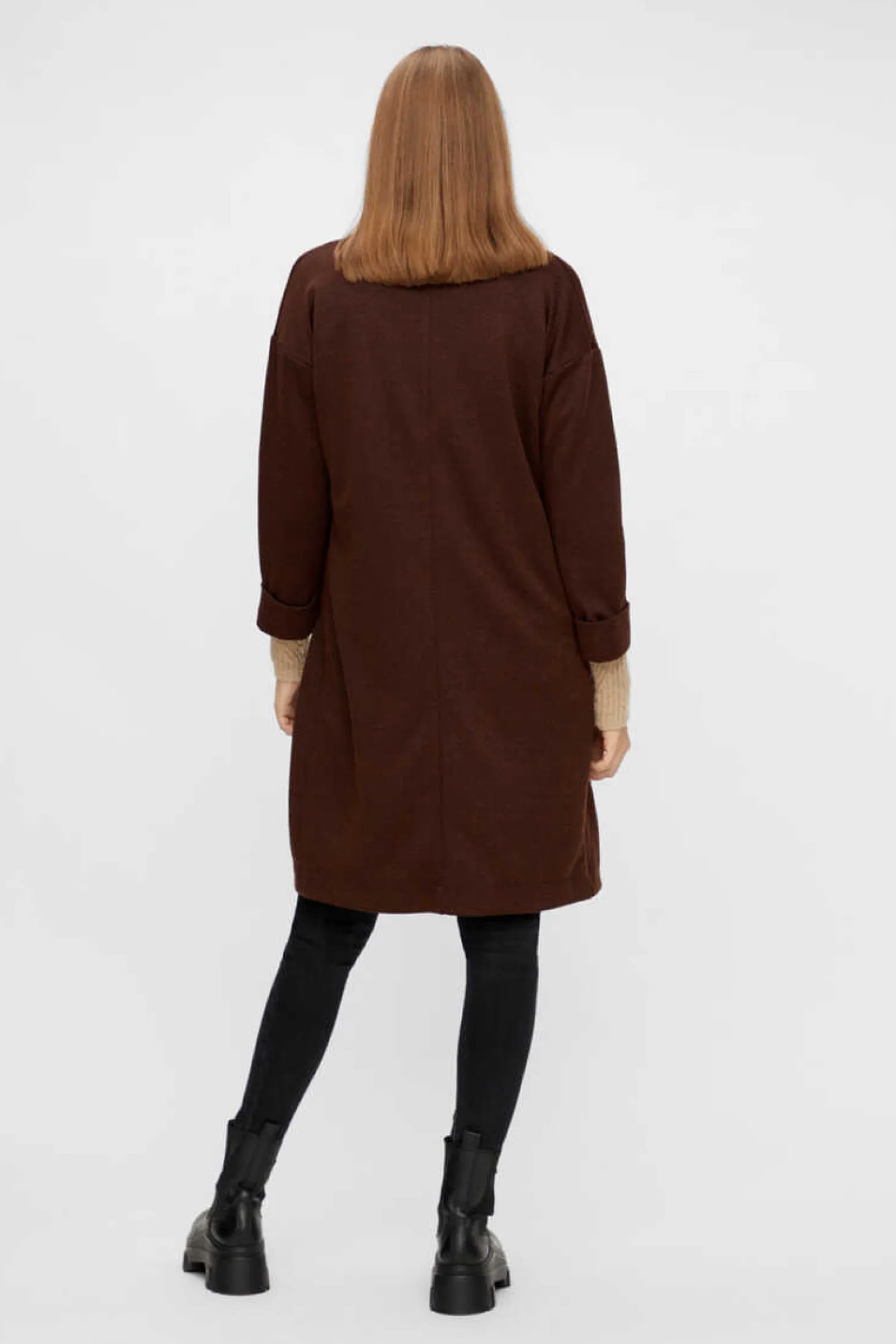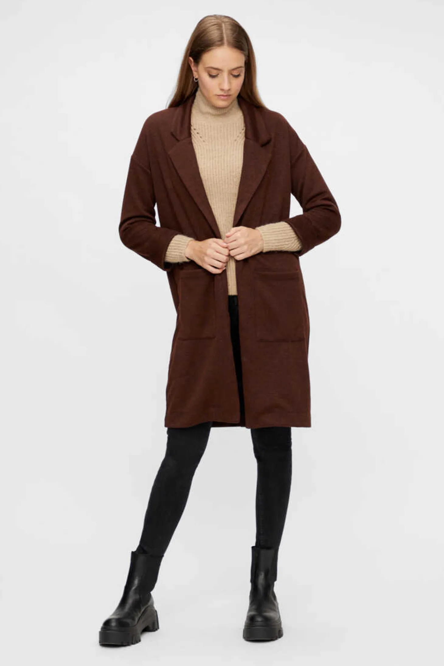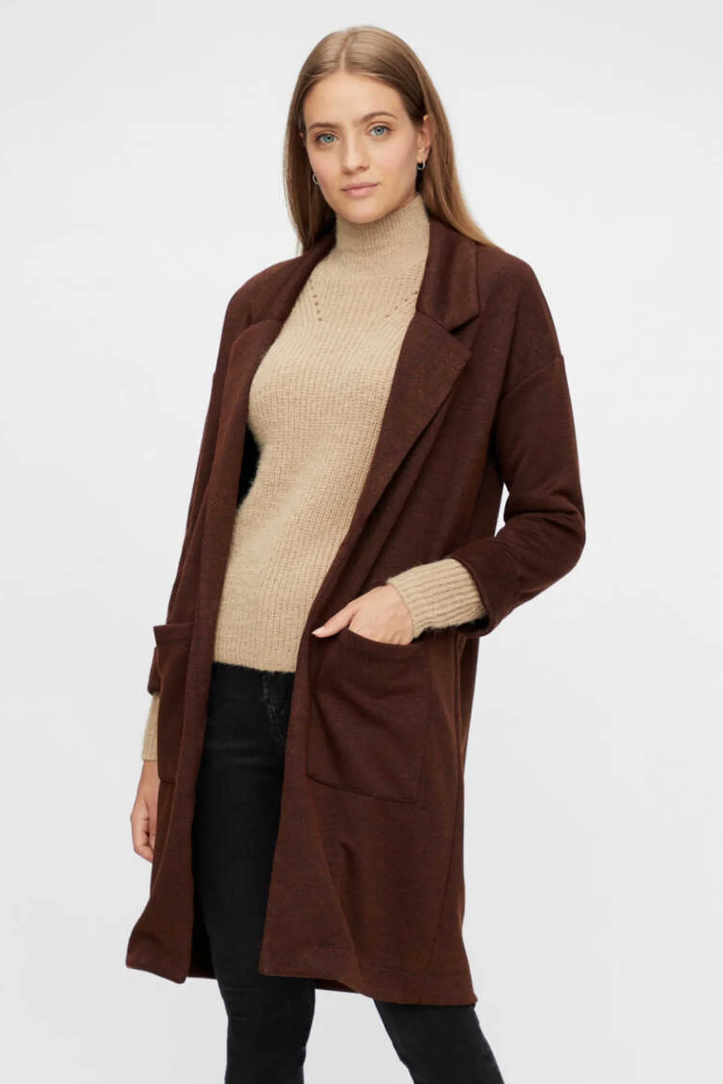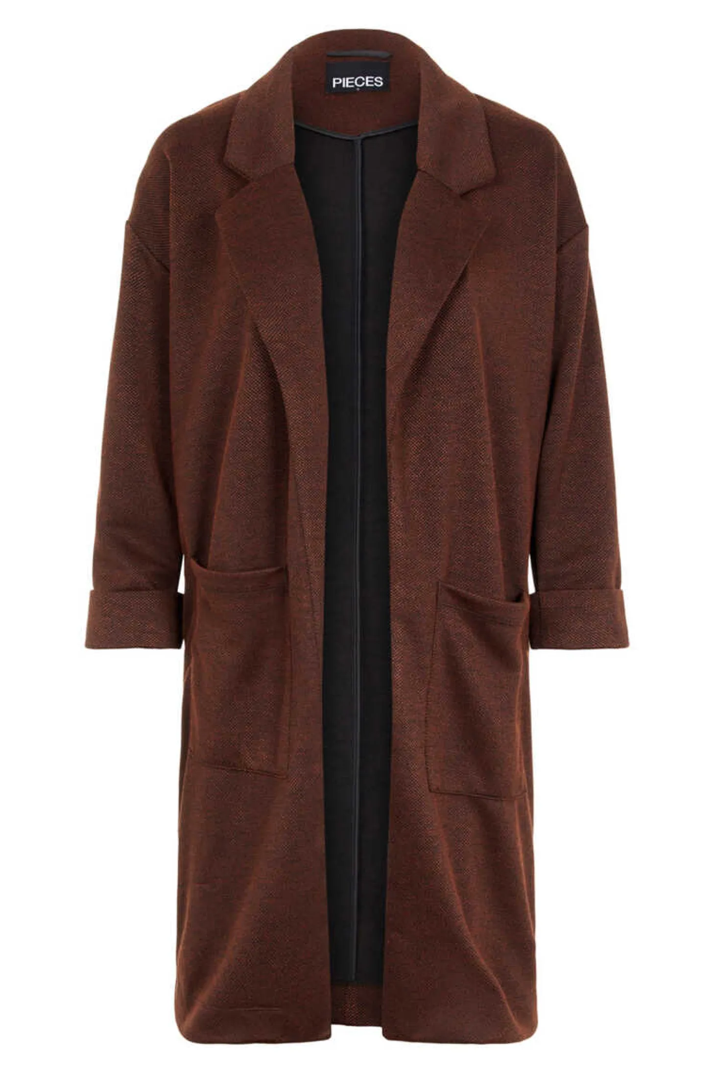 Casaco Comprido Sem Fecho. De Manga Comprida E Decote Com Lapelas. Dois Bolsos A Frente E Detalhe De Punhos Com Dobra.