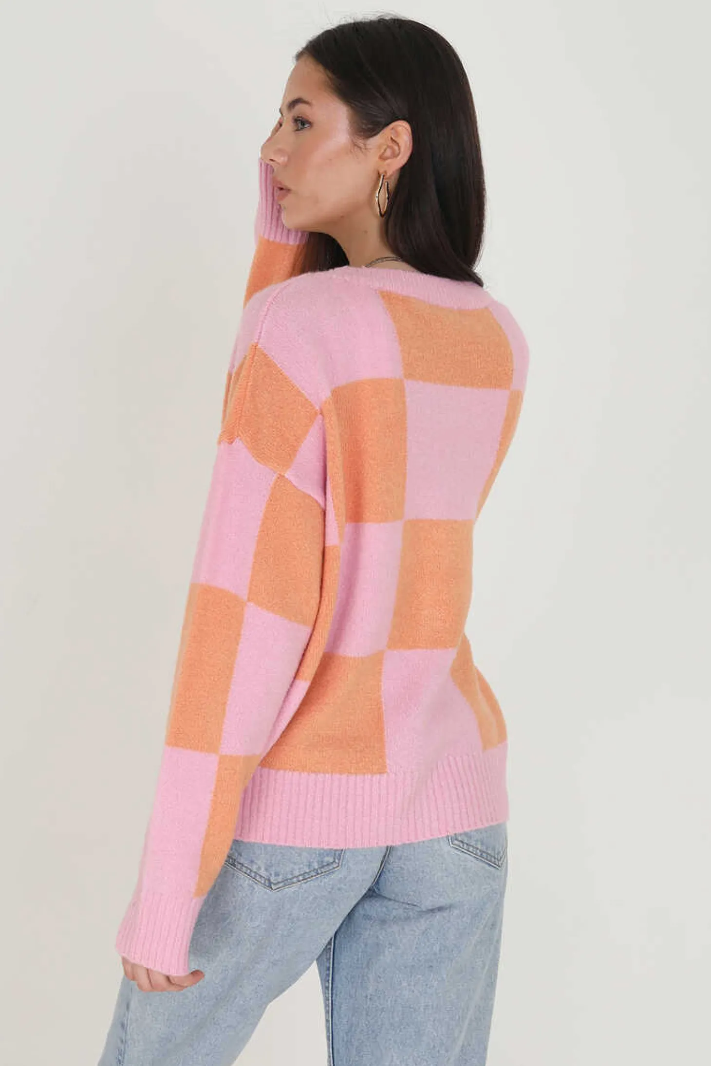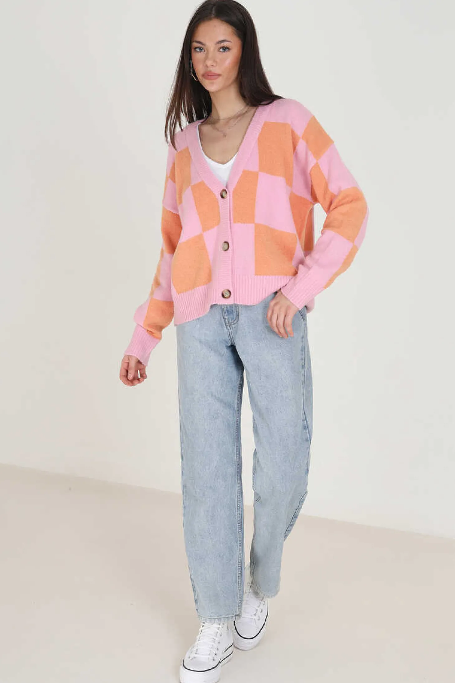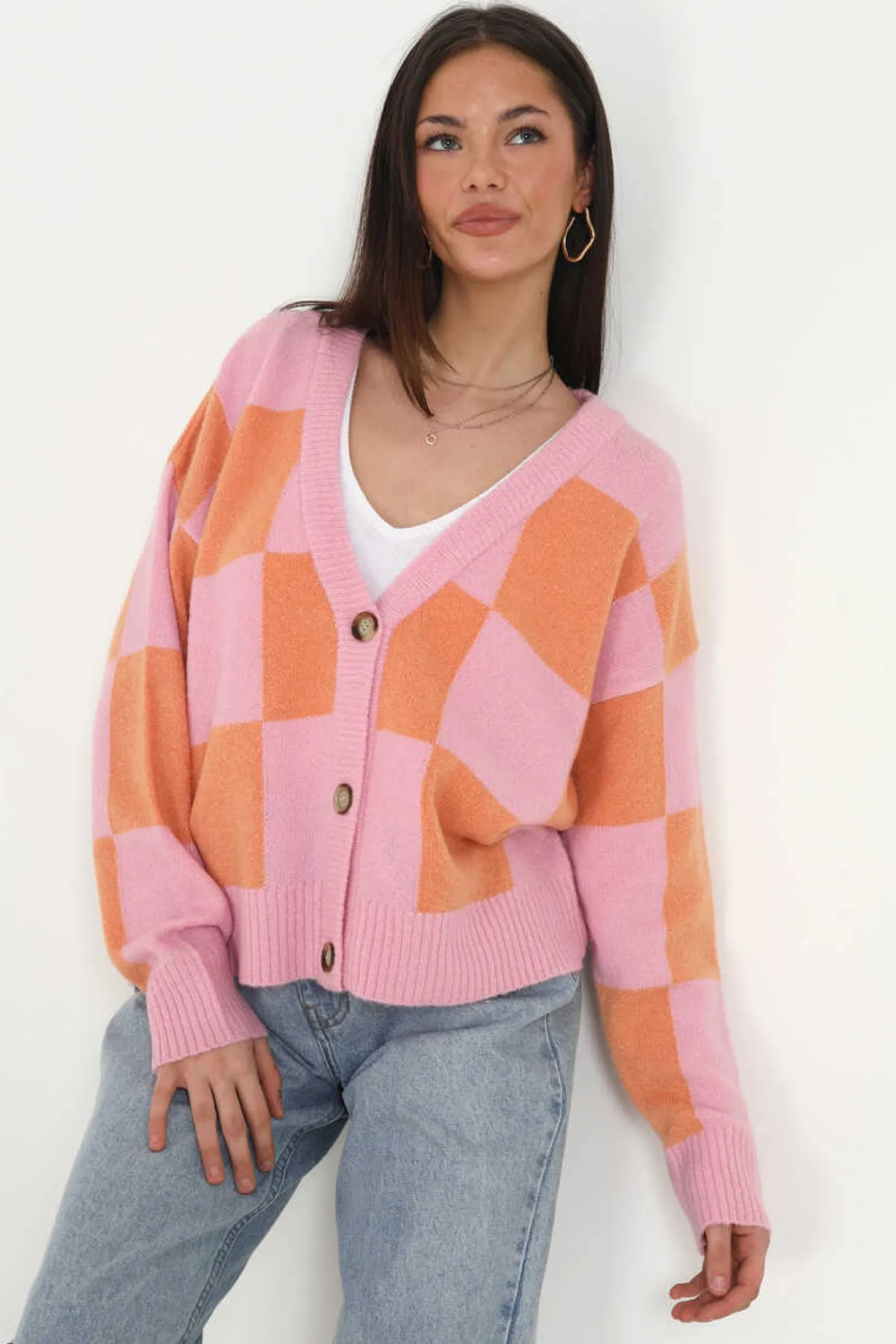 Casaco De Malha De Mulher Em Xadrez Com Tres Botoes. Decote Em Bico E Com Detalhe Canelado Na Gola, Parte De Baixo E Punhos