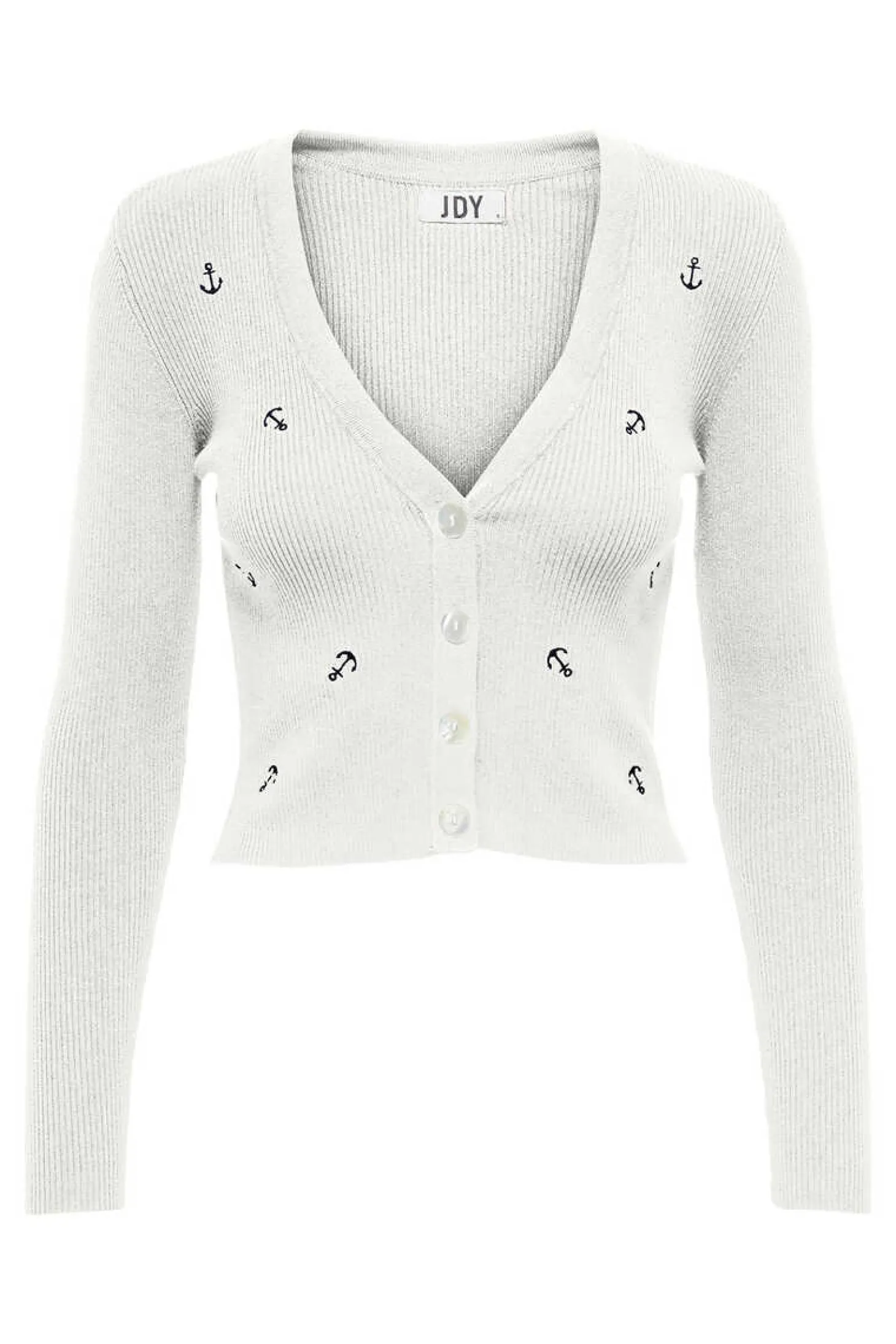 Casaco De Malha Gola Em Bico Pronunciado, Estampado De Coracoes E Botoes Frontais. Detalhe De Bordado.