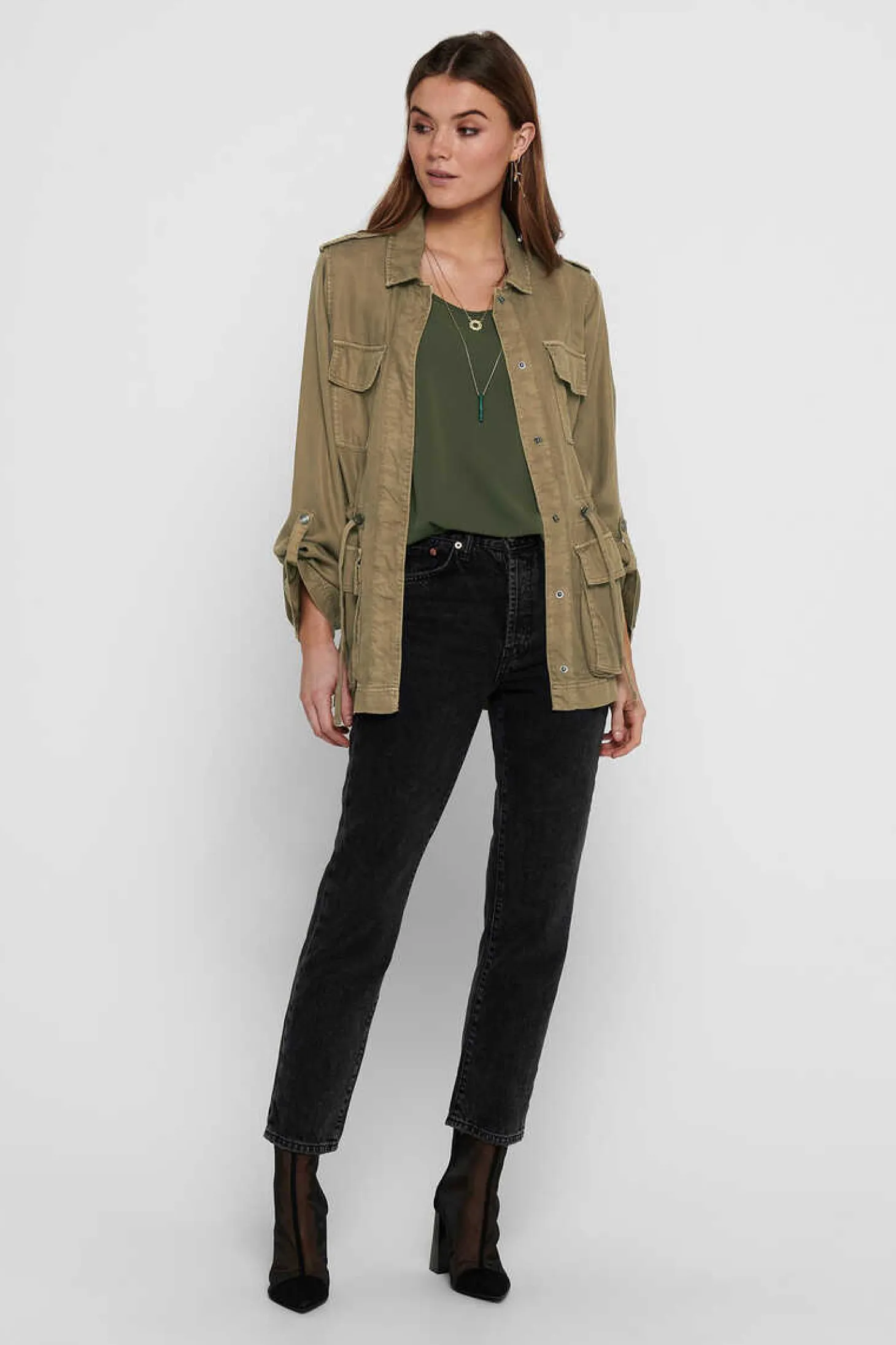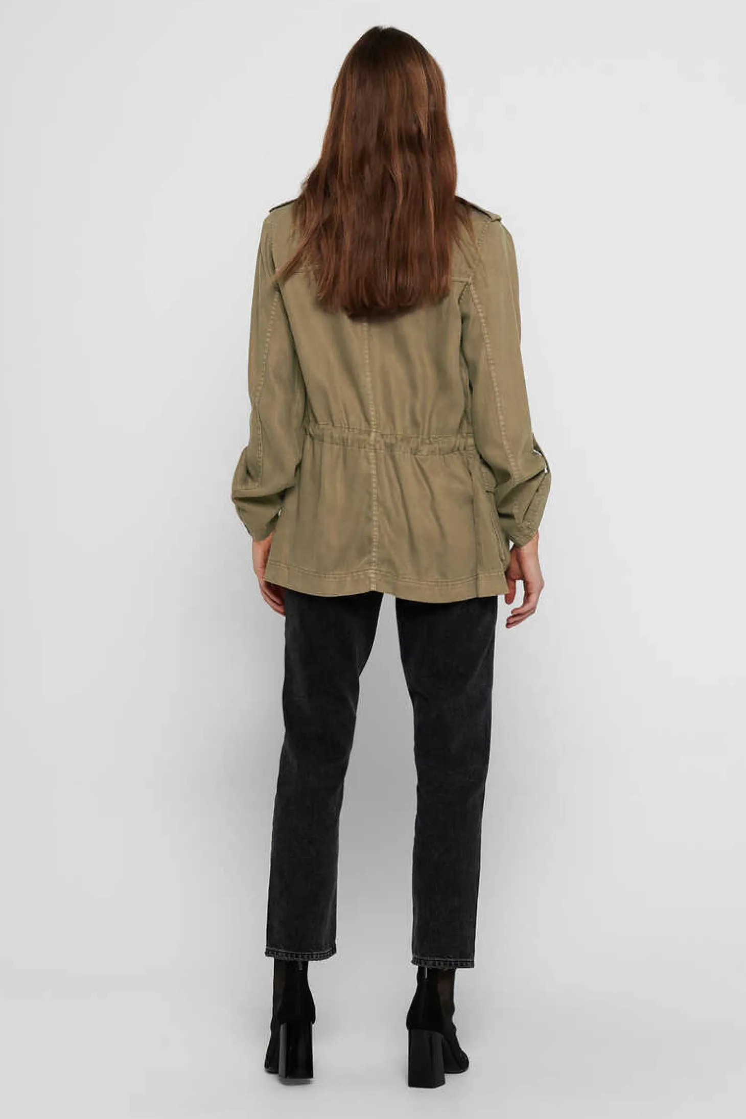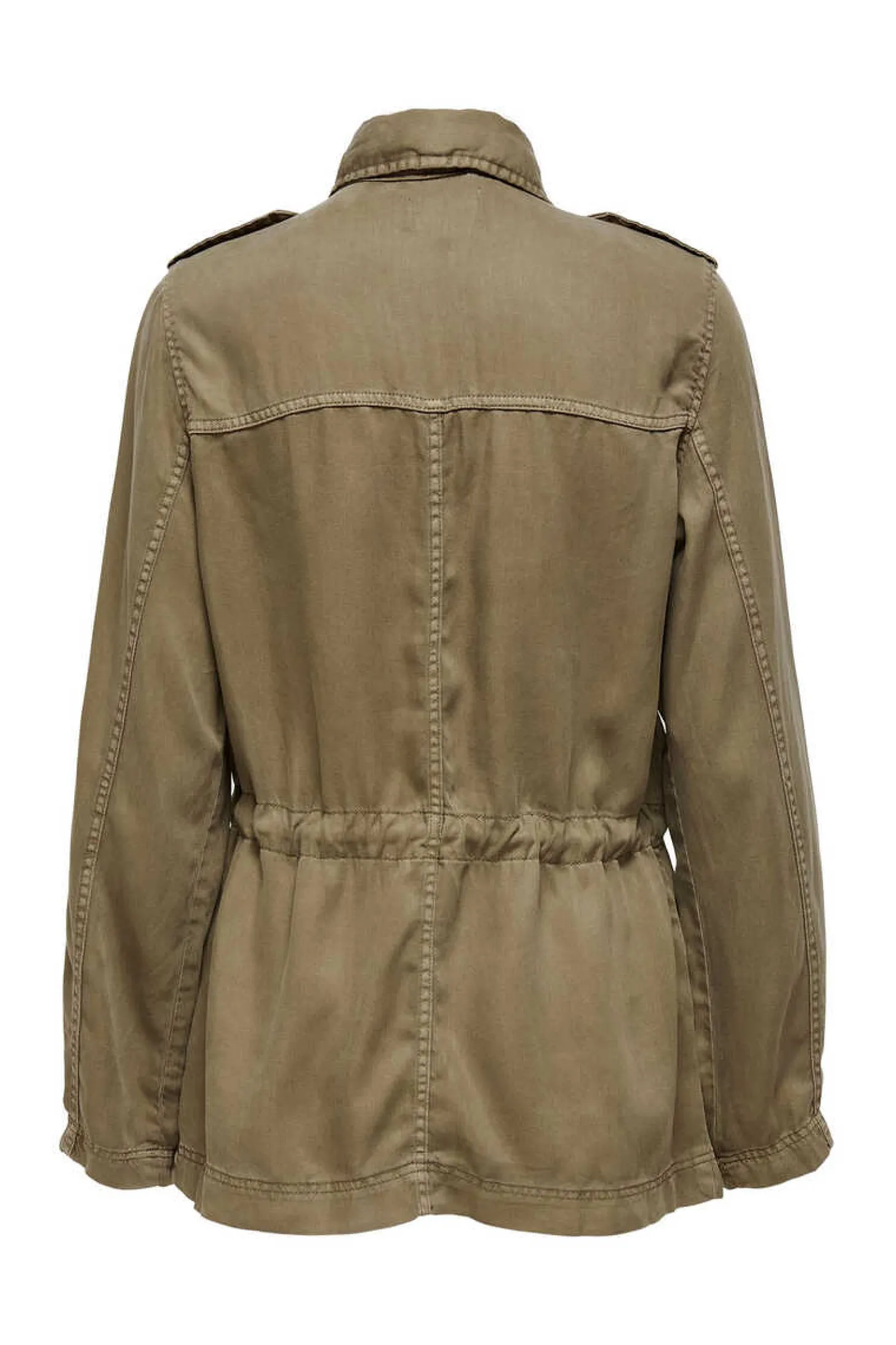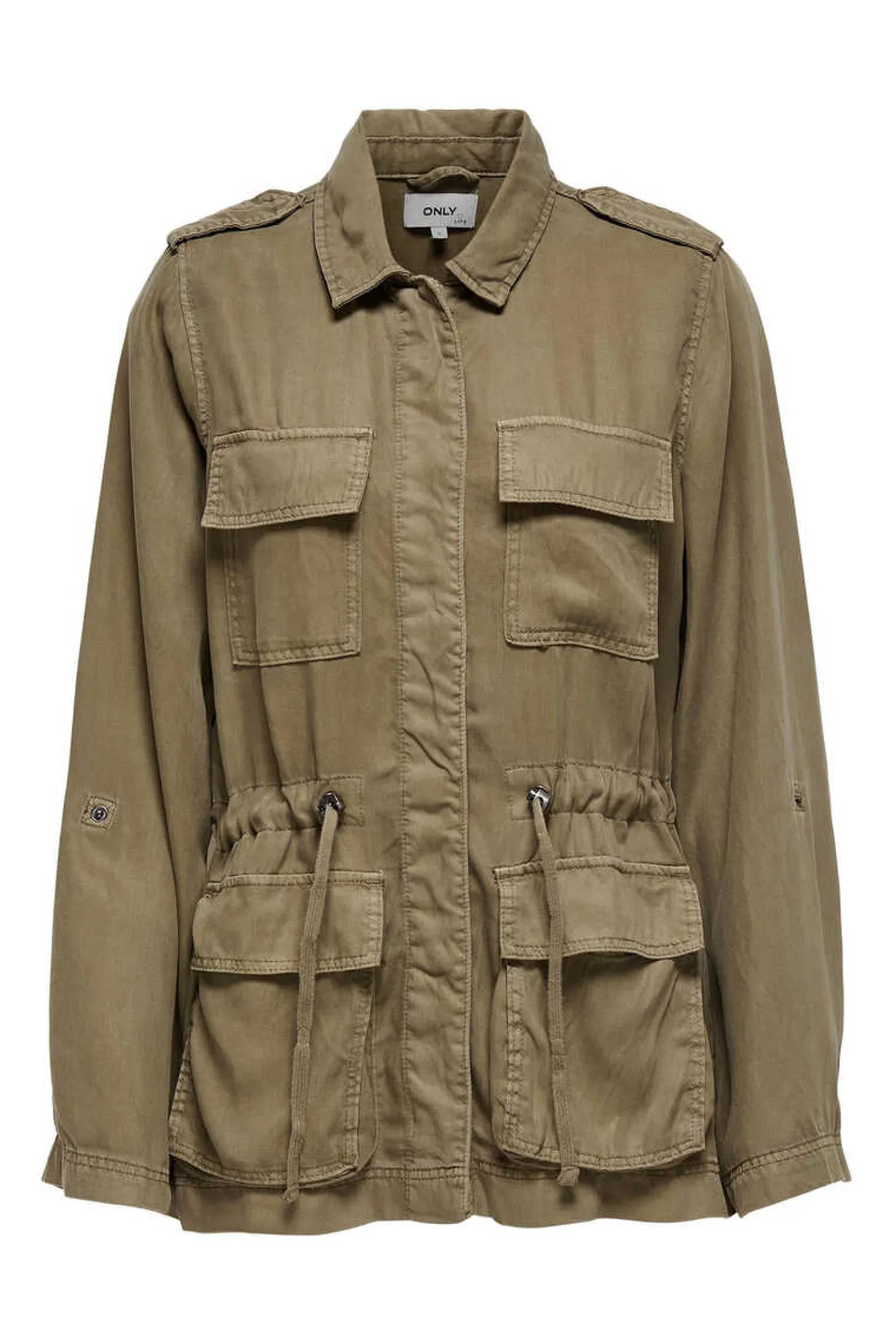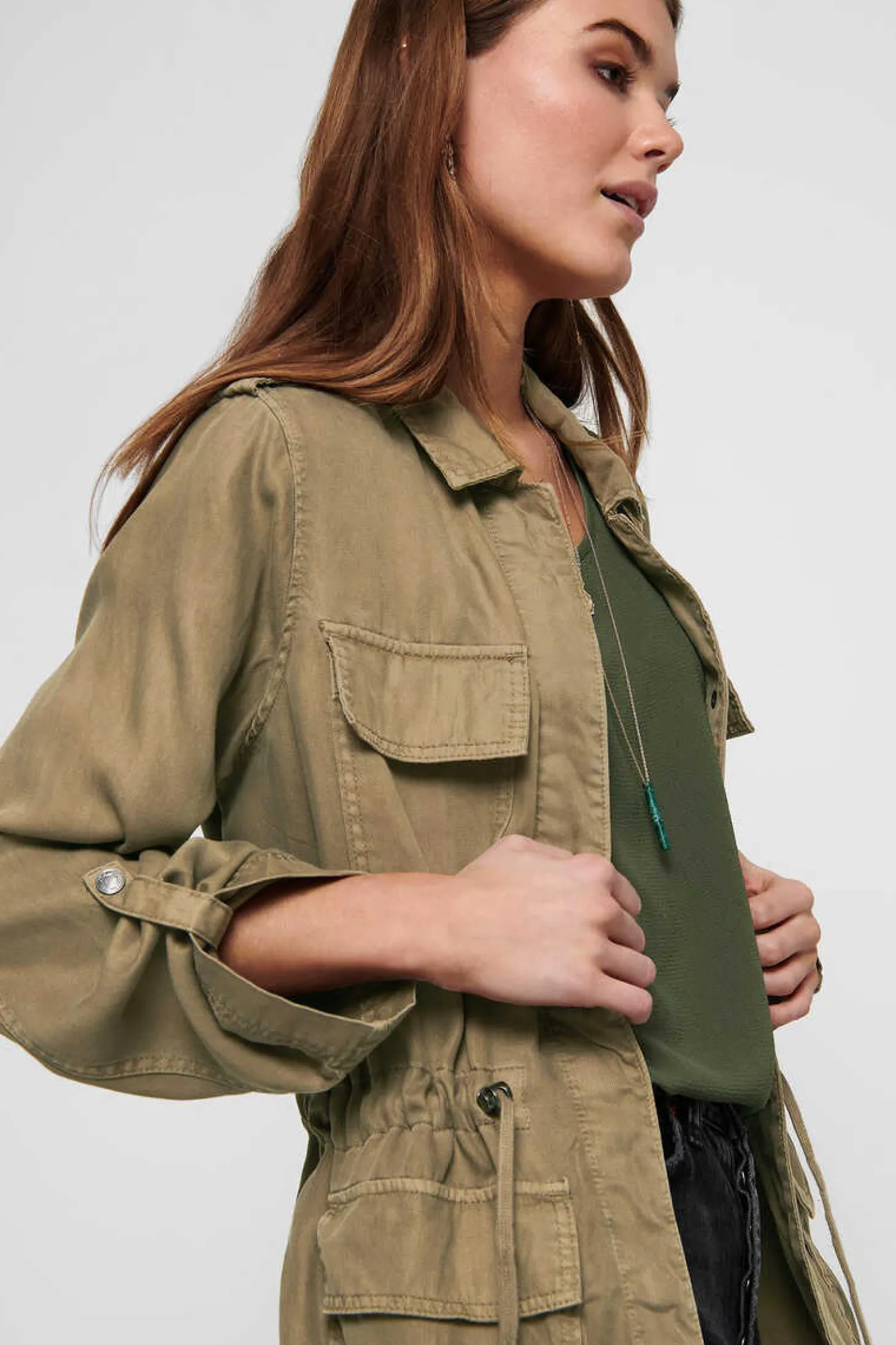 Casaco Estilo Safari, Tecido Fluido, Cintura Ajustavel E Bolsos.