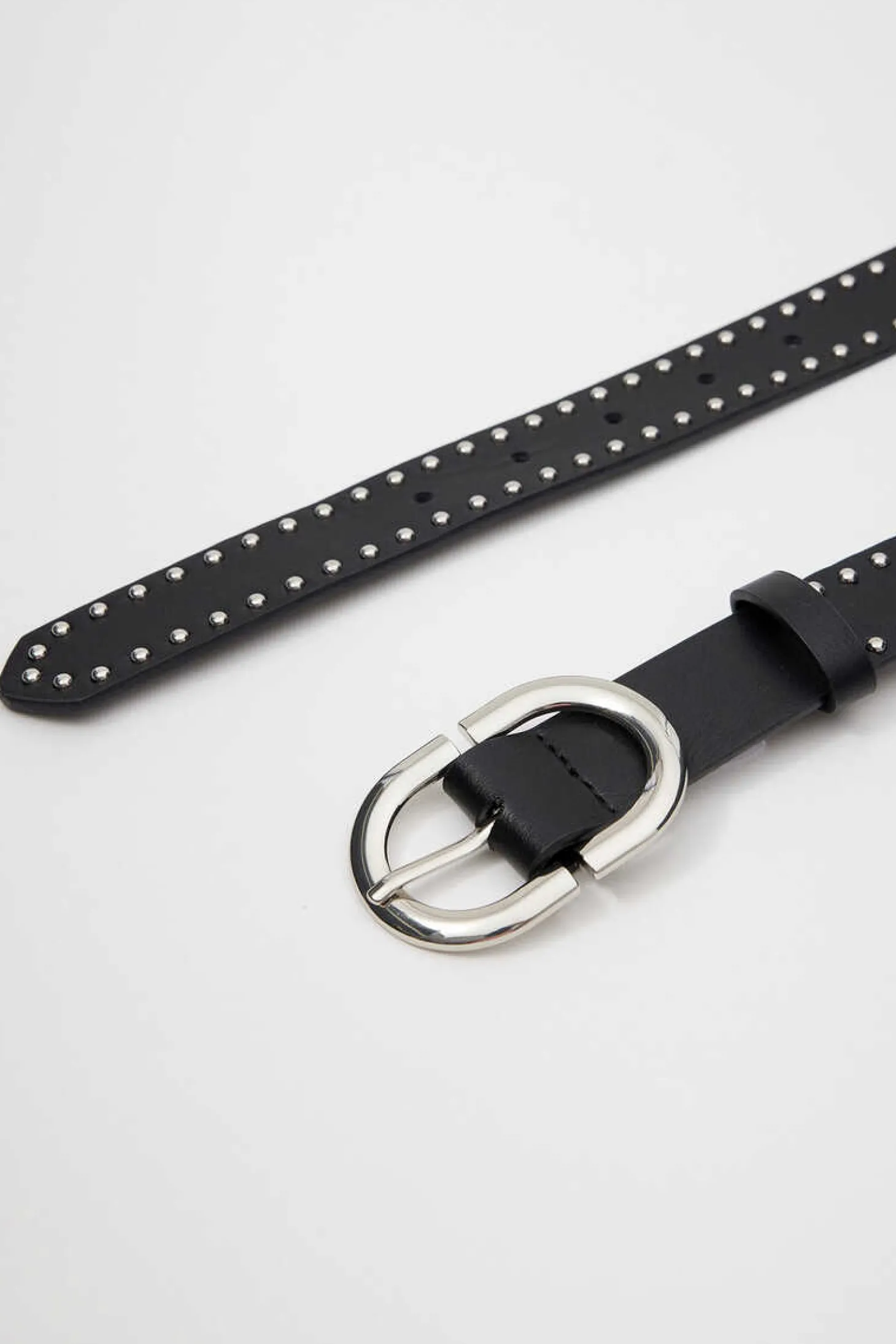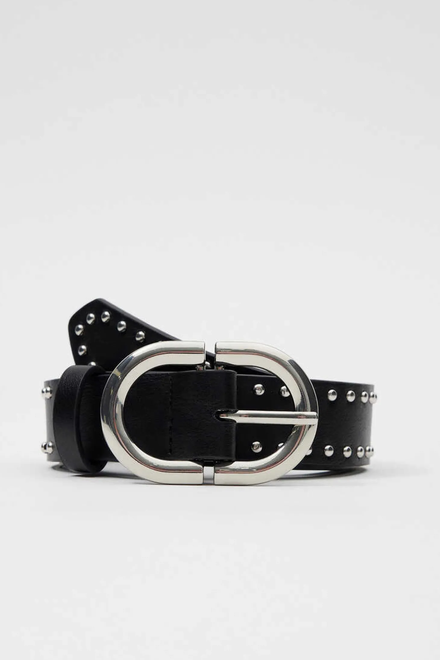 Cinto De Polipele Preta Com Tachas E Fivela Redonda Com Acabamentos Prateados.