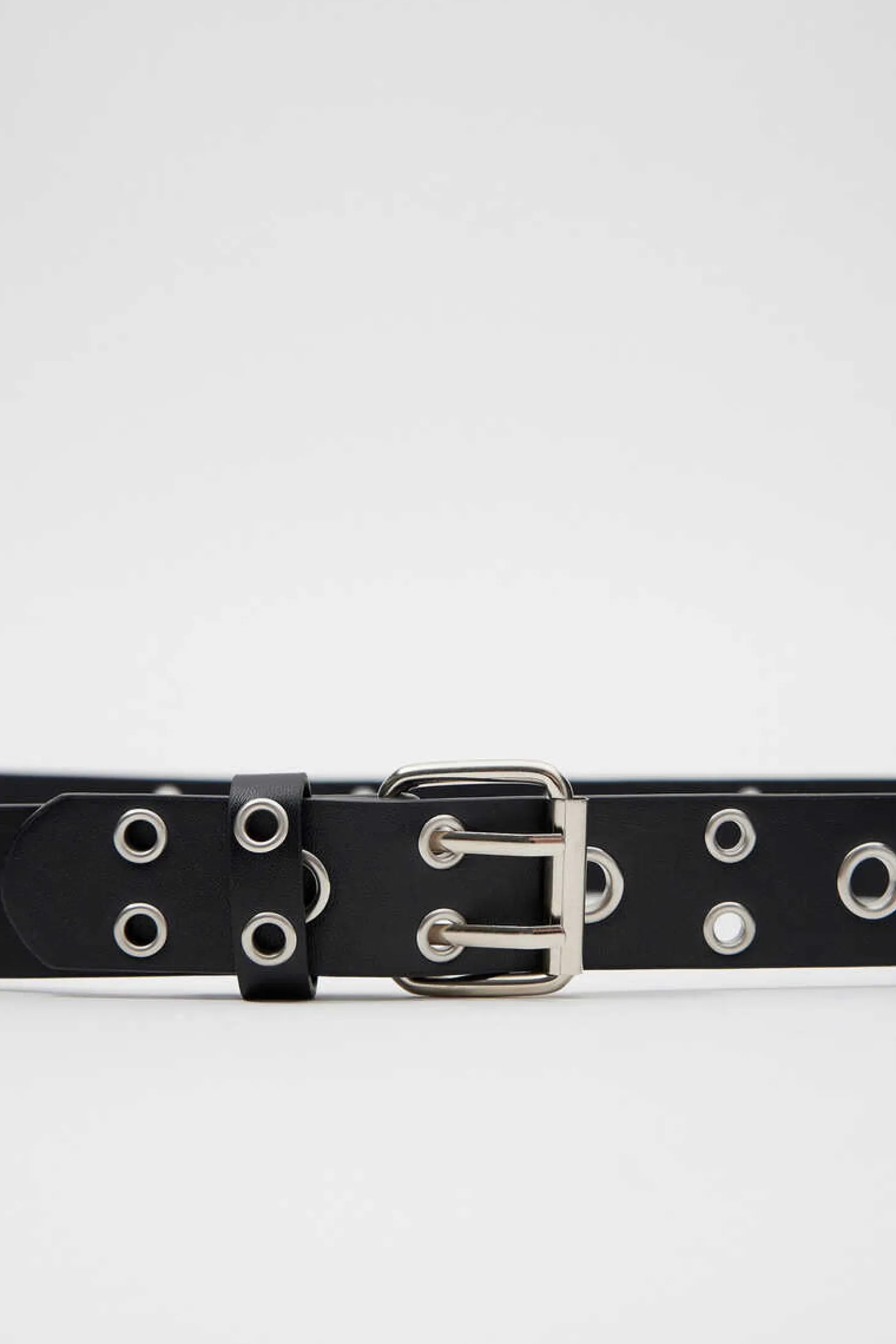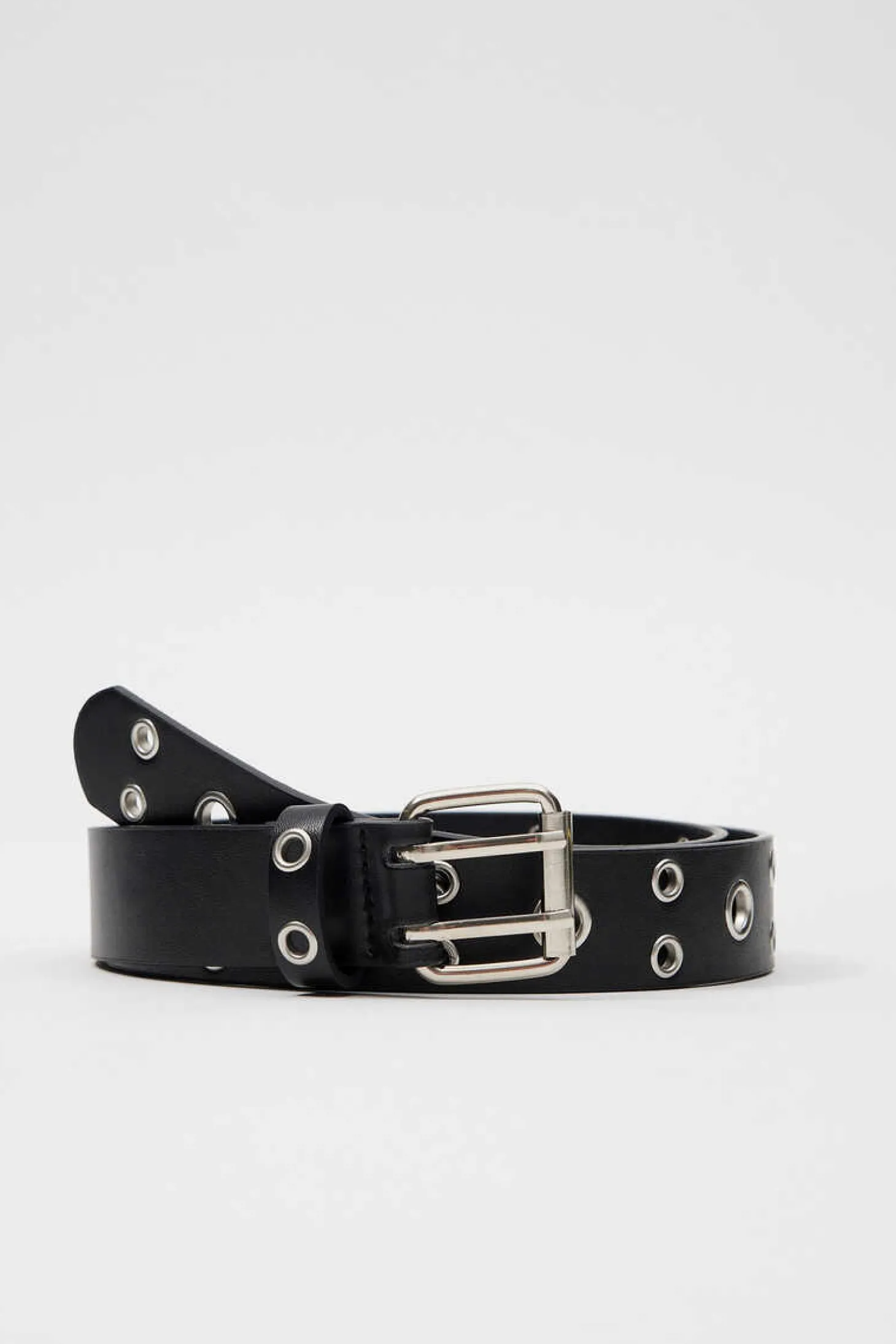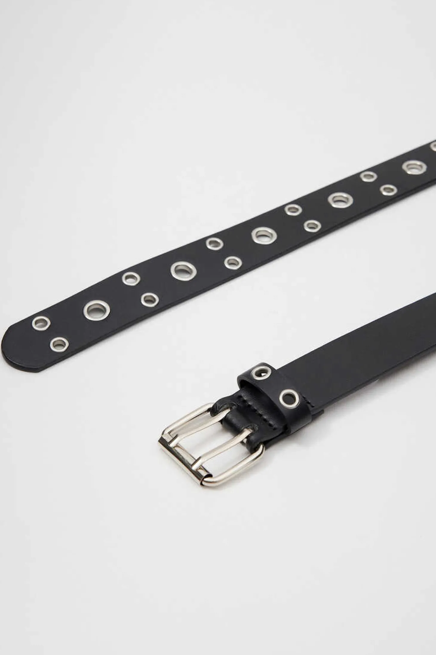 Cinto Preto De Polipele Com Tachas E Argolas Prateadas Com Fivela Quadrada.