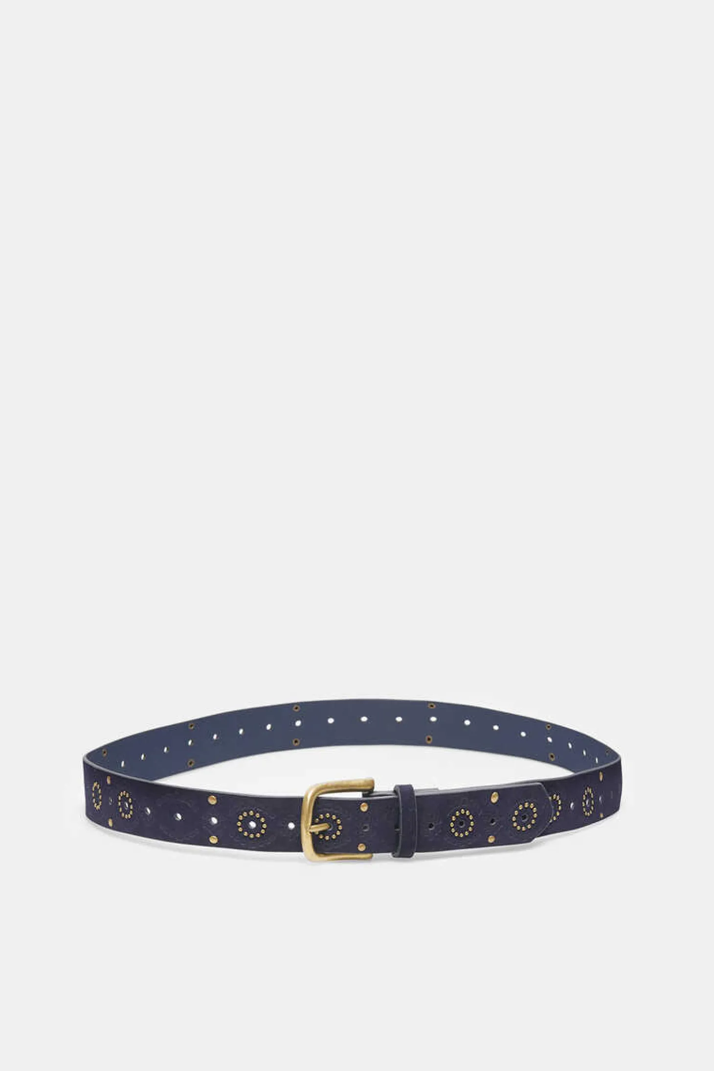 Cinto Com Efeito Camurca, Com Detalhe De Circulos De Tachas E Com Fivela Metalica Dourada.