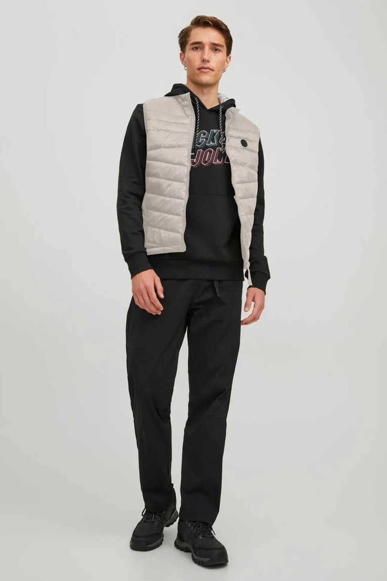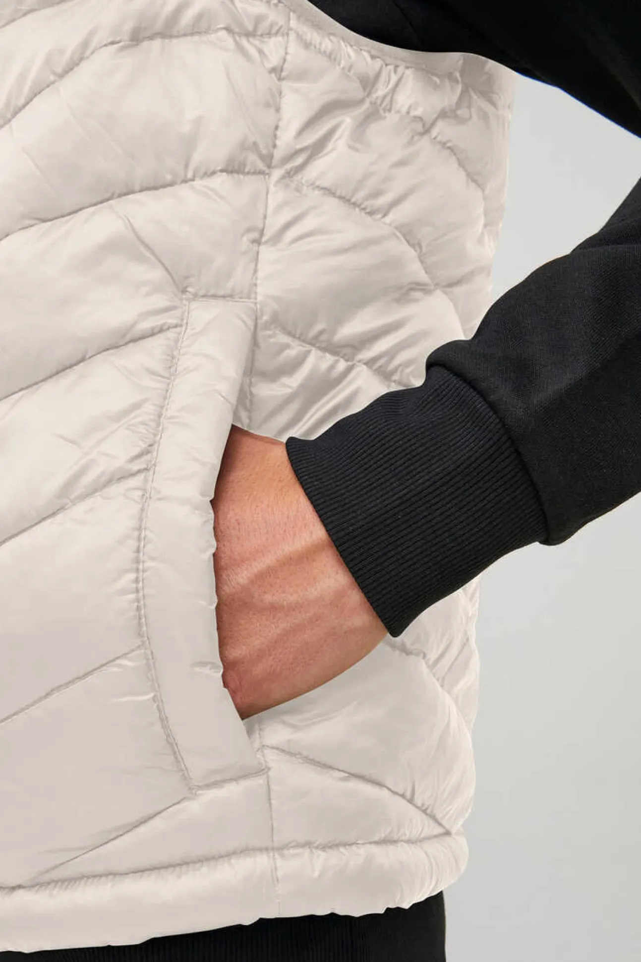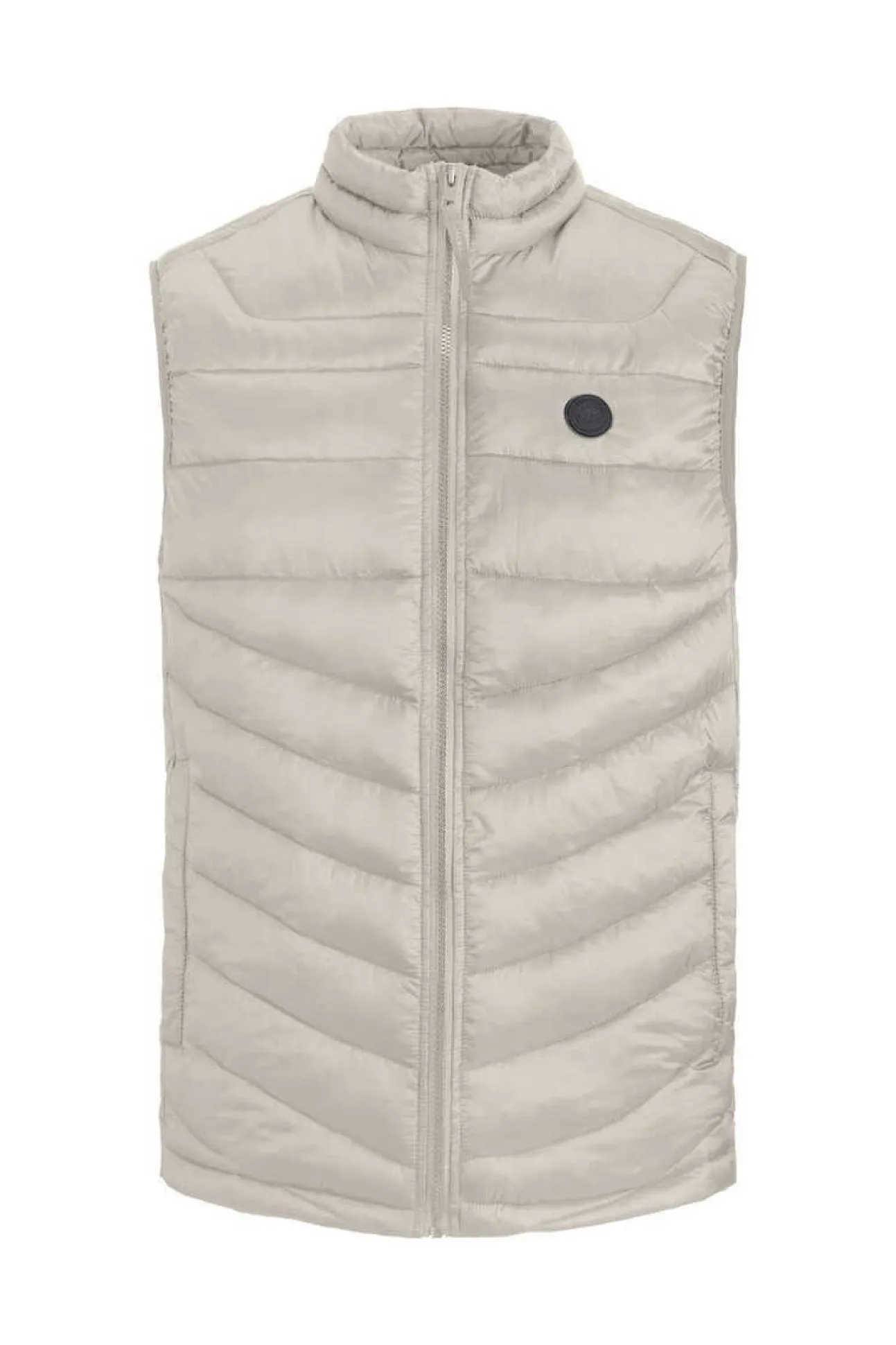 Colete Acolchoado De Gola Alta. Manga Cava. Bolsos De Debrum Na Anca. Fecho-Eclair Frontal.