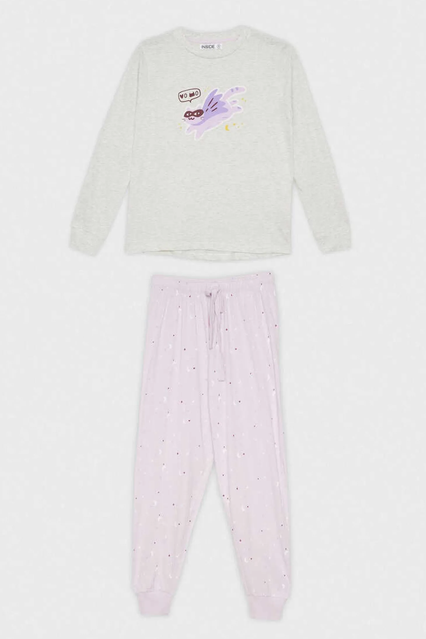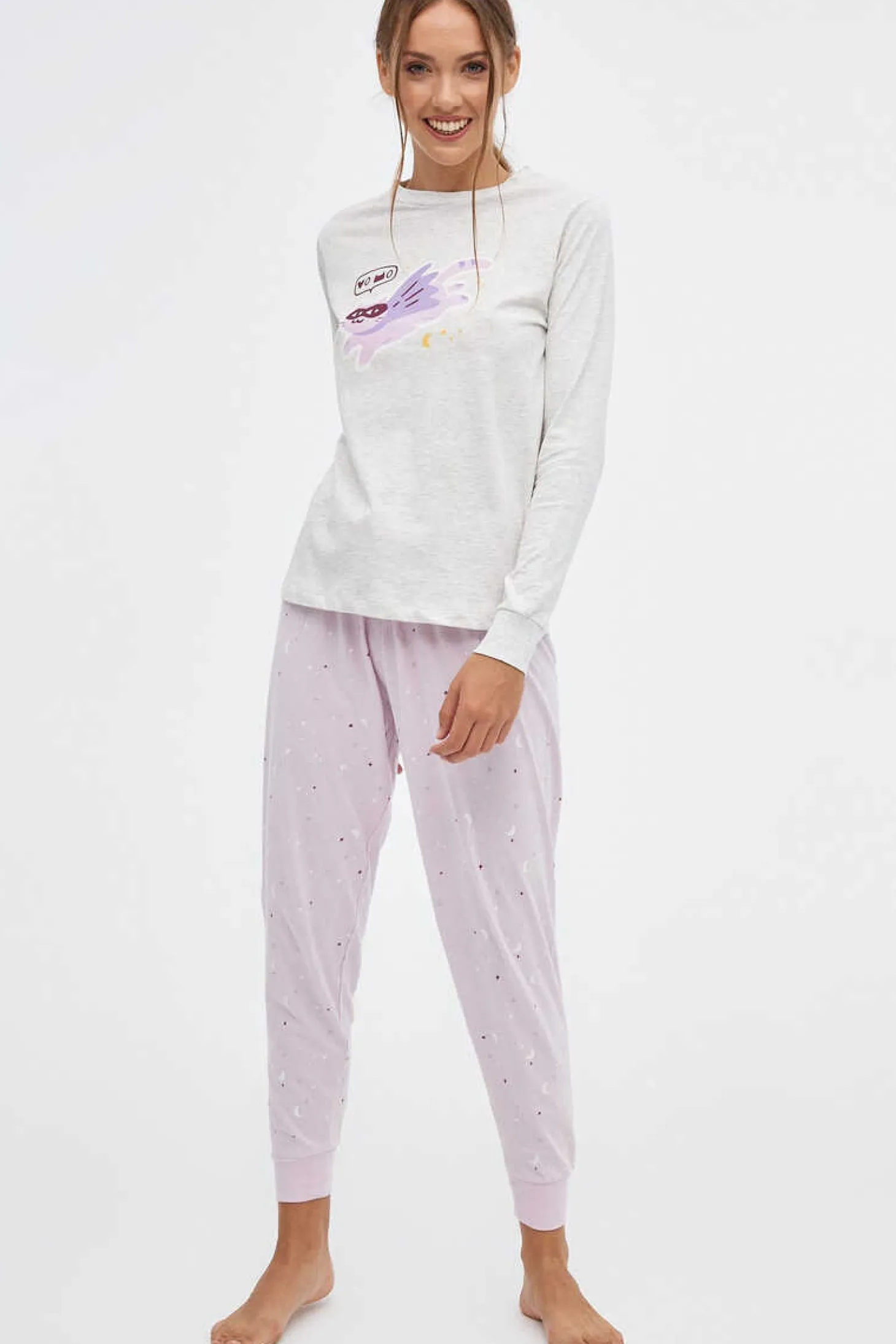 Pijama Regular De Camisola De Manga Comprida Com Gola Redonda Com Estampado Grafico E Calcas De Cintura Media Com Cintura Elastica E Estampado Total.