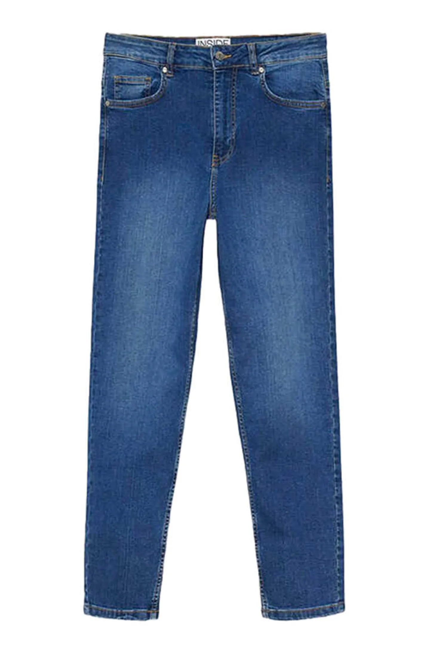 Jeans Mom Slim De Cintura Subida De Tecido Denim Azul-Escuro Com Bolsos E Fecho-Eclair Com Botao.