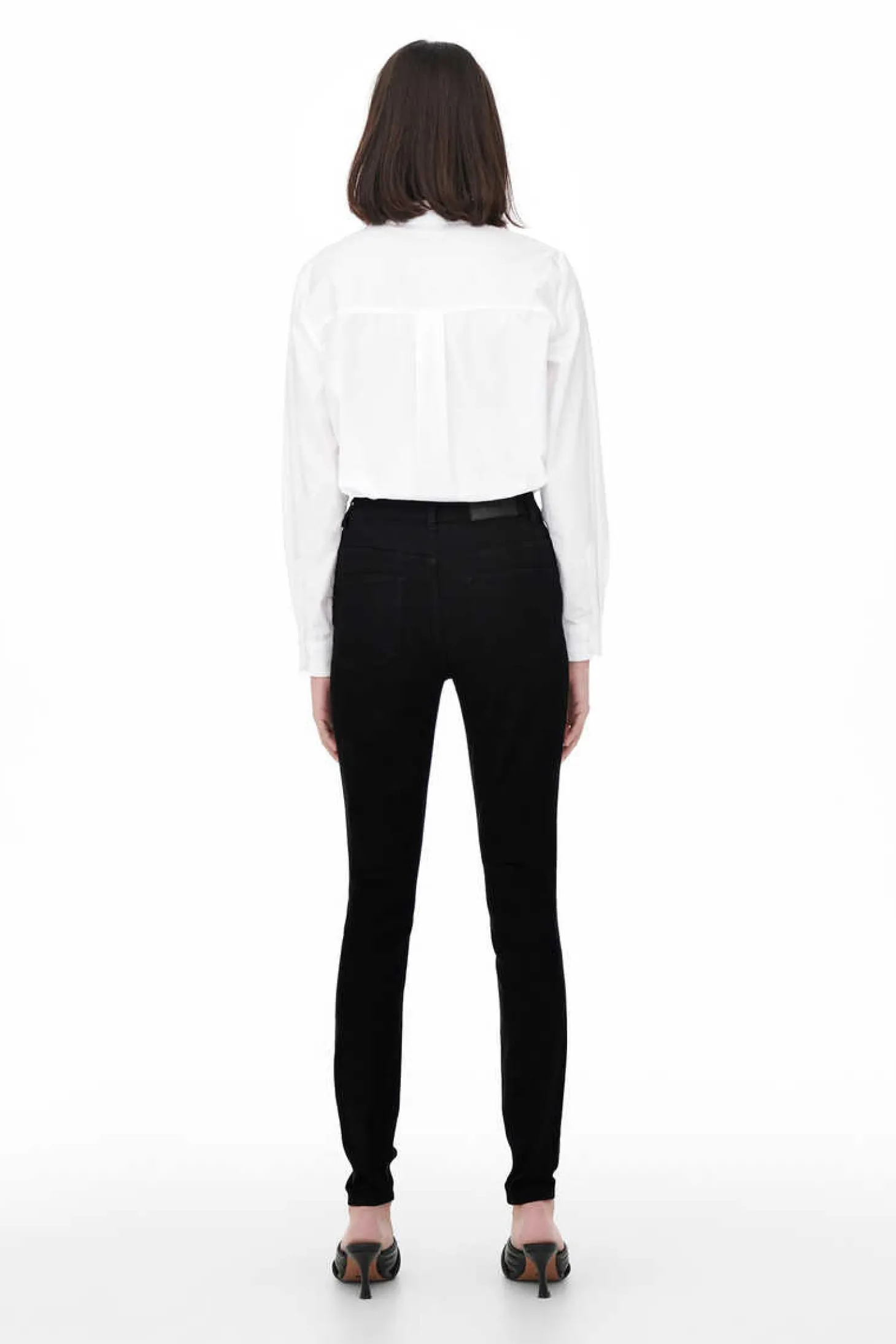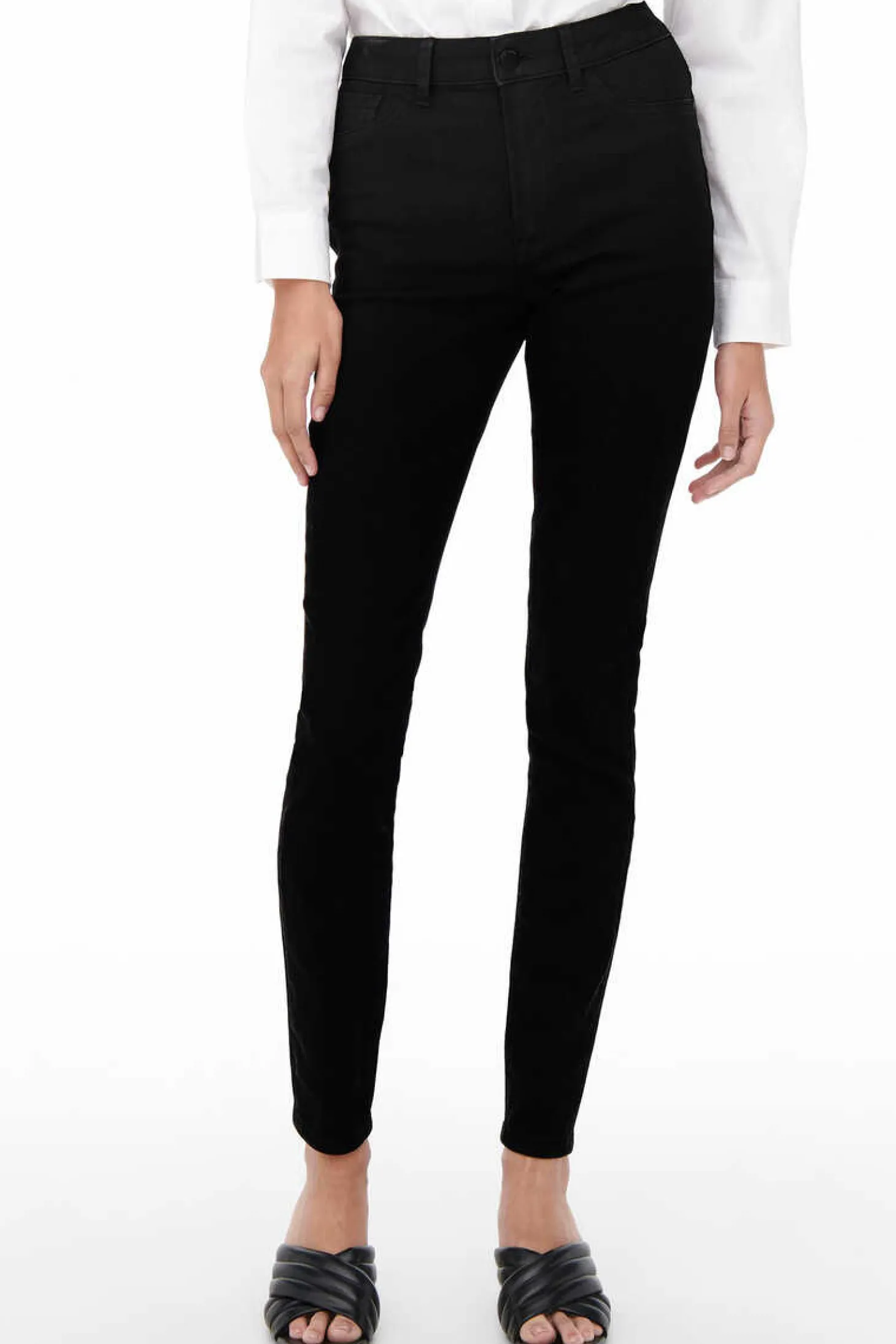 Jeans Skinny Em Preto De Cintura Subida Com Cinco Bolsos, Fecho Mediante Botao E Cintura Com Presilhas.