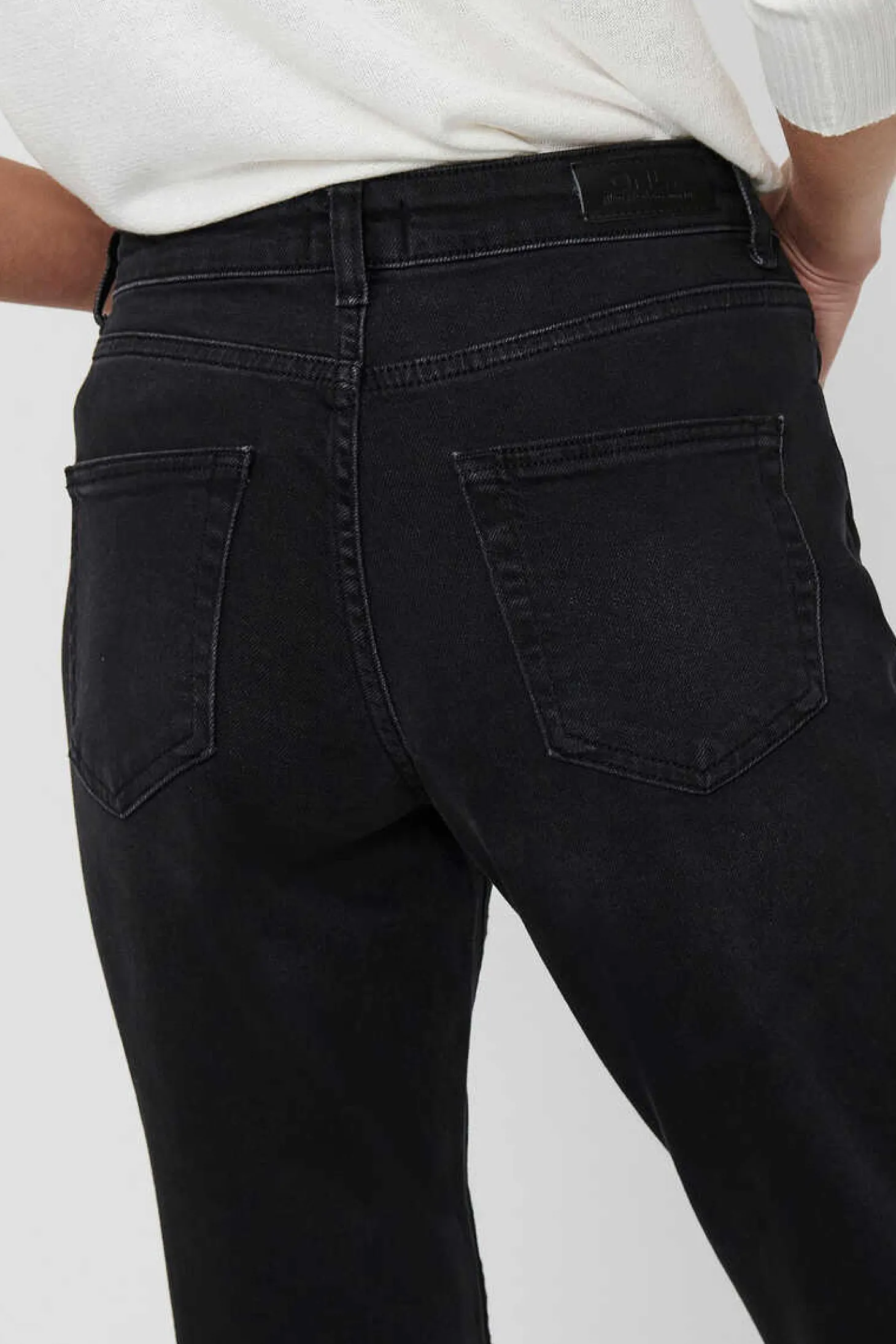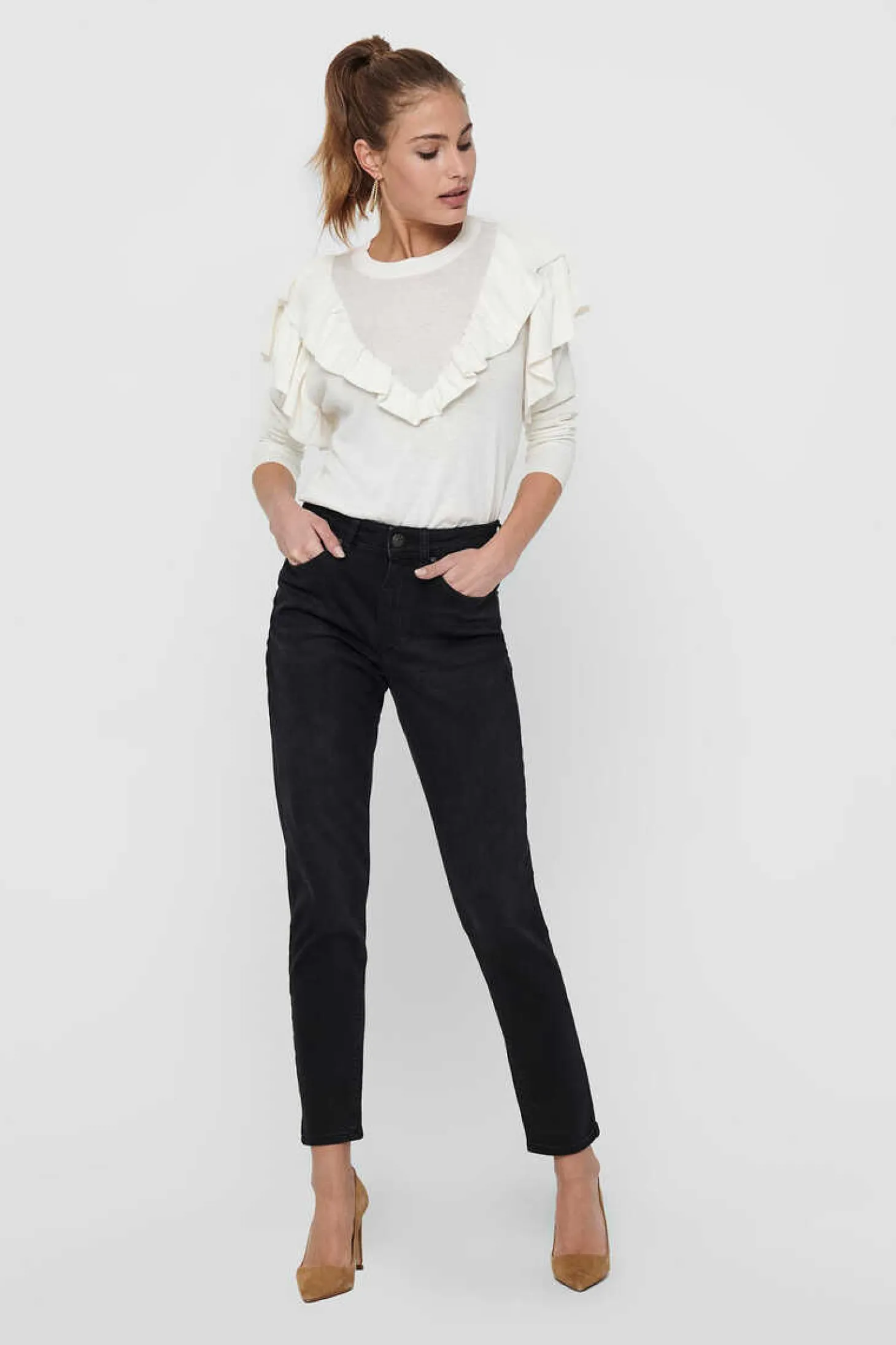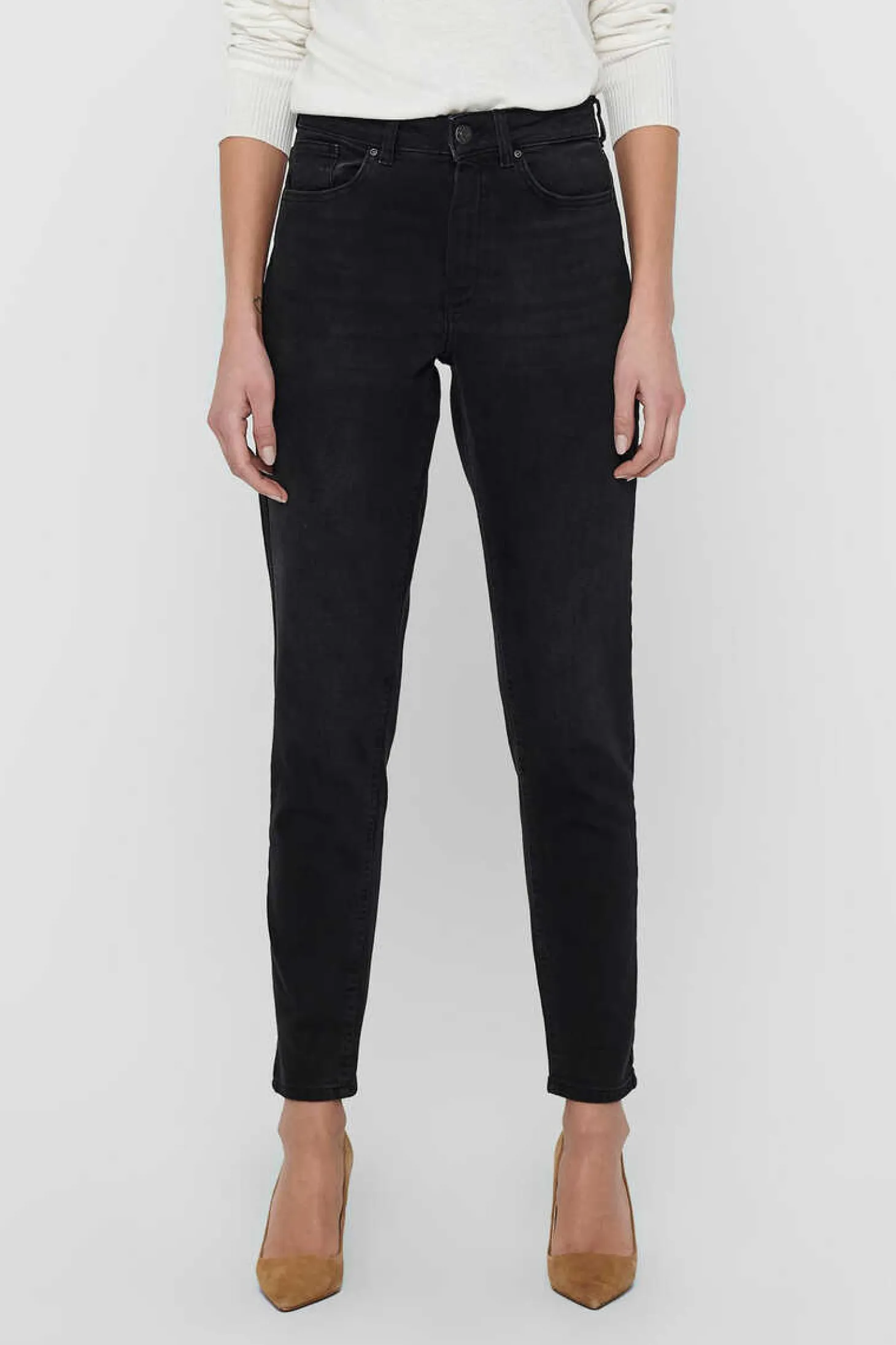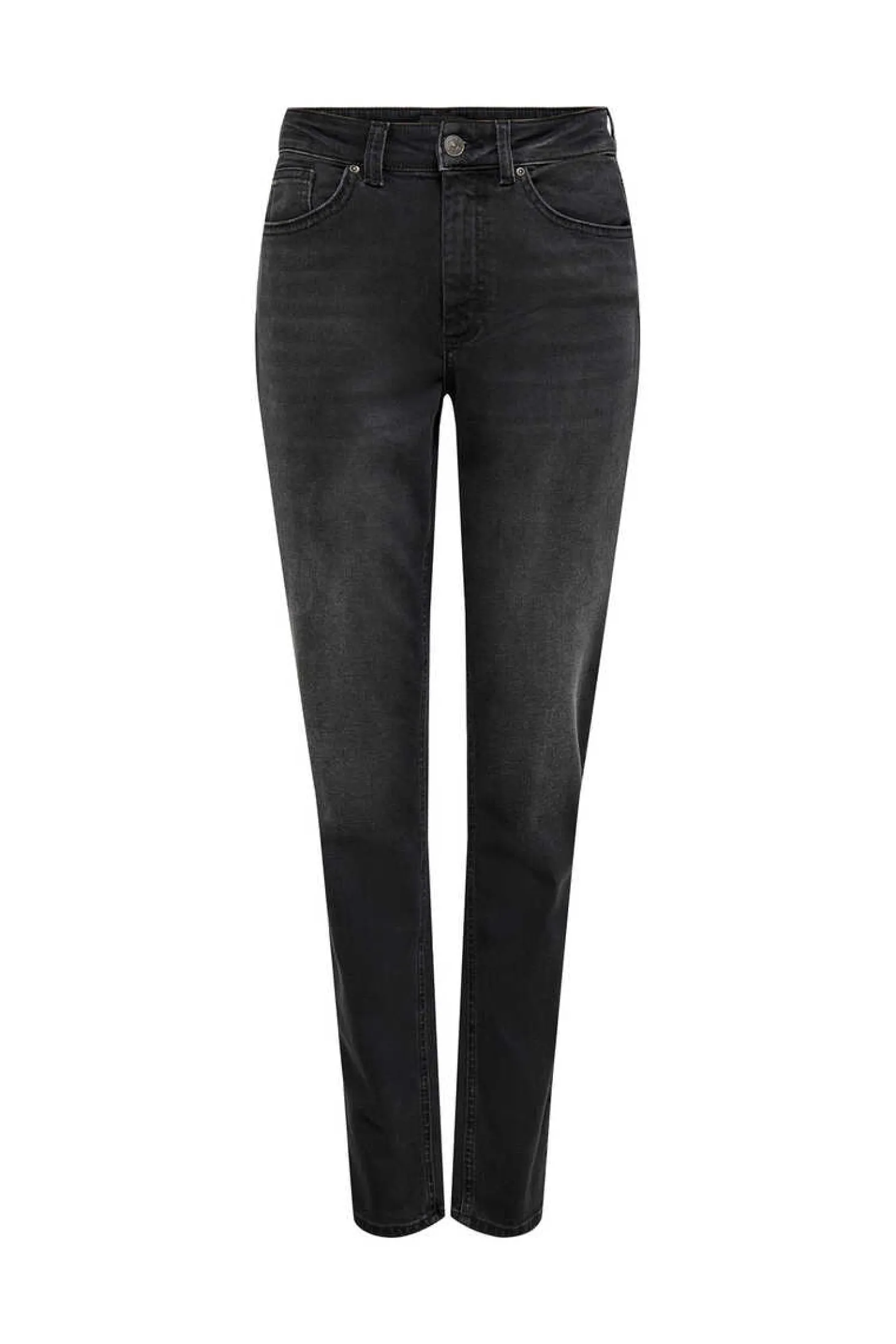 Jeans De Corte Reto, Cintura Subida E 5 Bolsos.