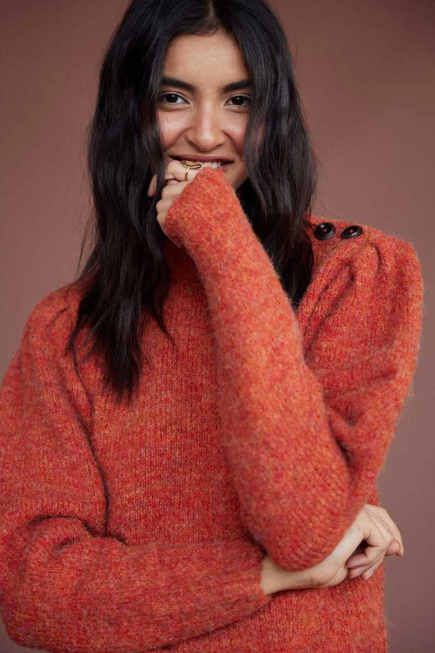 Jersey De Punto Liso Efecto Vigore Con Hilatura Sostenible. Manga Globo Larga. Cuello Caja. Acabados Acanalados. Botones Funcionales En Hombro.