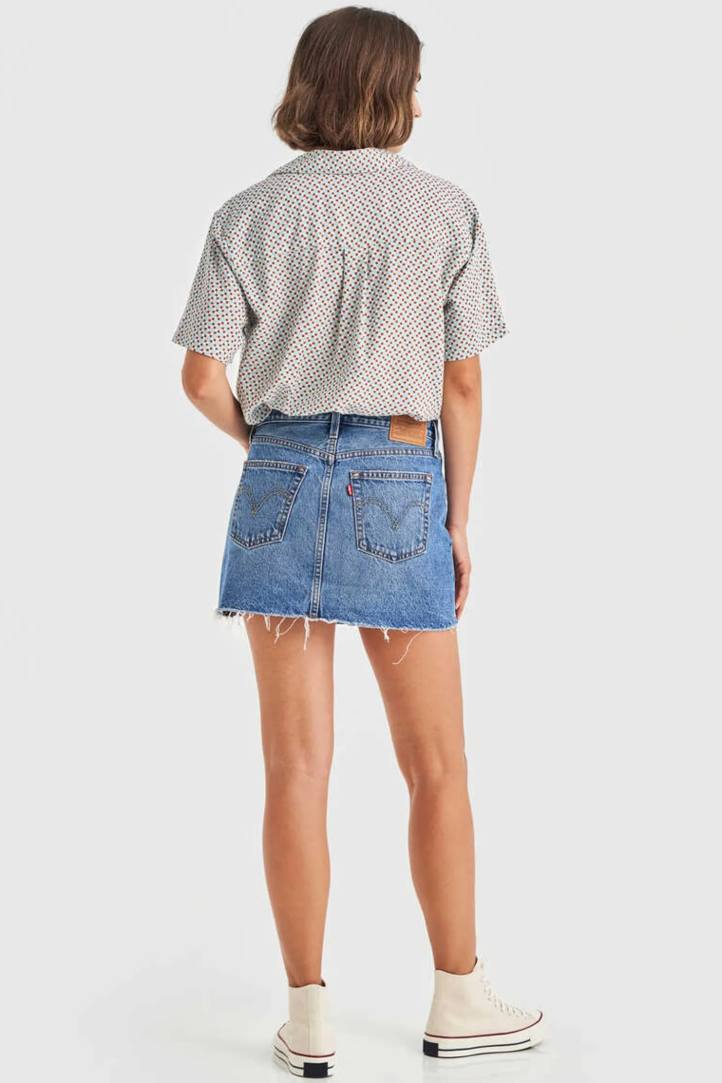 Short, Mid-Rise Denim Skirt With Frayed Hem And Rips, Button And Zip Fastening.
