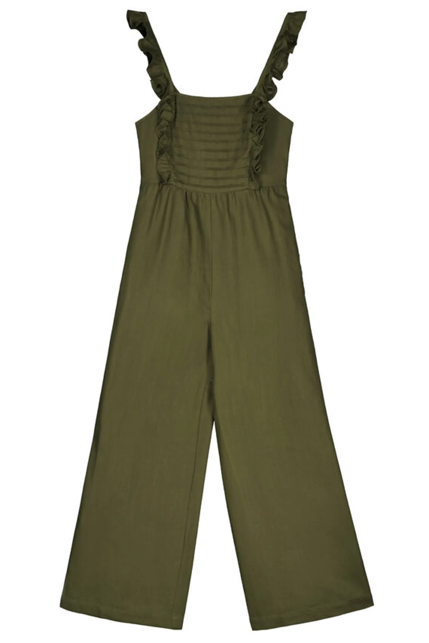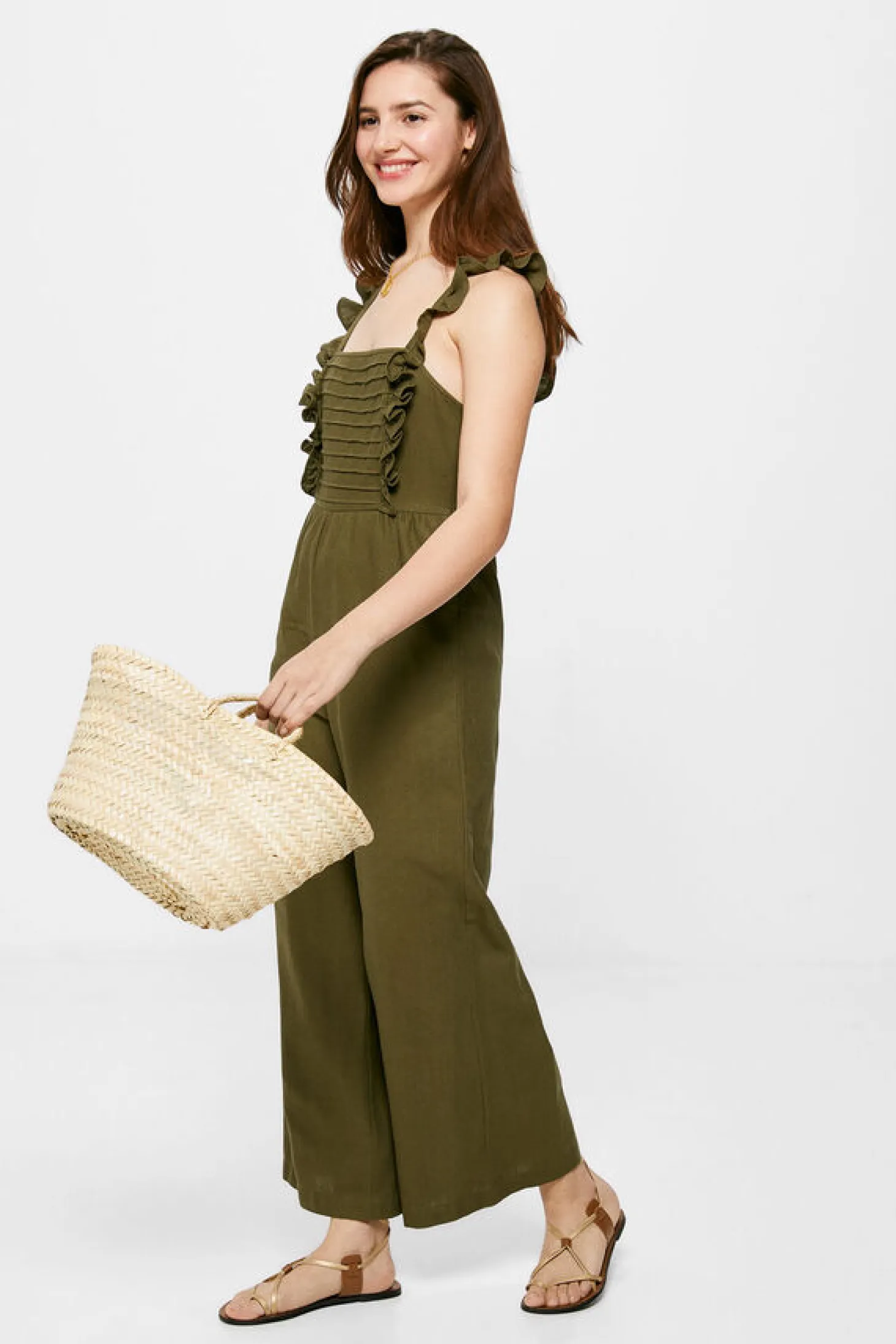 Macacao De Alcas Com Folhos, Com Decote Quadrado Na Frente E Nas Costas, Com Detalhe De Plissados Na Frente, Borracha Na Cintura, Fecho-Eclair Invisivel E Com P … Erna Larga Com Comprimento Pelo Tornozelo.Ver Mais