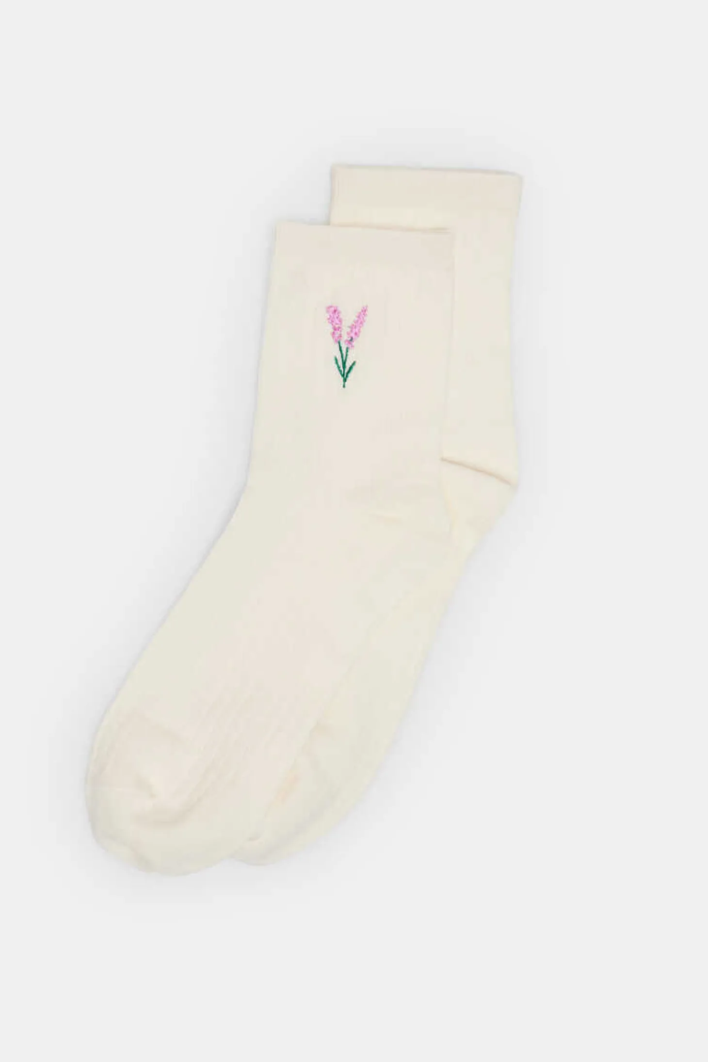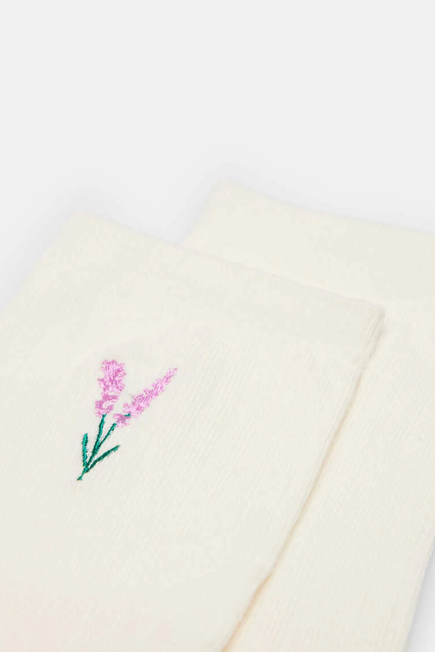 Meia Comprida Lisa Com Canelado, Com Detalhe De Flor De Alfazema Bordada Na Lateral.