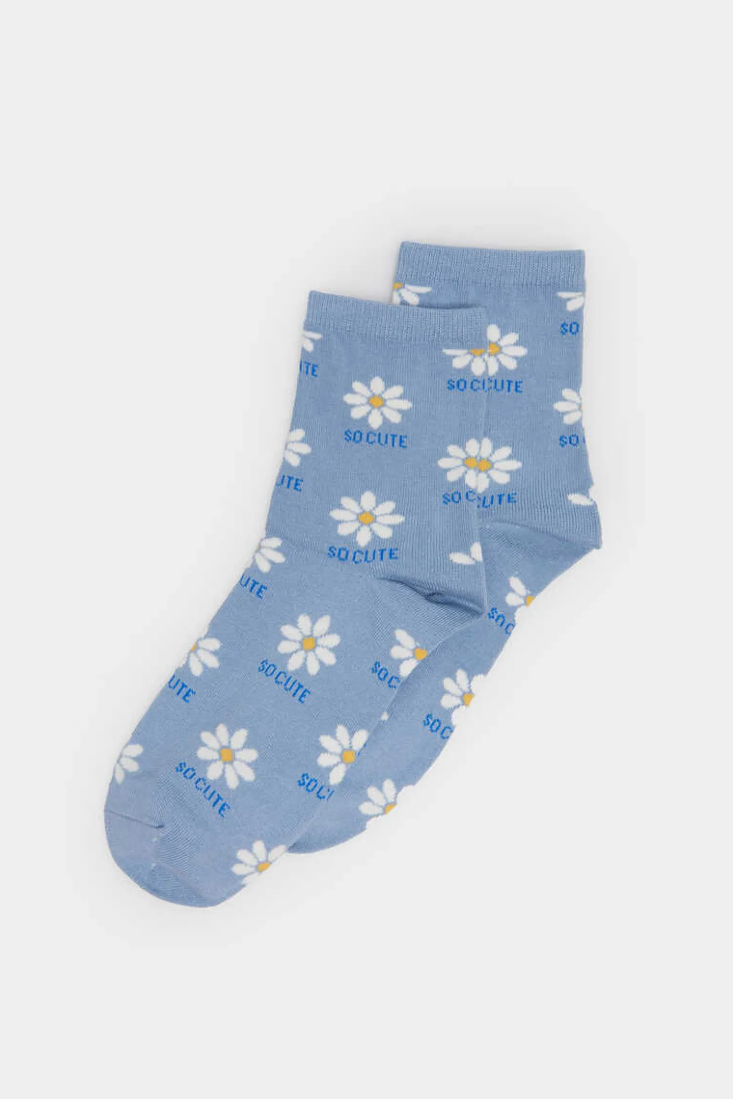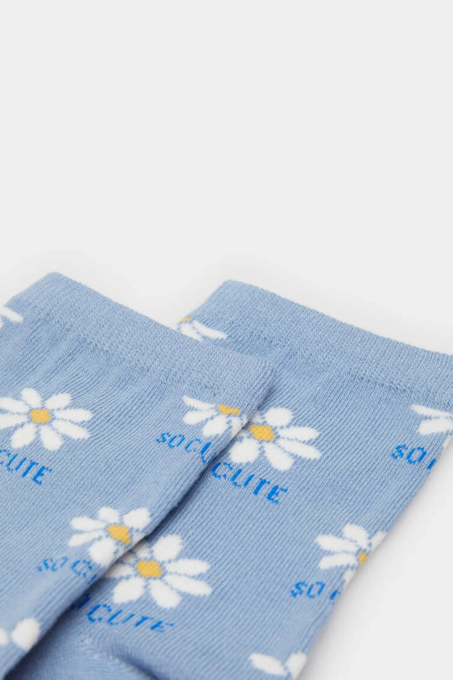 Meia Comprida, Com Desenho De Margaridas Com Texto E Com Biqueira, Calcanhar E Cano Lisos.