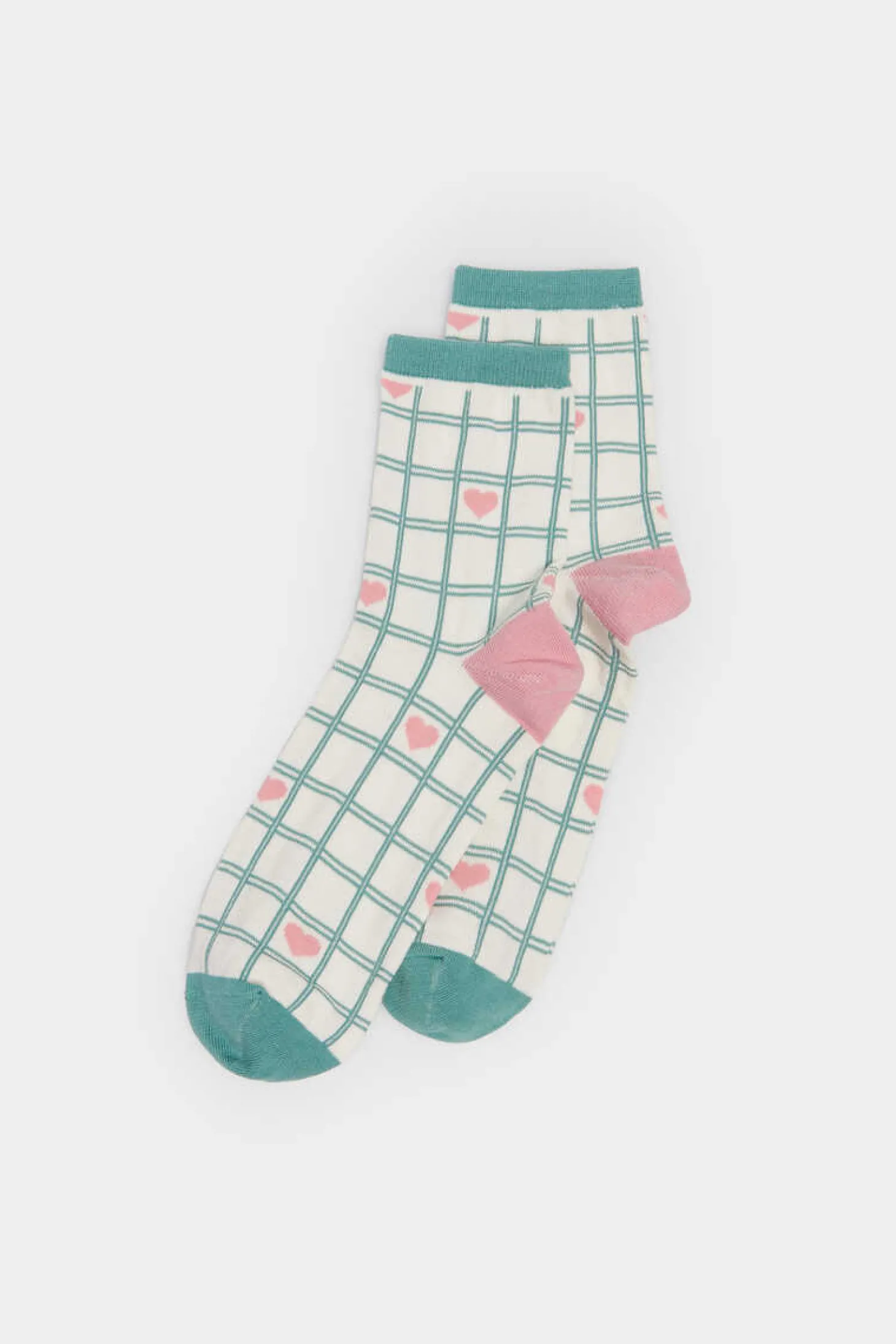 Meia Comprida, Com Desenho De Quadros Com Coracoes No Interior, Com Biqueira, Calcanhar E Canos Com Contraste De Cores.
