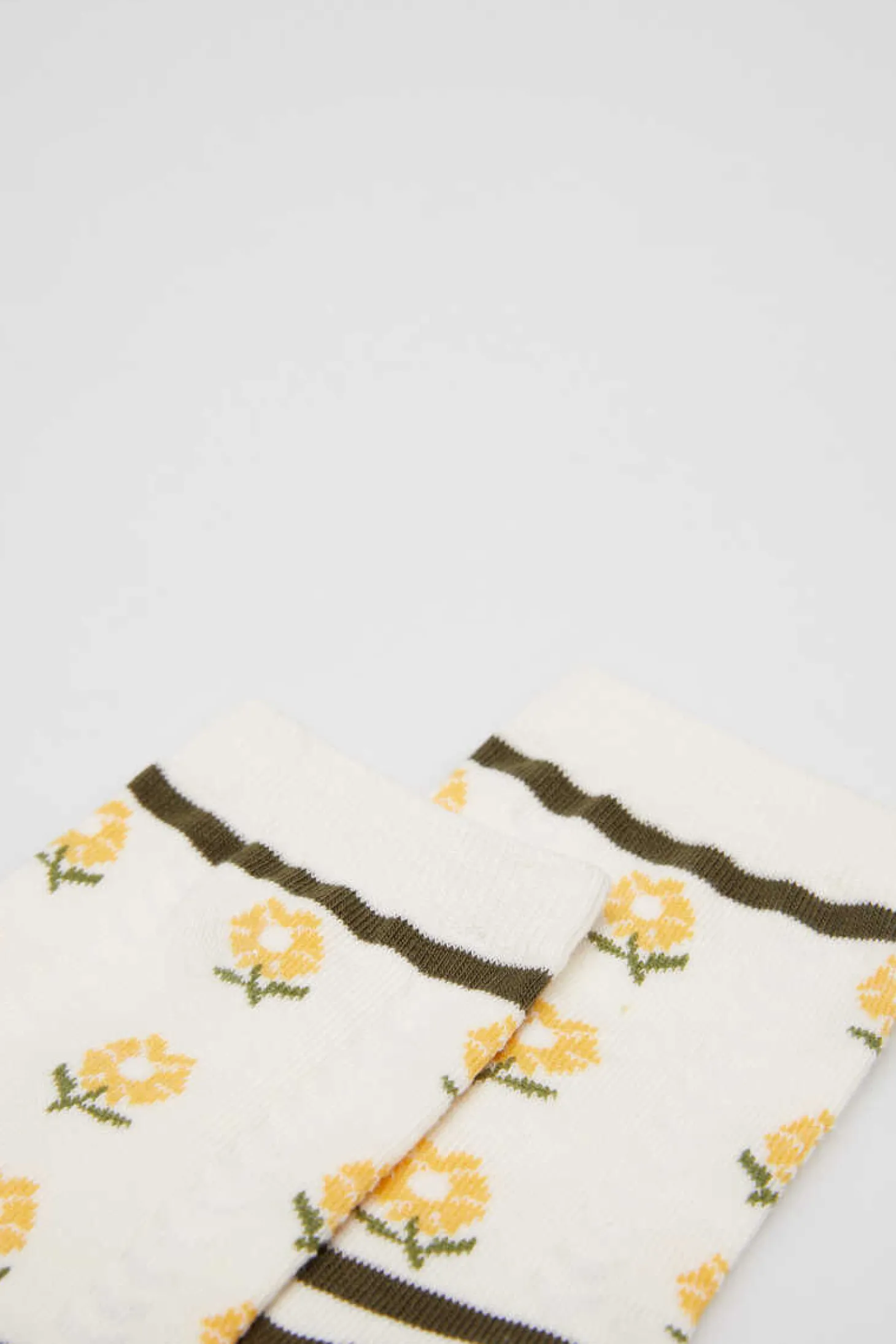 Meia Comprida, Com Faixas E Com Desenho De Girassois Na Parte Superior, Com Contraste De Cores.