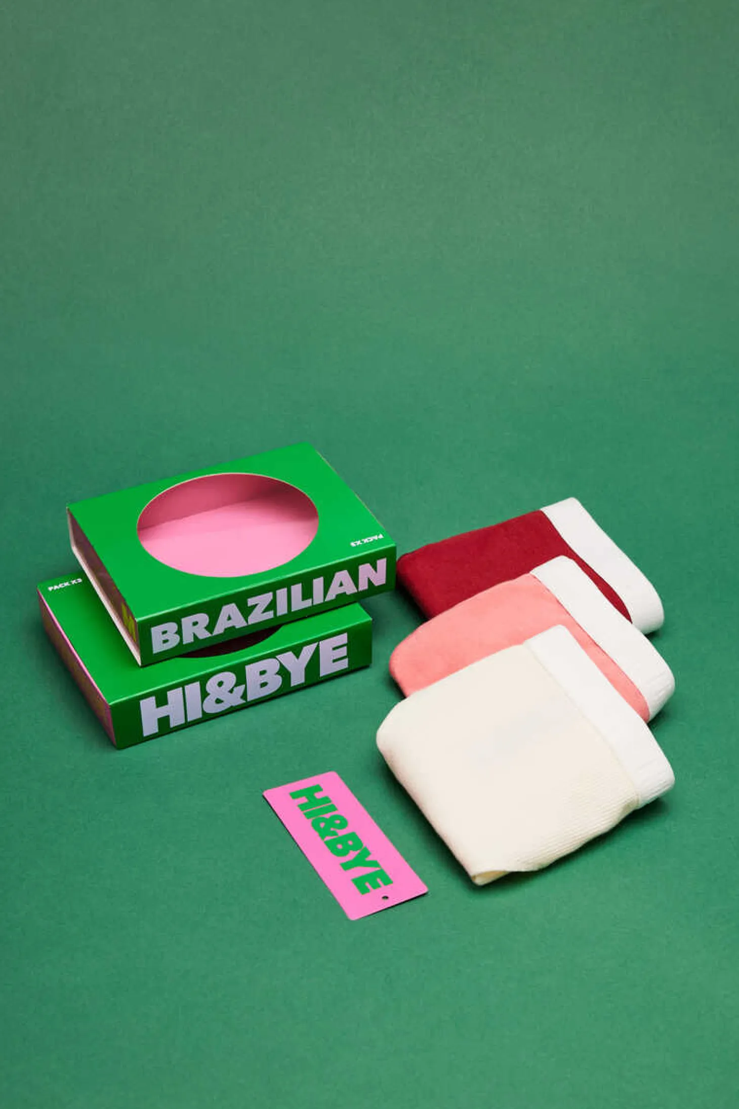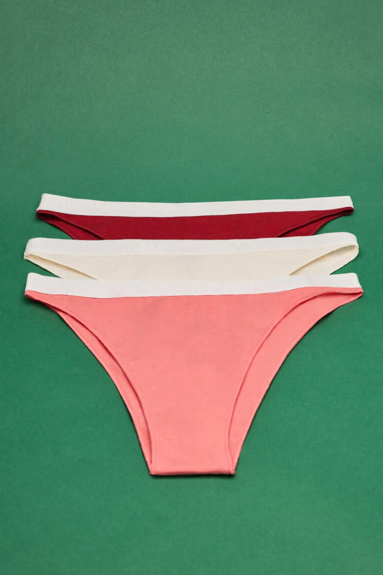 Pack De 3 Cuequinhas Brasileiras De Algodao. Cada Uma E De Uma Cor (Rosa, Amarelo, Bordeaux), As Cuecas Do Meio Sao Confecionadas Em Tecido Canelado E As Outras … Duas Sao Lisas.
