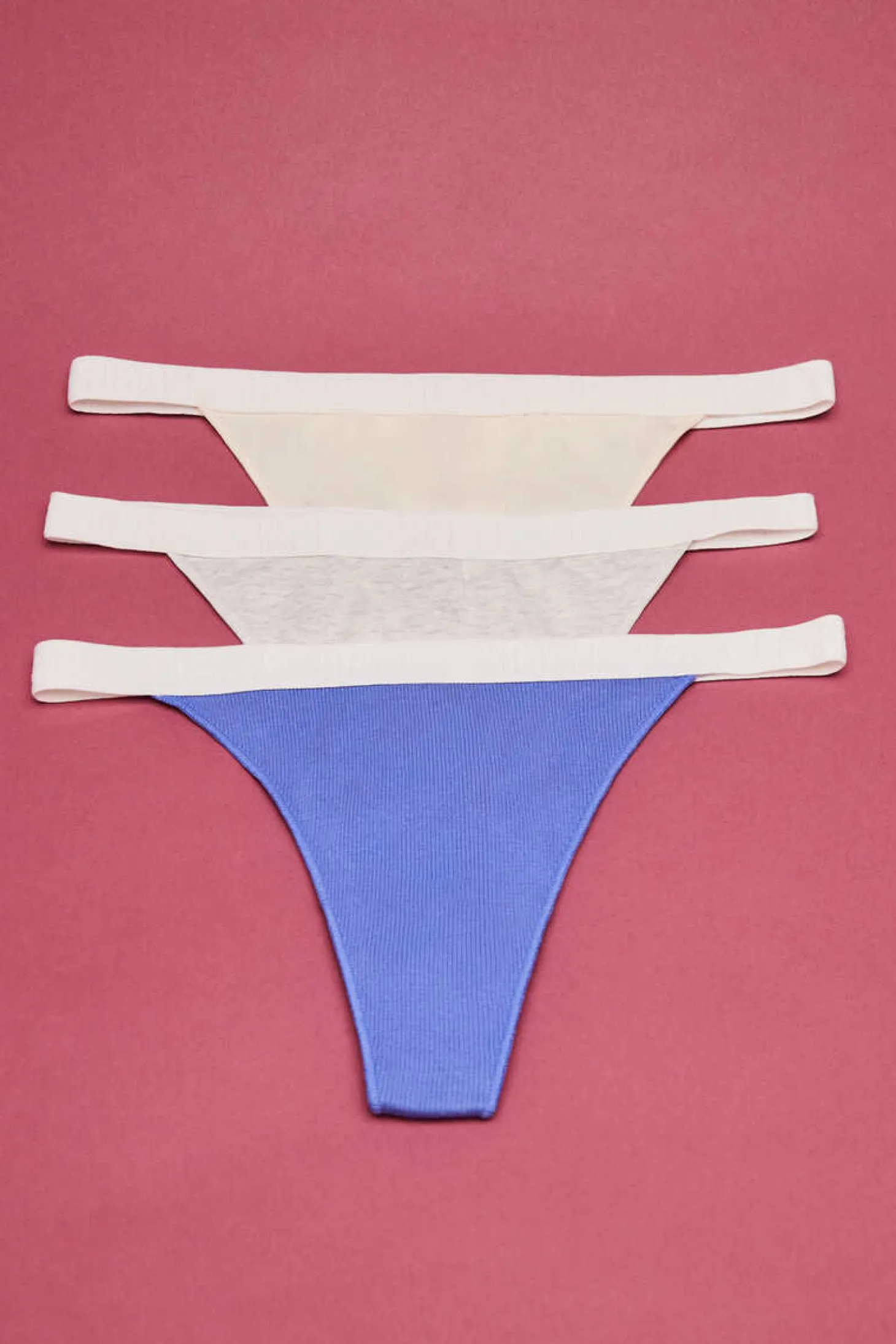 Pack De 3 Cuecas Tanga De Algodao. Cada Uma E De Uma Cor (Amarelo, Lilas-Escuro E Cinzento Melange), As Cuecas Do Meio Sao Confecionadas Em Tecido Canelado E As … Outras Duas Sao Lisas.