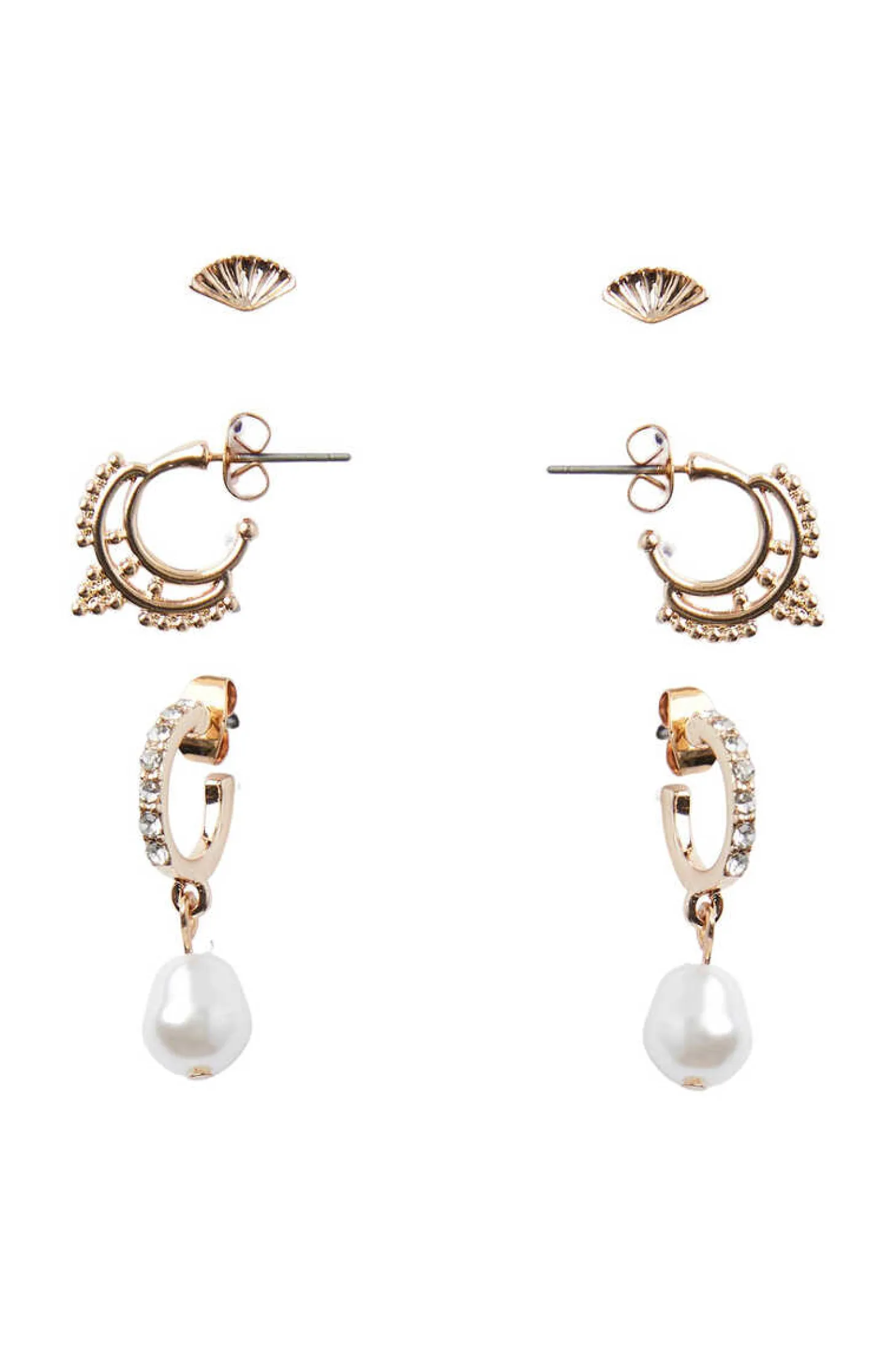 Paquete De Tres Pendientes Plateados. Pendiente Con Forma De Concha; Semi Aro Con Tuerca Y En Forma De Aro Con Perla.
