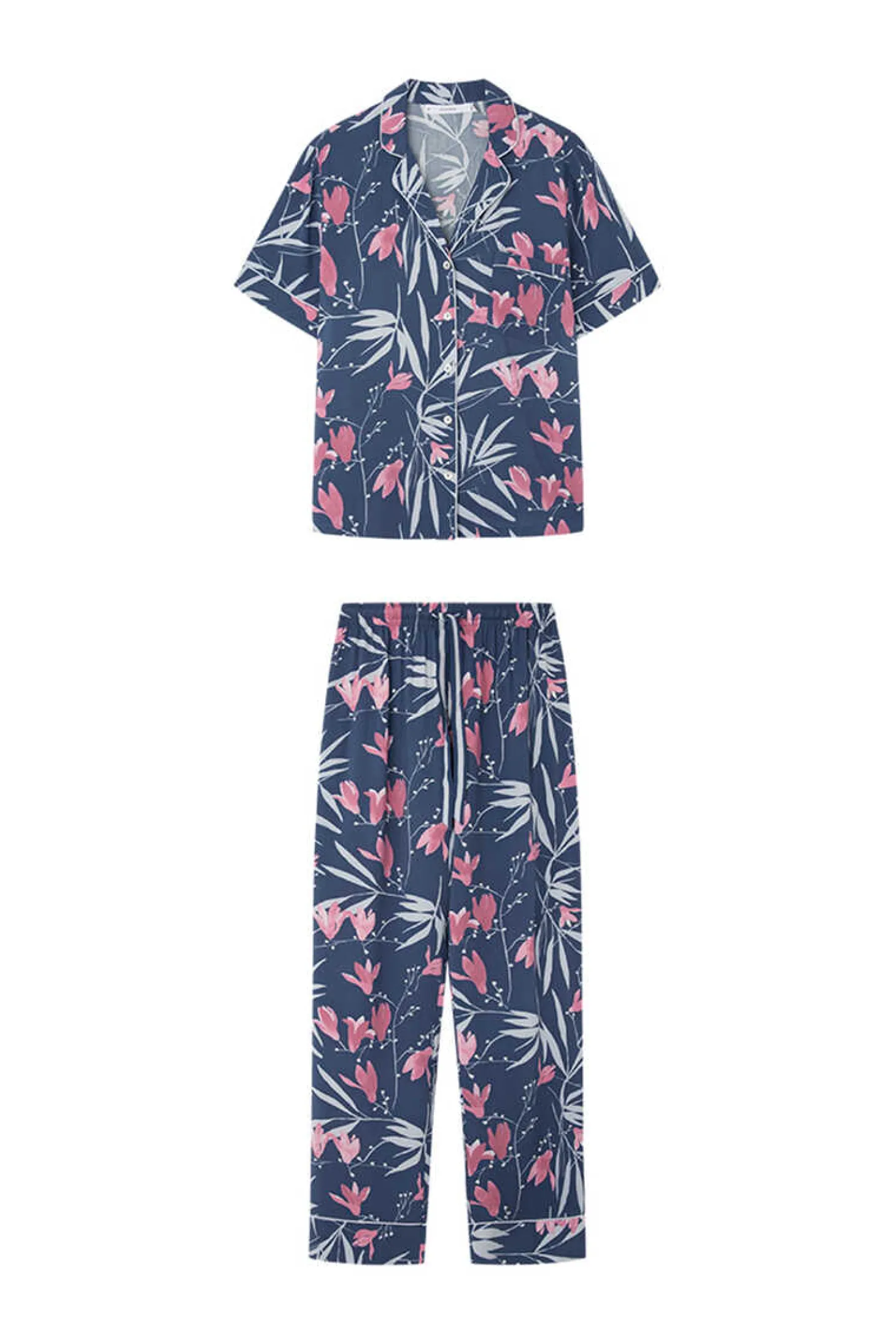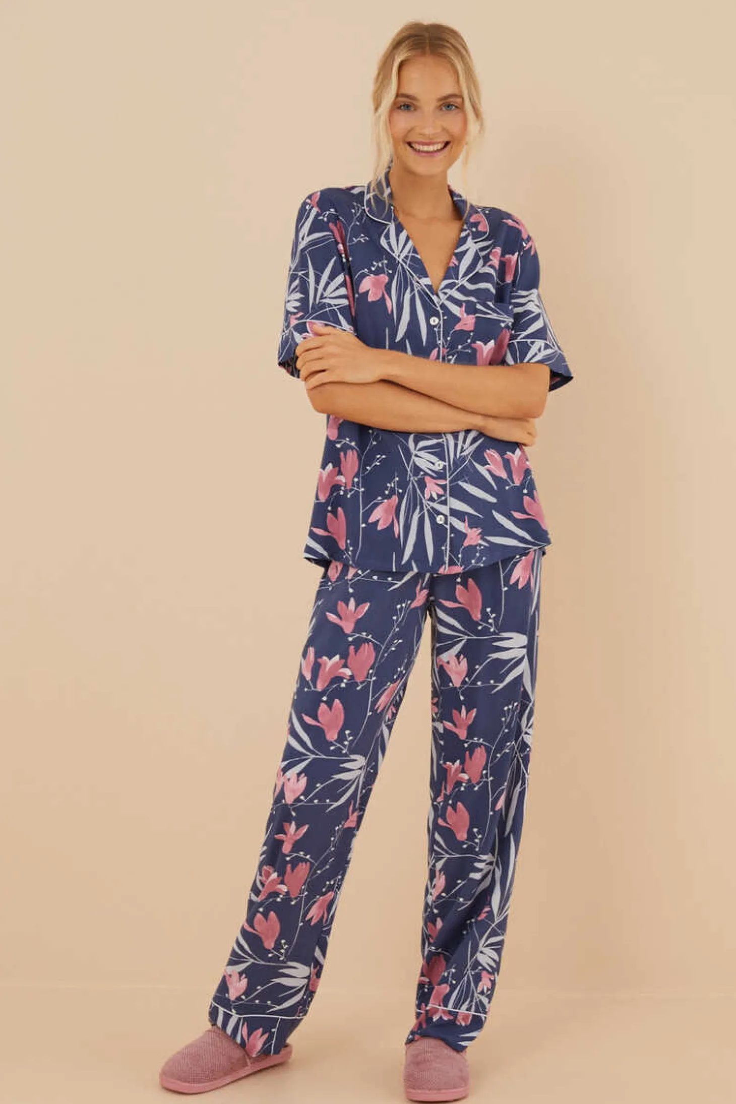 Pijama Camiseiro De Manga Curta E Calcas, Com Maravilhoso Estampado De Flores, Confecionado Em Suave Tecido De Viscose. Top Com Gola De Lapela Com Detalhe De De … Bruns, Bolso A Frente E Botoes De Nacar. Calcas Com Cos Elastico Ajustavel Com Fita Com Tons Em Contraste.