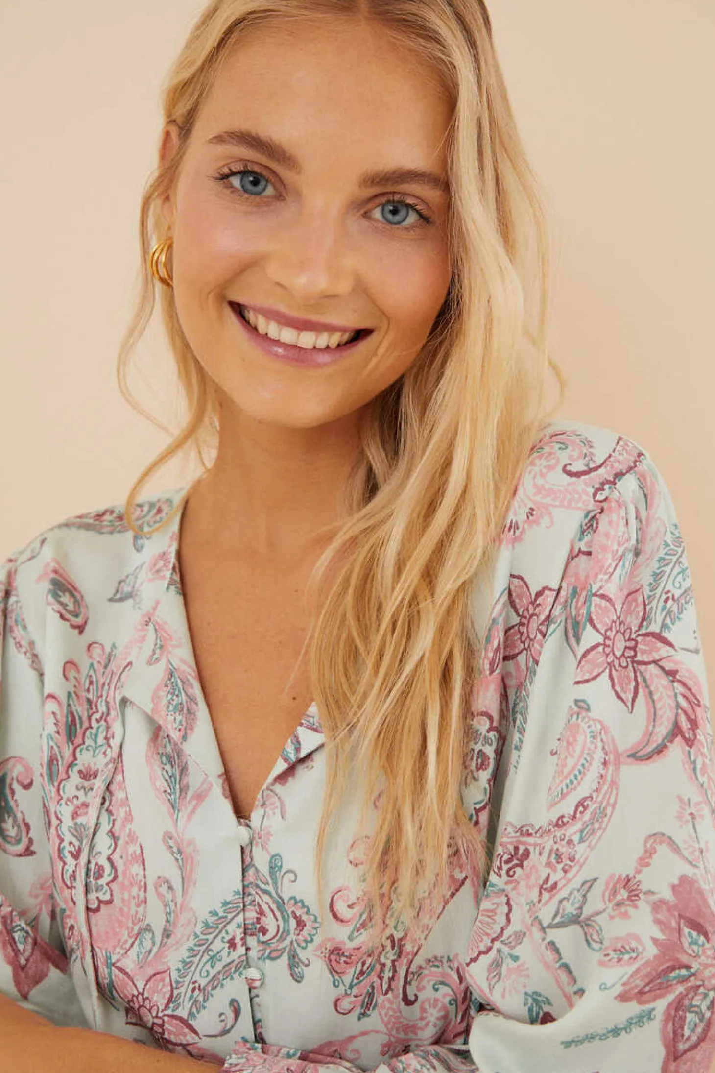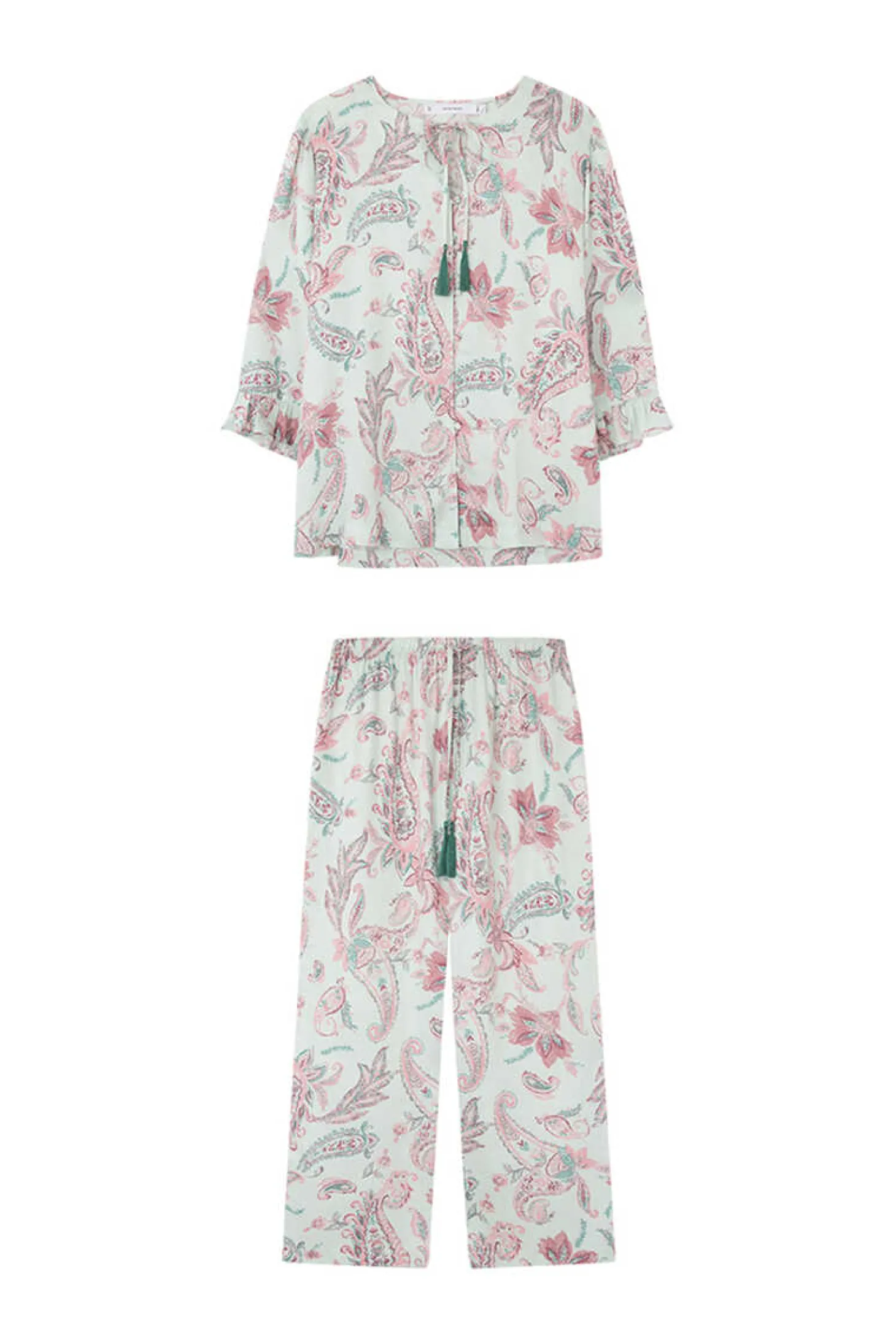 Pijama De Manga Curta E Calcas De Comprimento Capri Com Estampado Paisley E De Flores, Confecionado Em Tecido De Viscose De Cetim. Ideal Para Dormir Super Comod … A E Estar Em Casa Sem Perder Nem Um Pouco De Estilo.