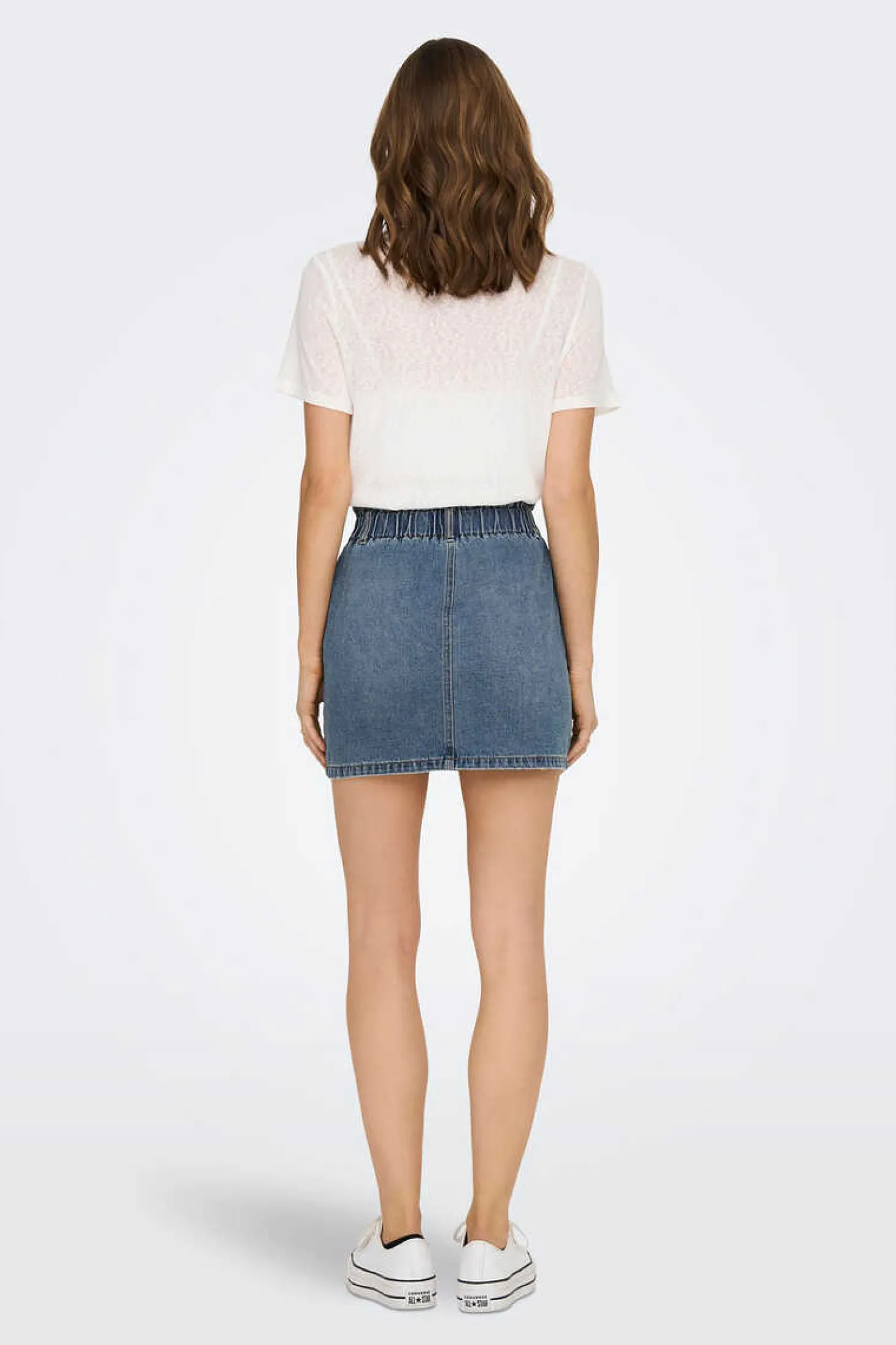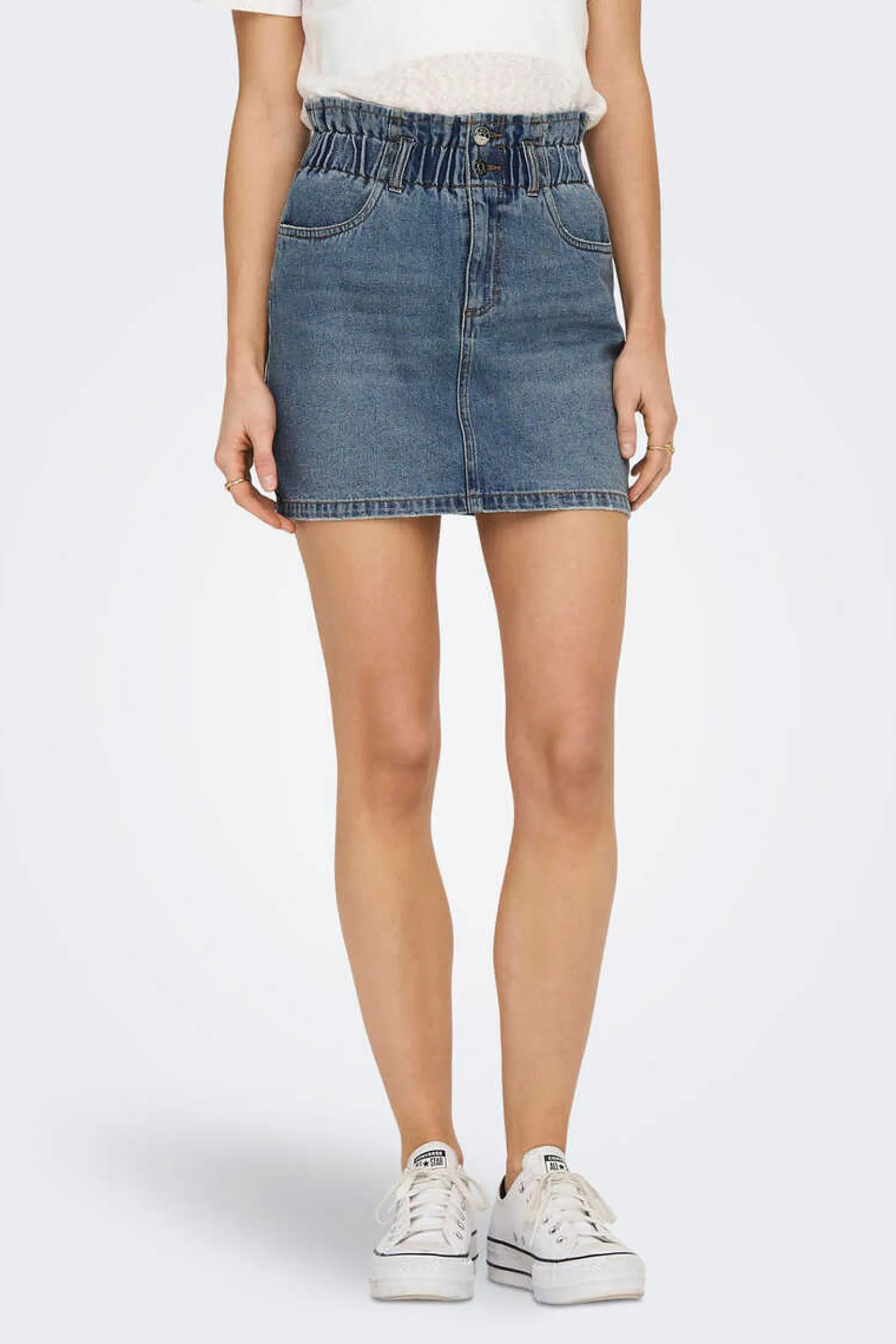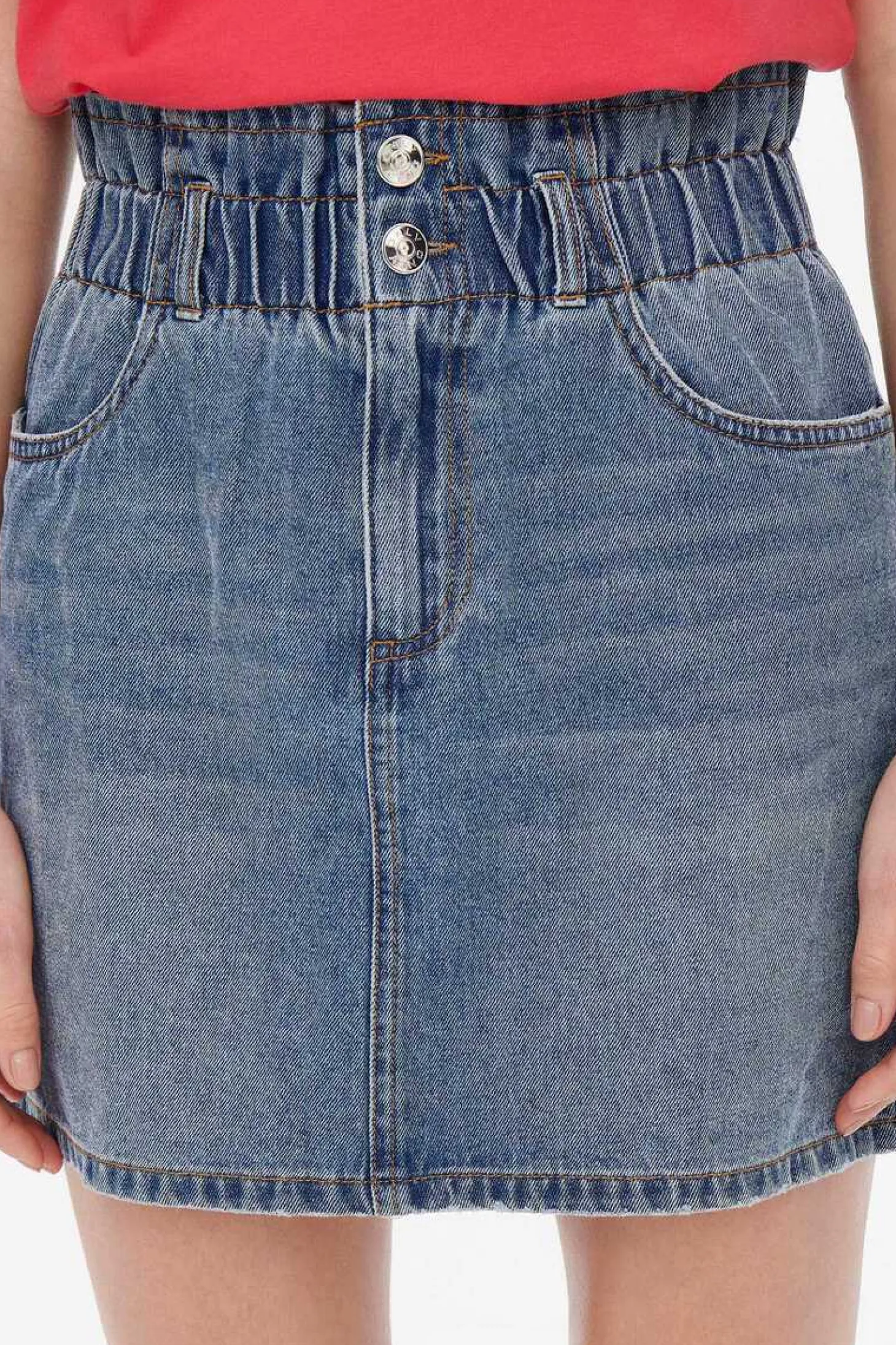Saia Curta De Ganga Com Cintura Alta Franzida, Dois Bolsos E Fecho Com Botoes.