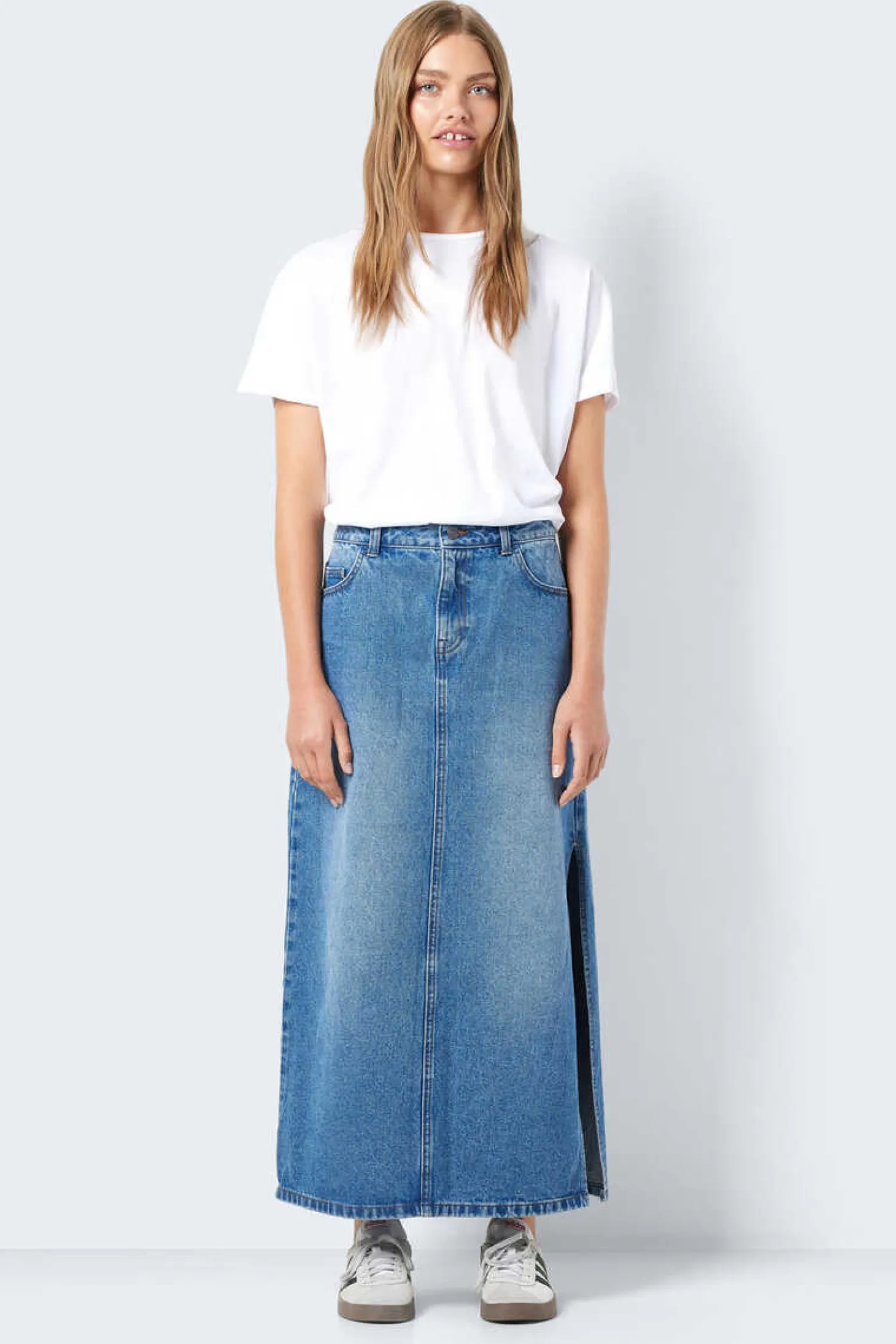 Saia Midi Denim Com Abertura Lateral E Bolsos Na Parte Traseira.