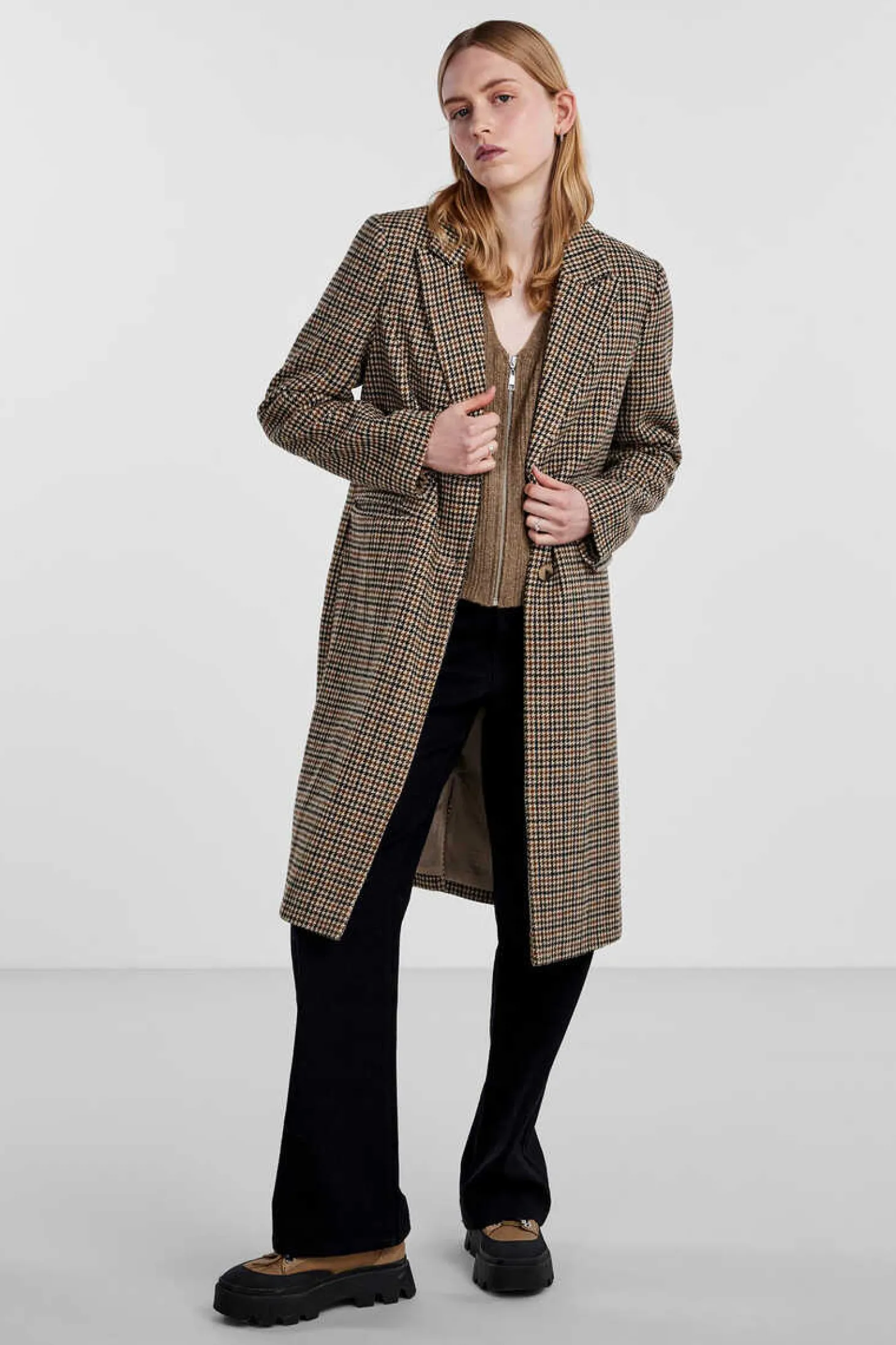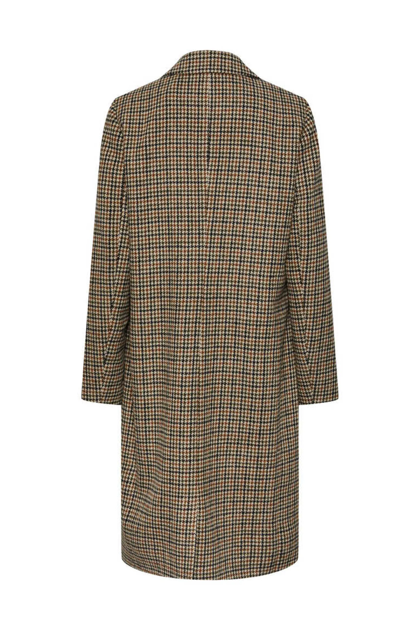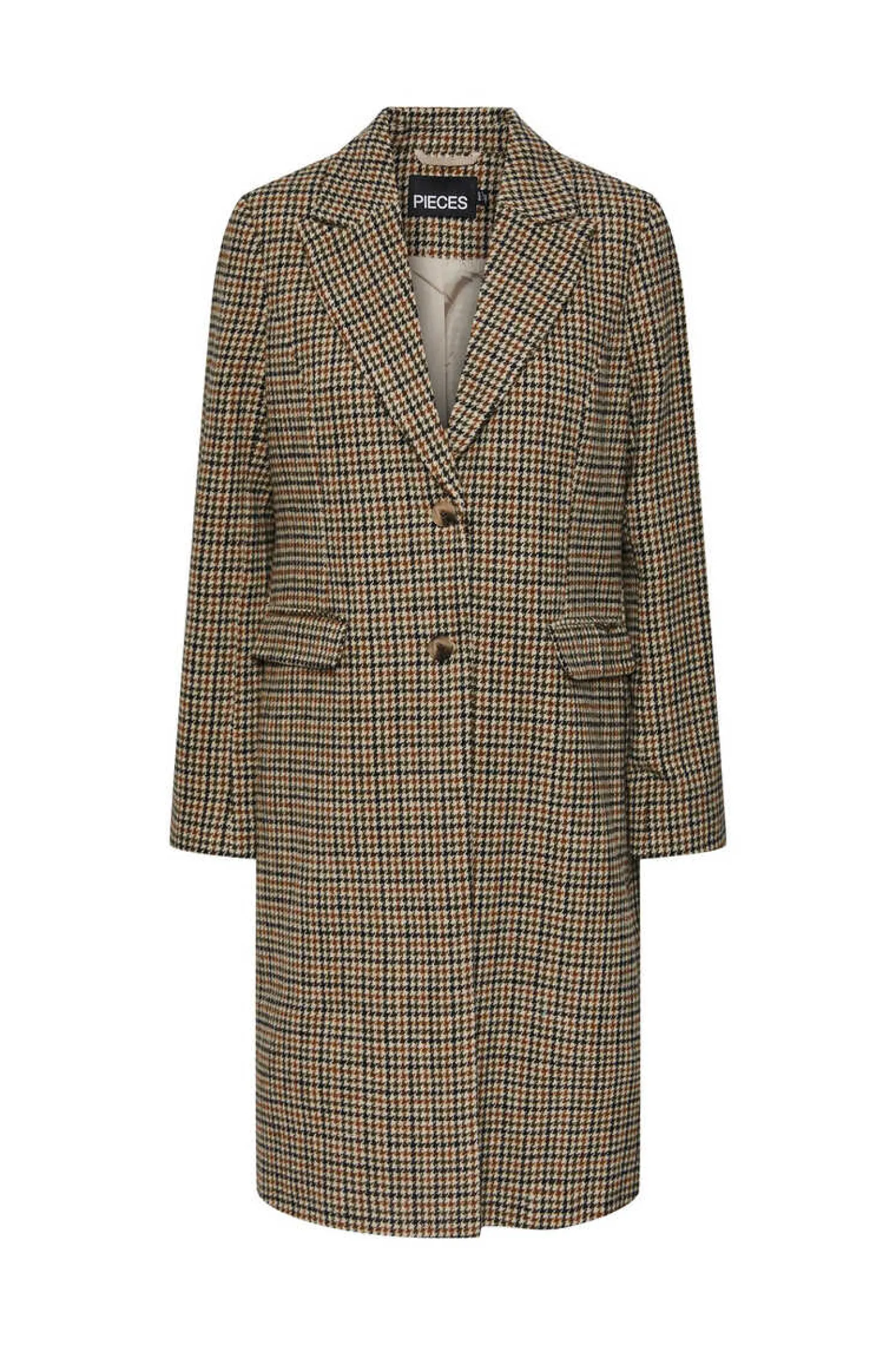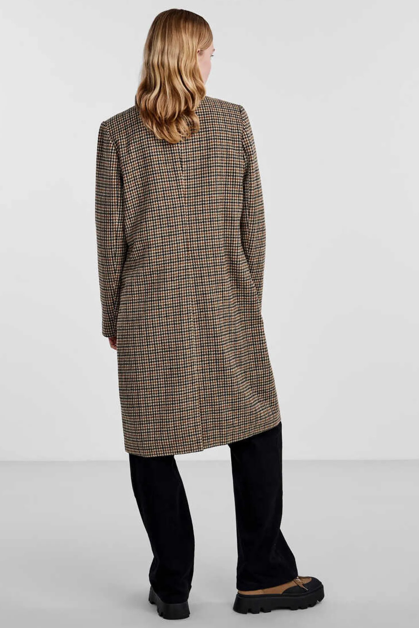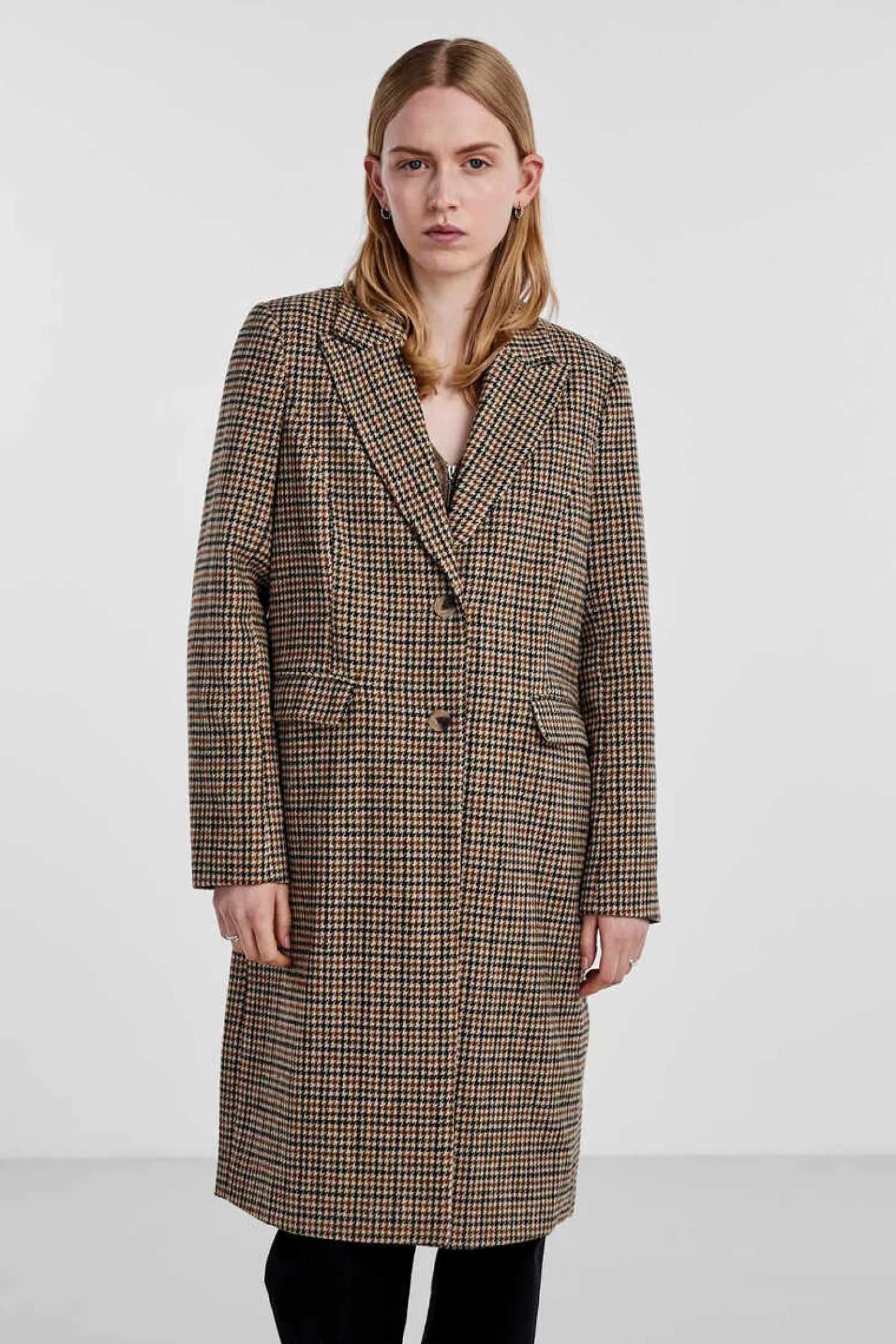 Sobretudo Midi Reto Com Gola De Lapela E Fecho A Frente De Botoes. Dois Bolsos Laterais. Estampado De Quadrados.
